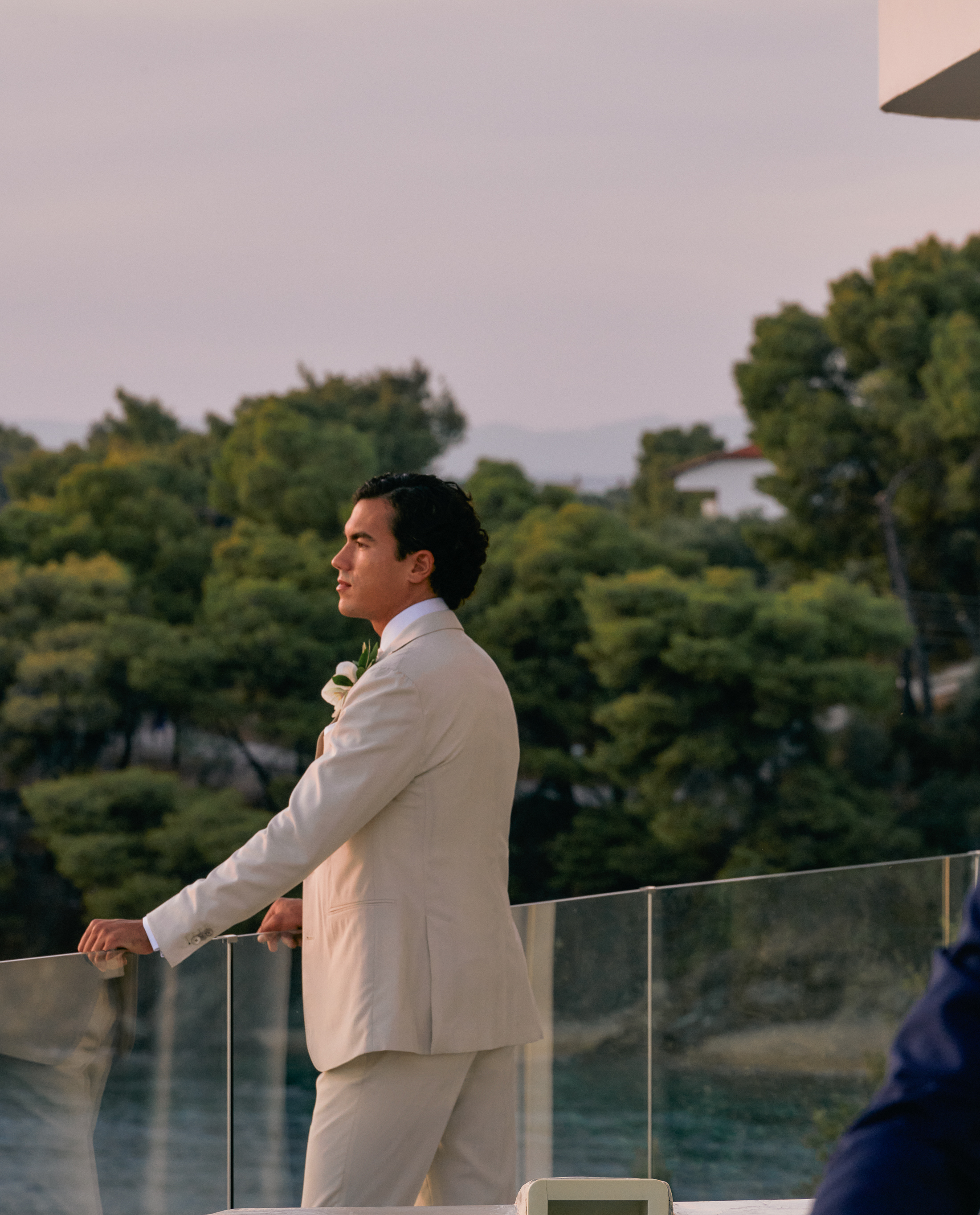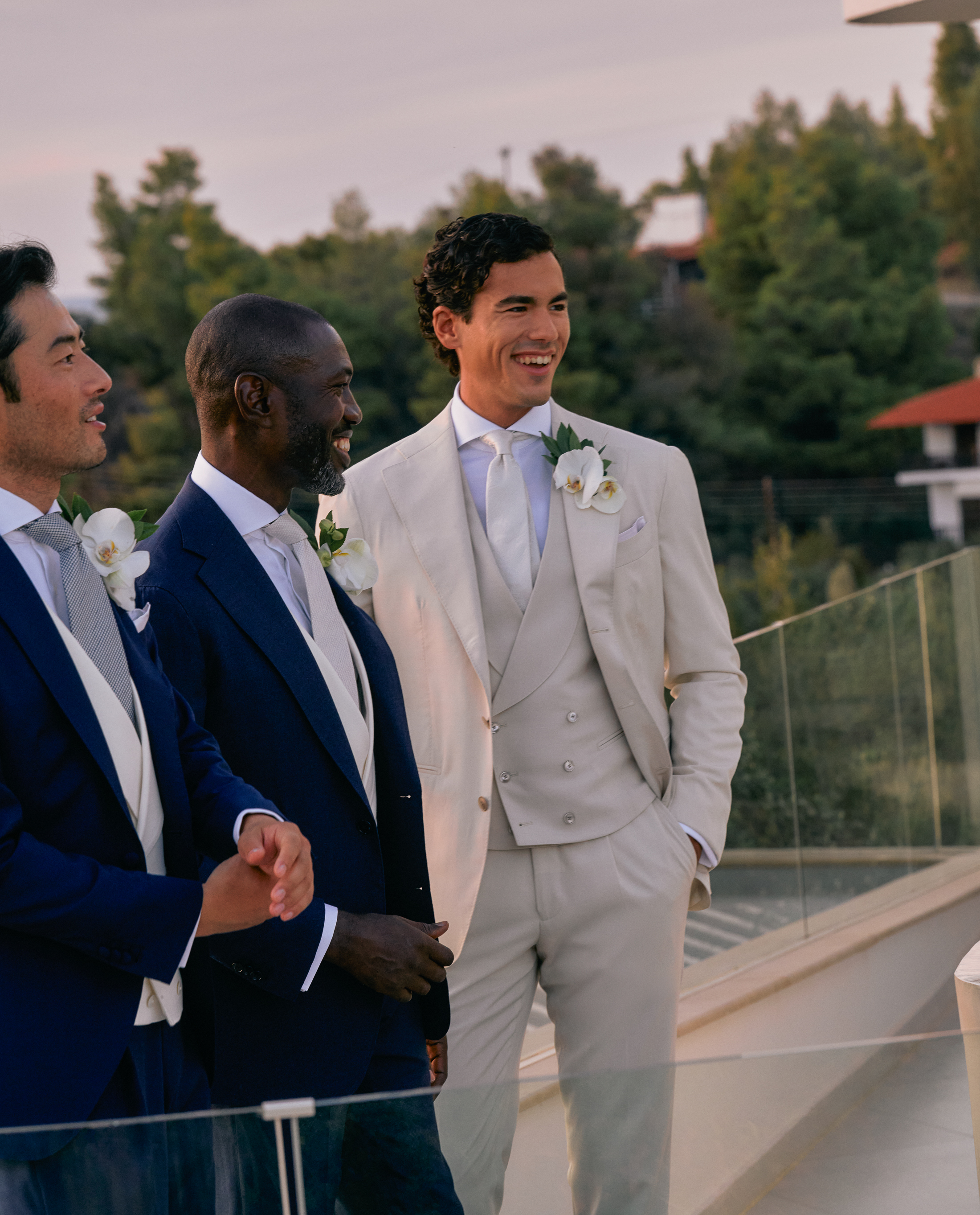 Crafted from soft, lightweight S130 wool in the standout shade of ivory, this Solaro herringbone with natural two-way stretch combines subtle radiance with premium comfort. Designed here as a full 3-piece suit with 2.5-button closure, wide notch lapels, and single-pleat trousers. Pair it with a matching white shirt and pocket square, white silk tie, and suede loafers to create an elegant, altar-ready look. Prefer a different style? Every piece is made exclusively for you, with your choice of design options. Soft S130 wool Solaro herringbone Natural bi-stretch Breathable Lightweight