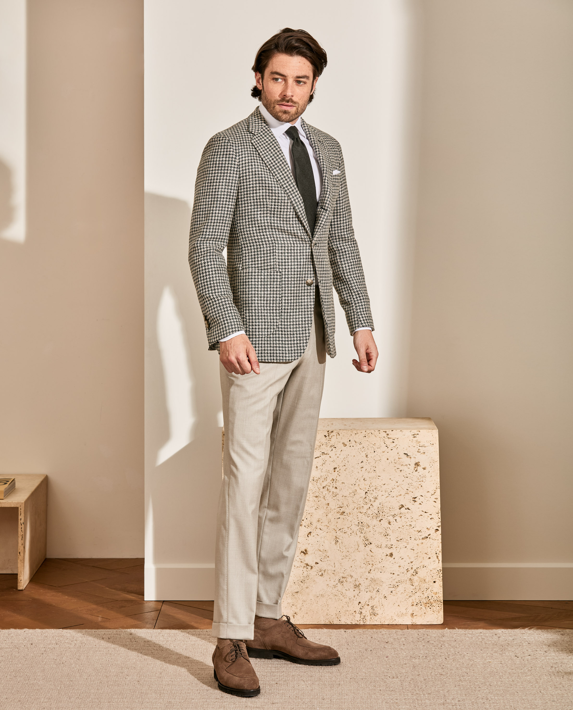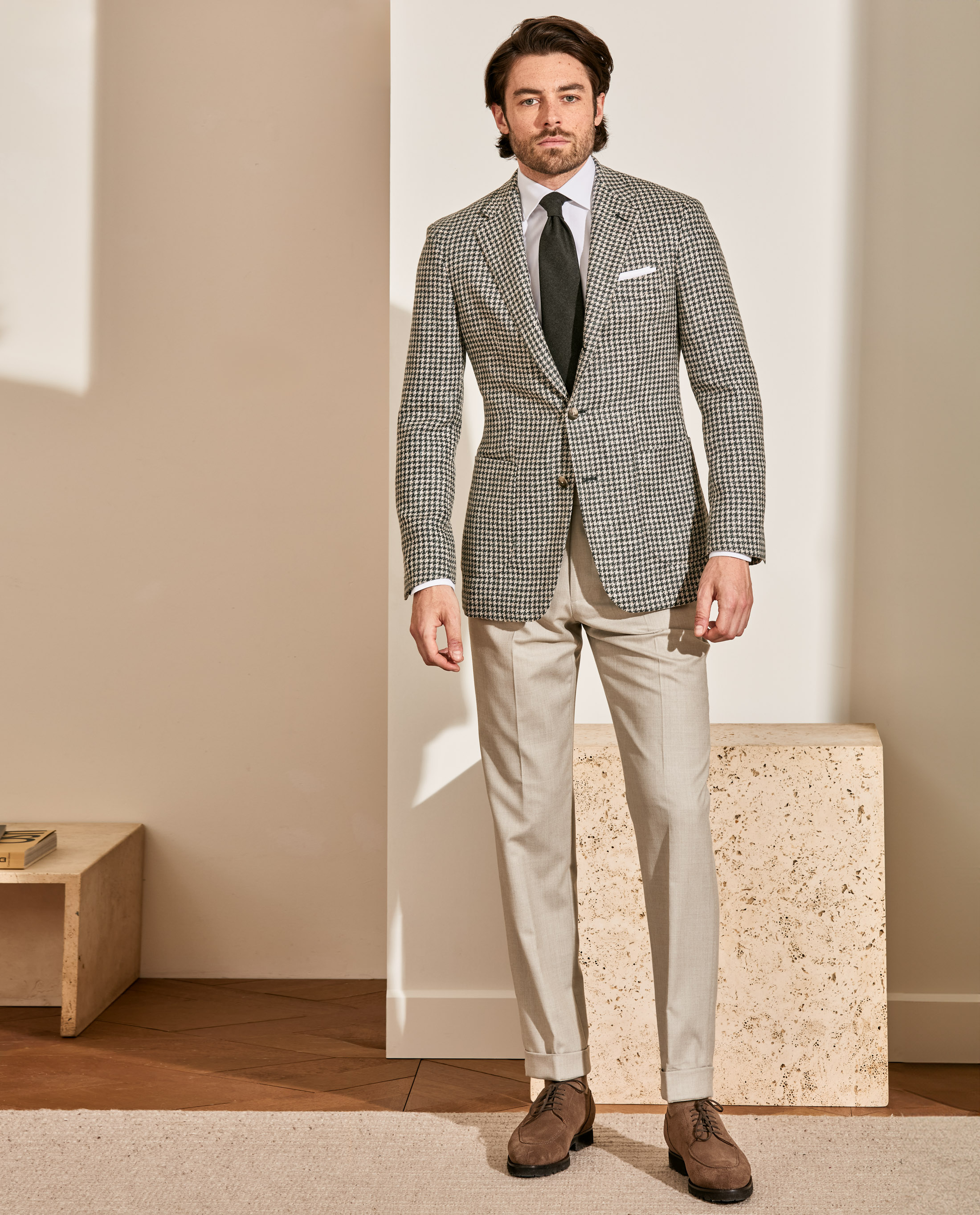Workplace-ready no matter the weather, this houndstooth jacket blends wool and alpaca with linen to ensure year-round versatility and impeccable style. Paired for nine-to-five comfort with a stretch cotton shirt, flannel tie, superfine wool trousers, and lightweight suede shoes.
