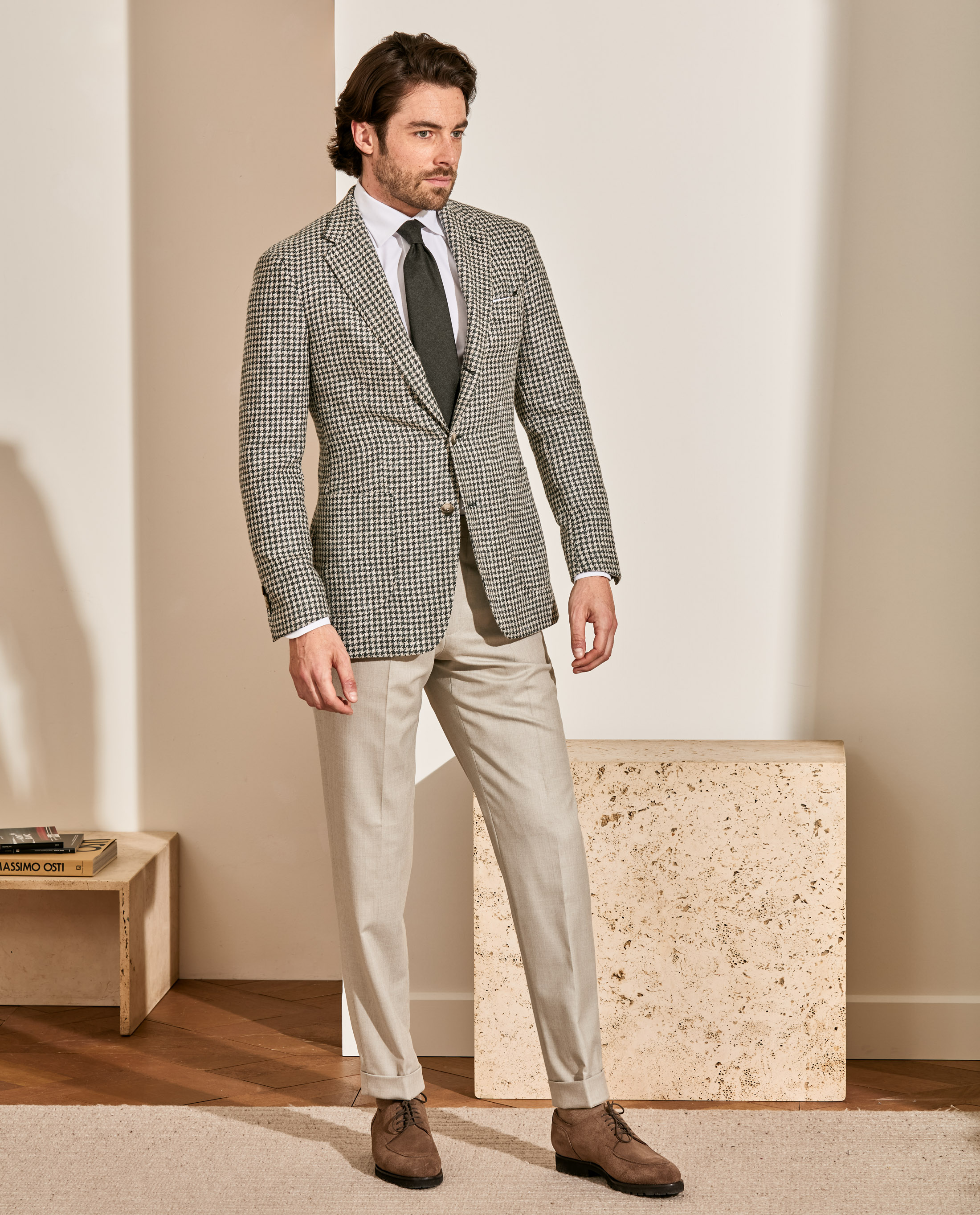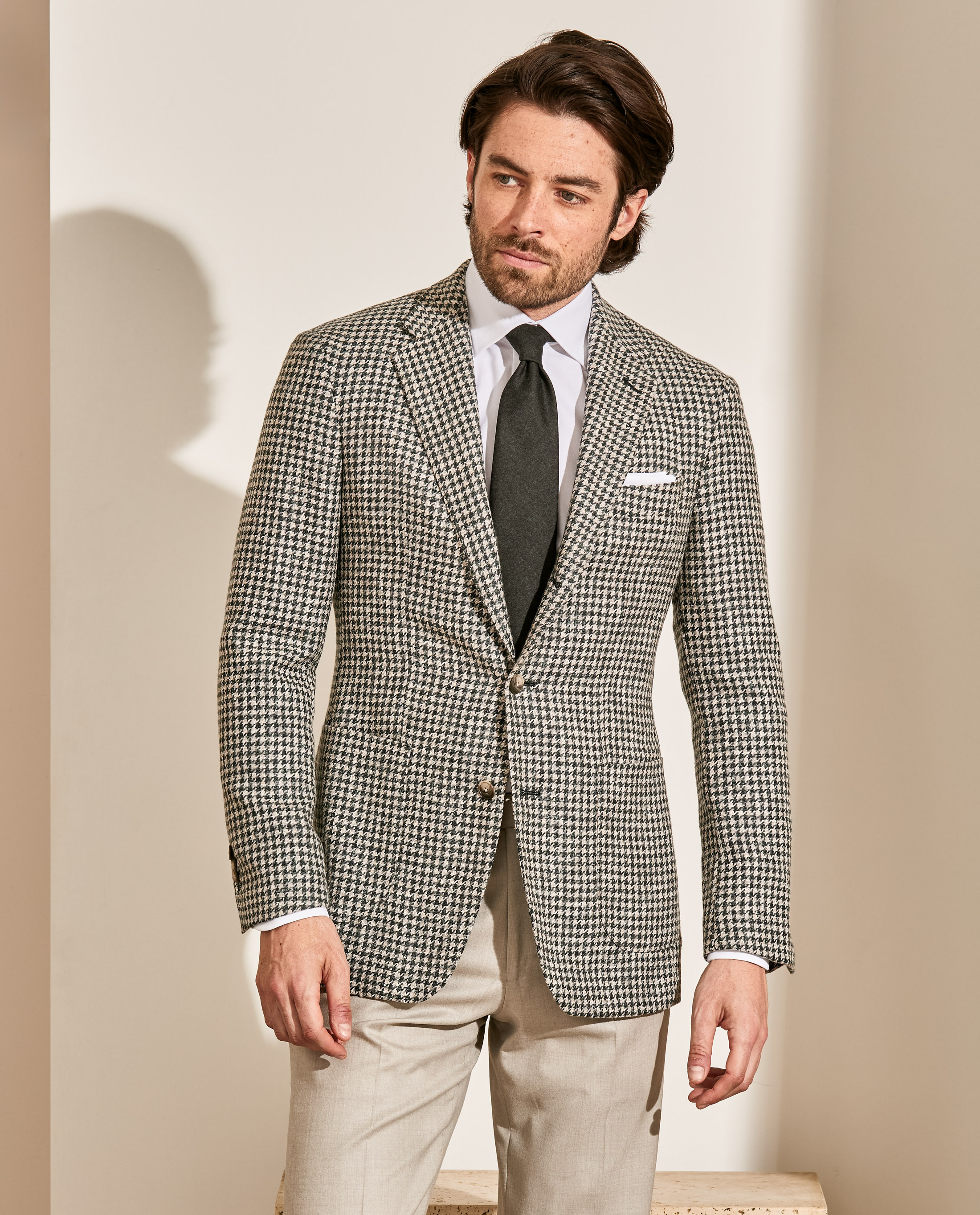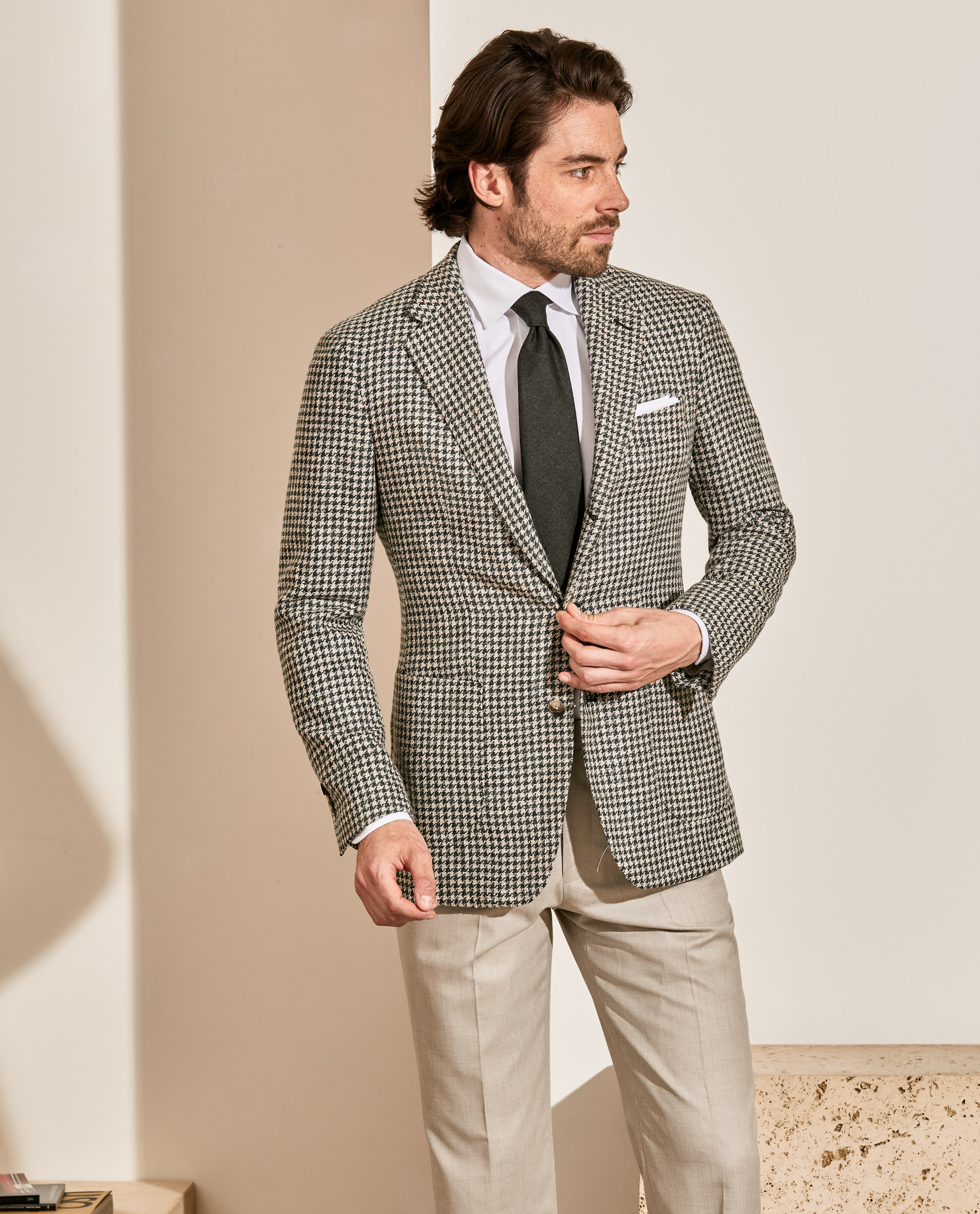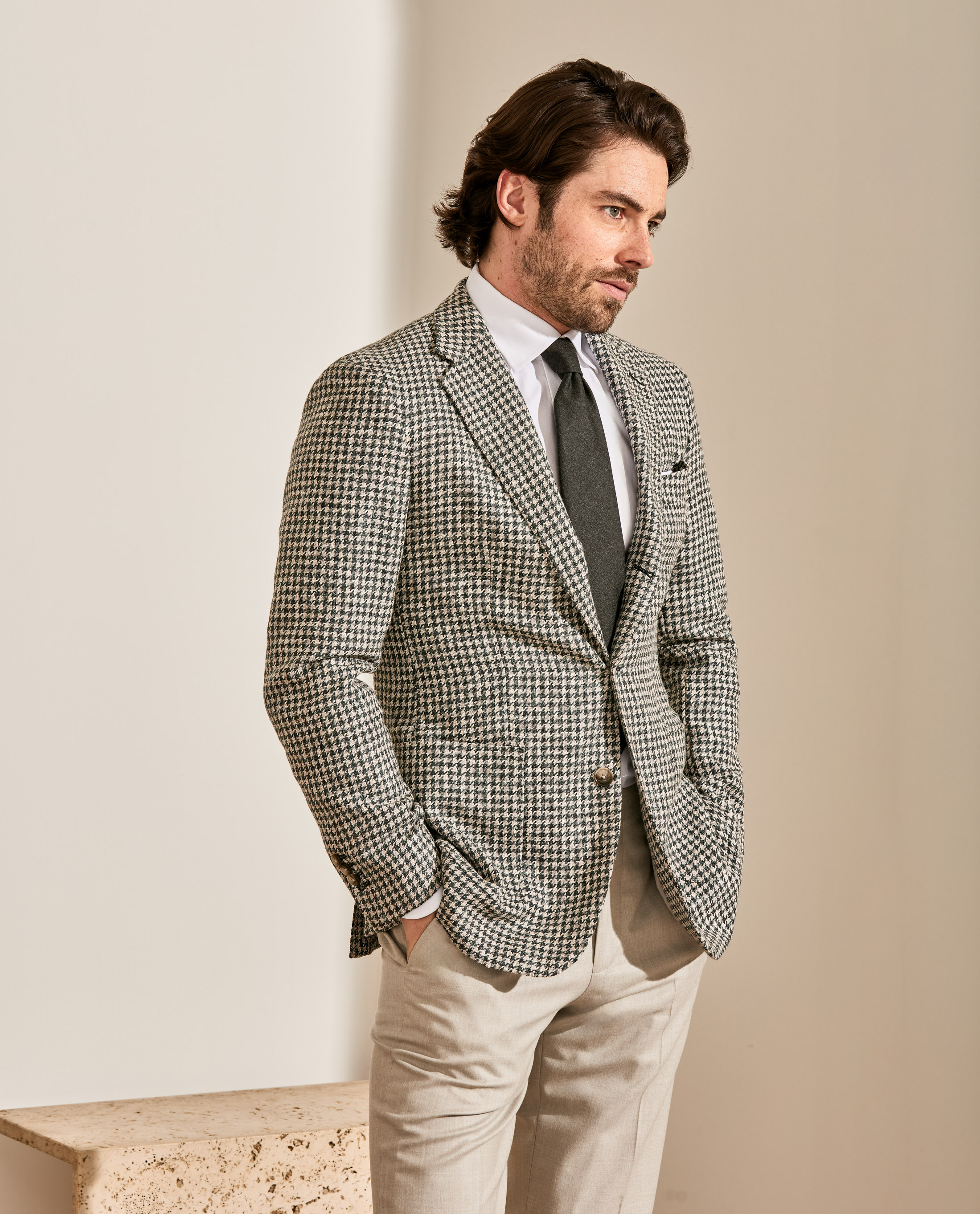 This jade green and bone houndstooth offers up a luxe and intriguing twist on a classic. Made from a soft blend of flamed merino wool yarns twisted with baby alpaca and linen for a tweed-like dimension. Designed here with low-gorge lapels. Style it with a stretch shirt, tie, flannel trousers, and suede shoes to complete the look. Make this jacket your own with our many customization options. Merino wool, baby alpaca, & linen Luxury blend Houndstooth Soft feel
