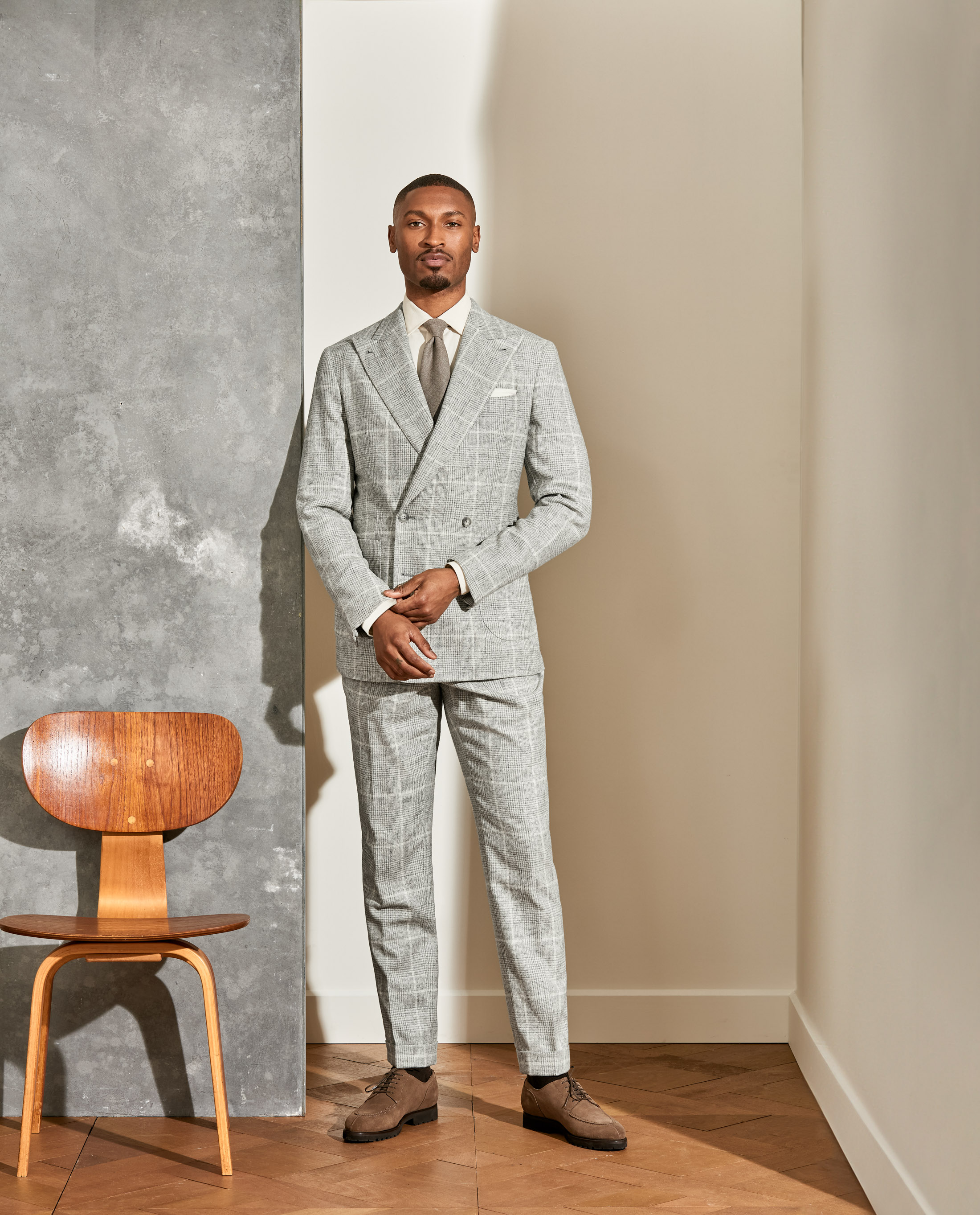 Curated from some of our softest and most luxurious fabrics, this strong look in a subtle palette will keep you warm on even the coldest days. The plaid suit in soft gray is paired with all winter neutrals for the ideal seasonal look: a cream cotton flannel shirt, taupe wool flannel tie, and taupe suede Bluchers.