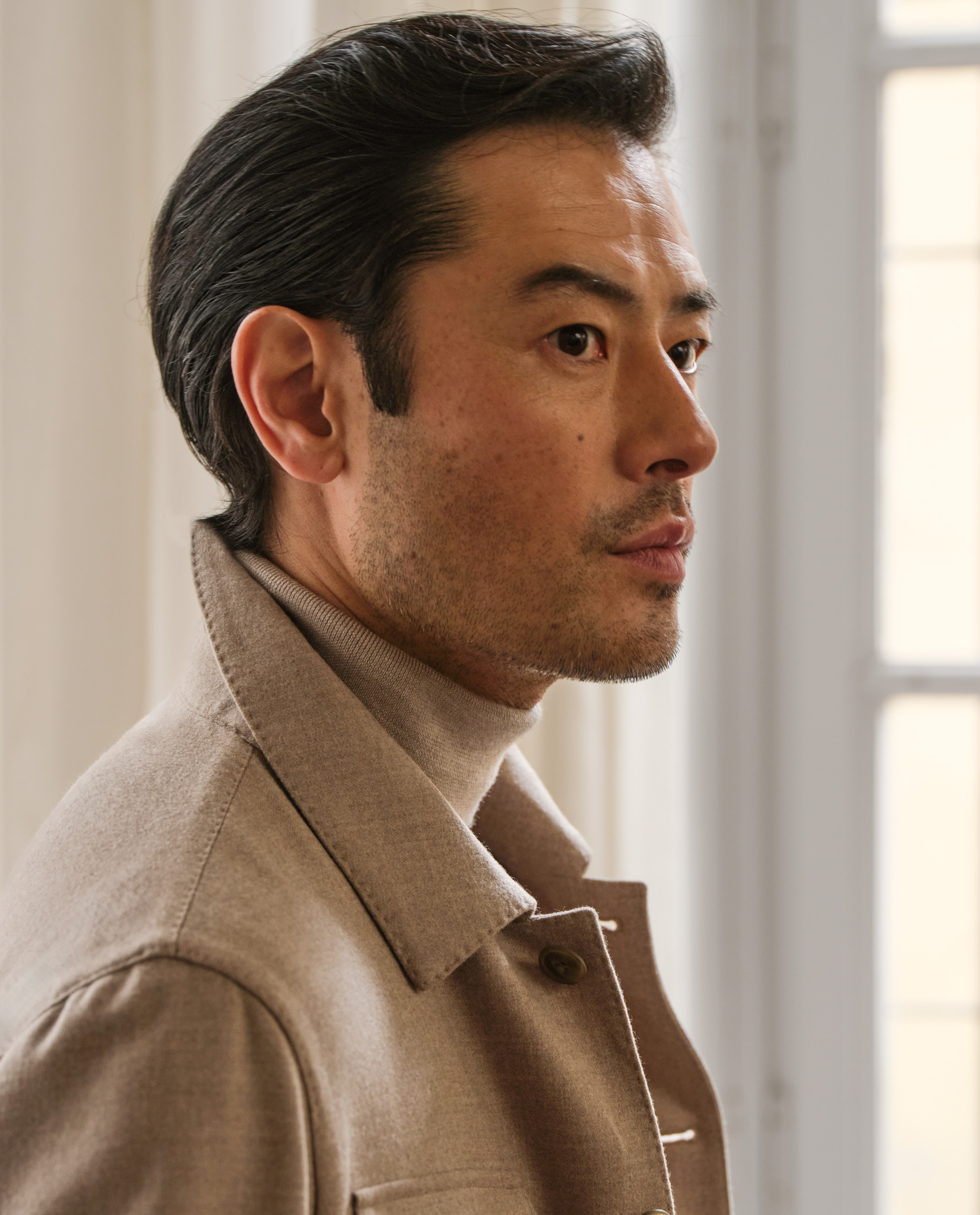 A new perspective on the office uniform: the utility jacket brings a rugged edge to a tonal look. Style with a sand knit, and taupe bluchers. The monochrome palette keeps the look modern in spirit, timeless in style.