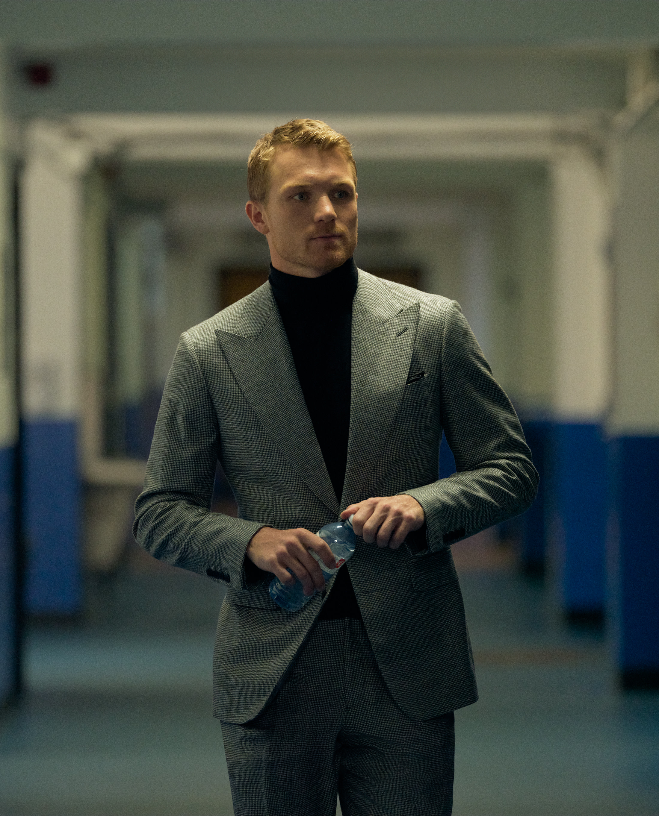 Ty's 2-piece suit with wide peak lapels pairs with a black turtleneck knit for an aesthetic aptly known as “athletic chic.” Crafted from a micro-houndstooth weave – responsible for its versatile salt-and-pepper effect – this luxurious investment piece can easily be styled for a range of occasions. Finished here with a black silk pocket square and black suede penny loafers, for a smooth transition from winter business settings to a sophisticated evening out.