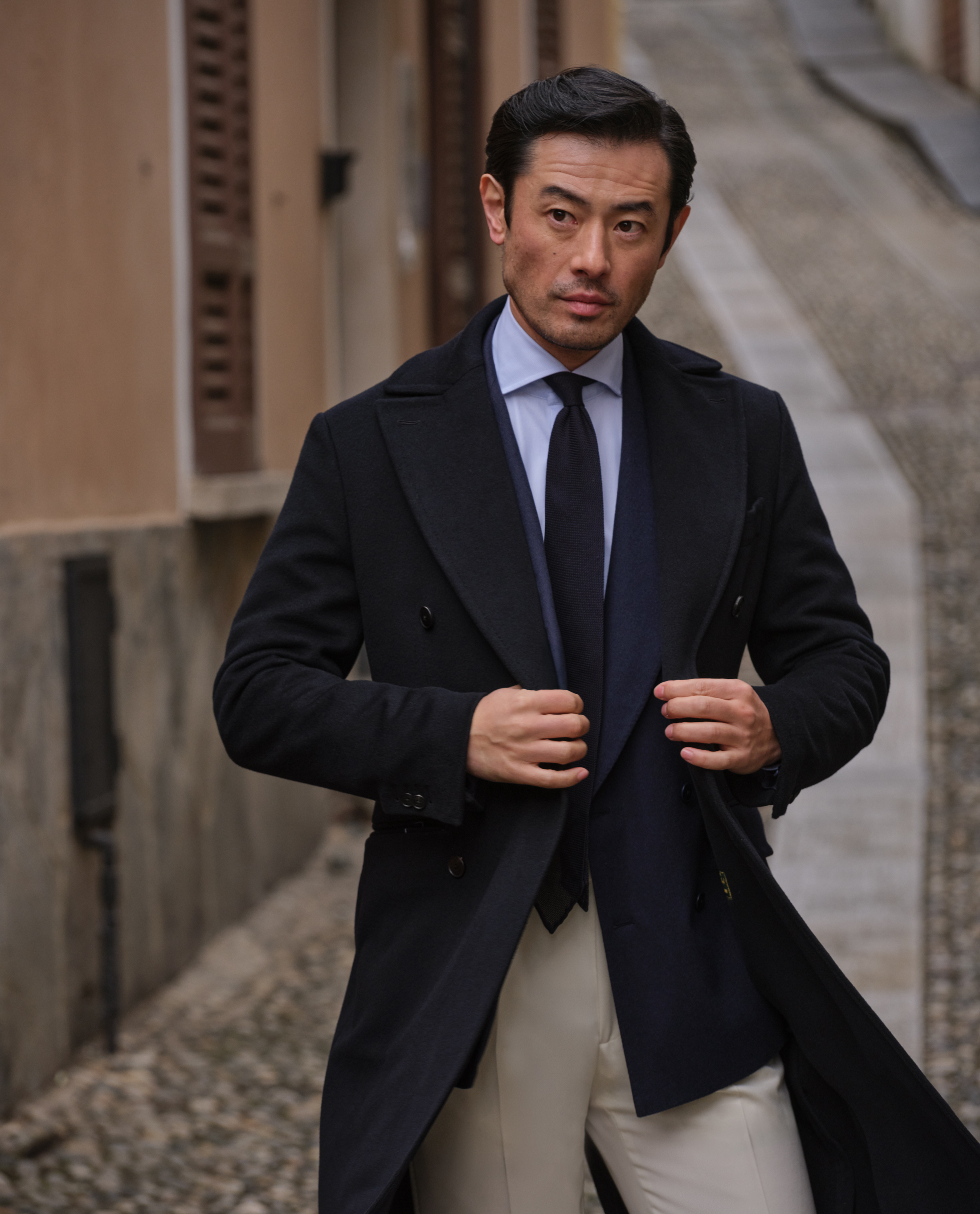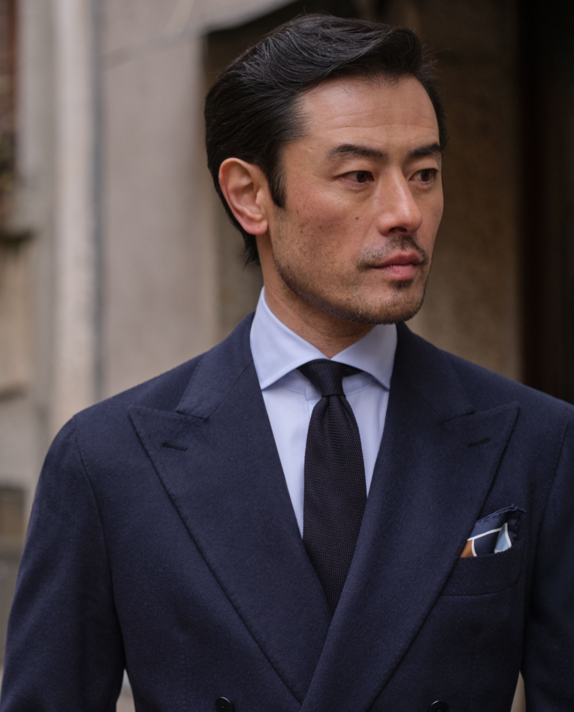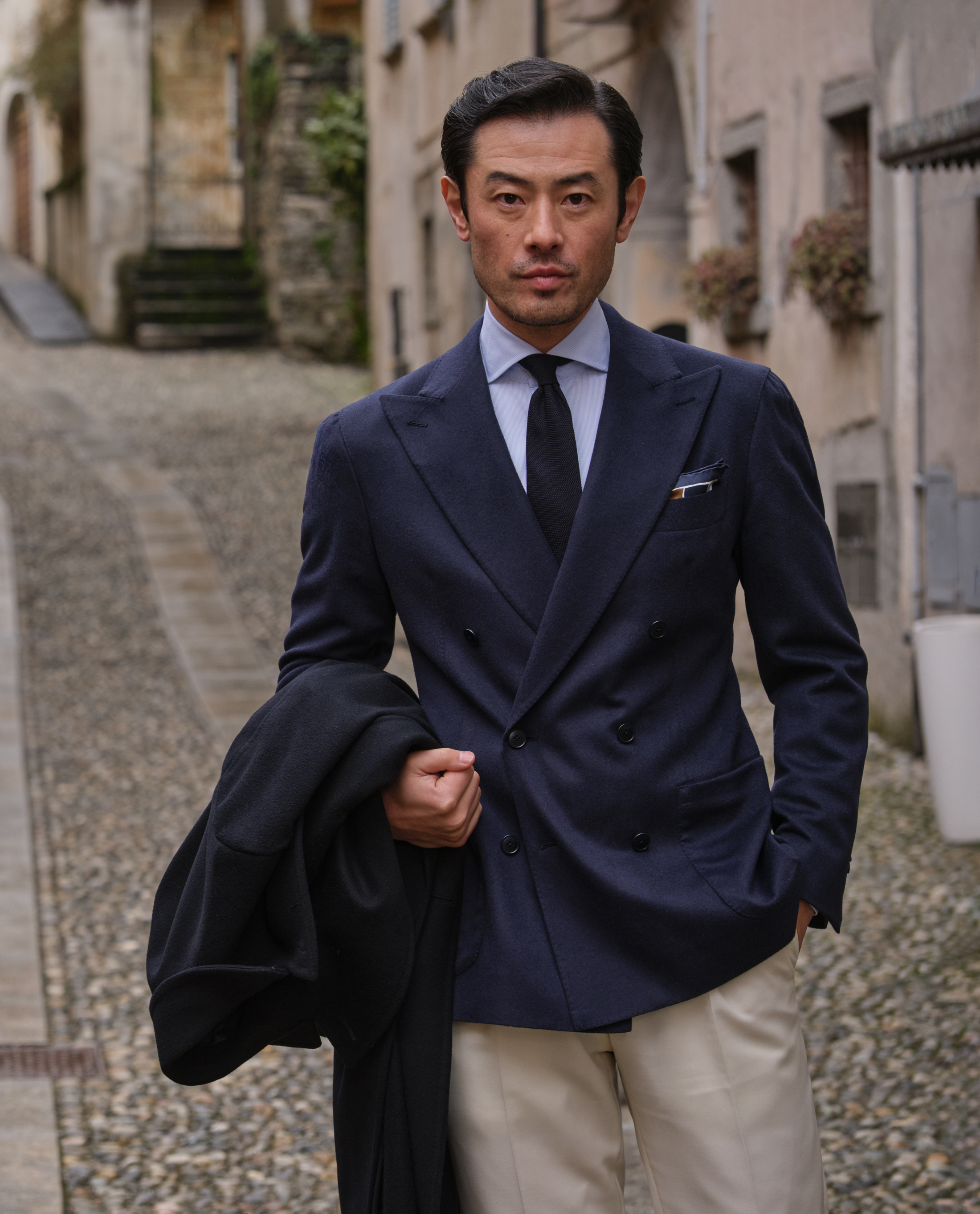 A midnight blue double-breasted jacket, refined and versatile, offers understated elegance. Crafted from brushed camel, it delivers subtle softness and depth. Complement it with a light blue kilim silk pocket square, a darker tie, and brown loafers for a look that’s quietly confident and effortlessly polished.