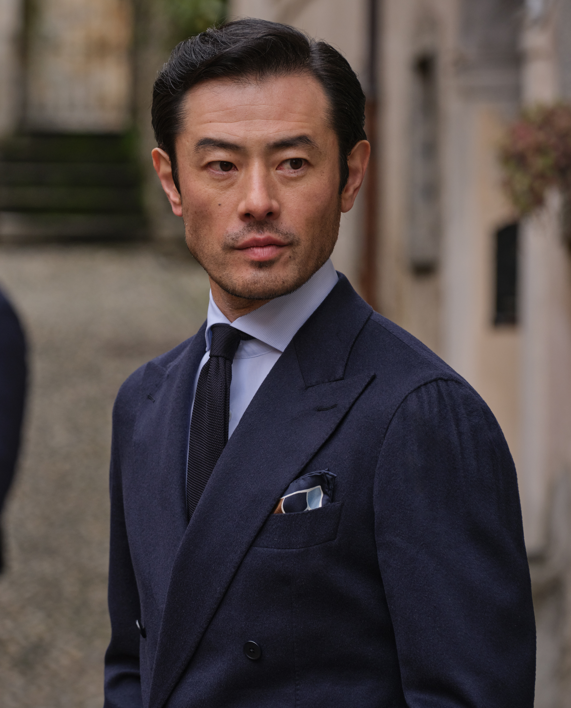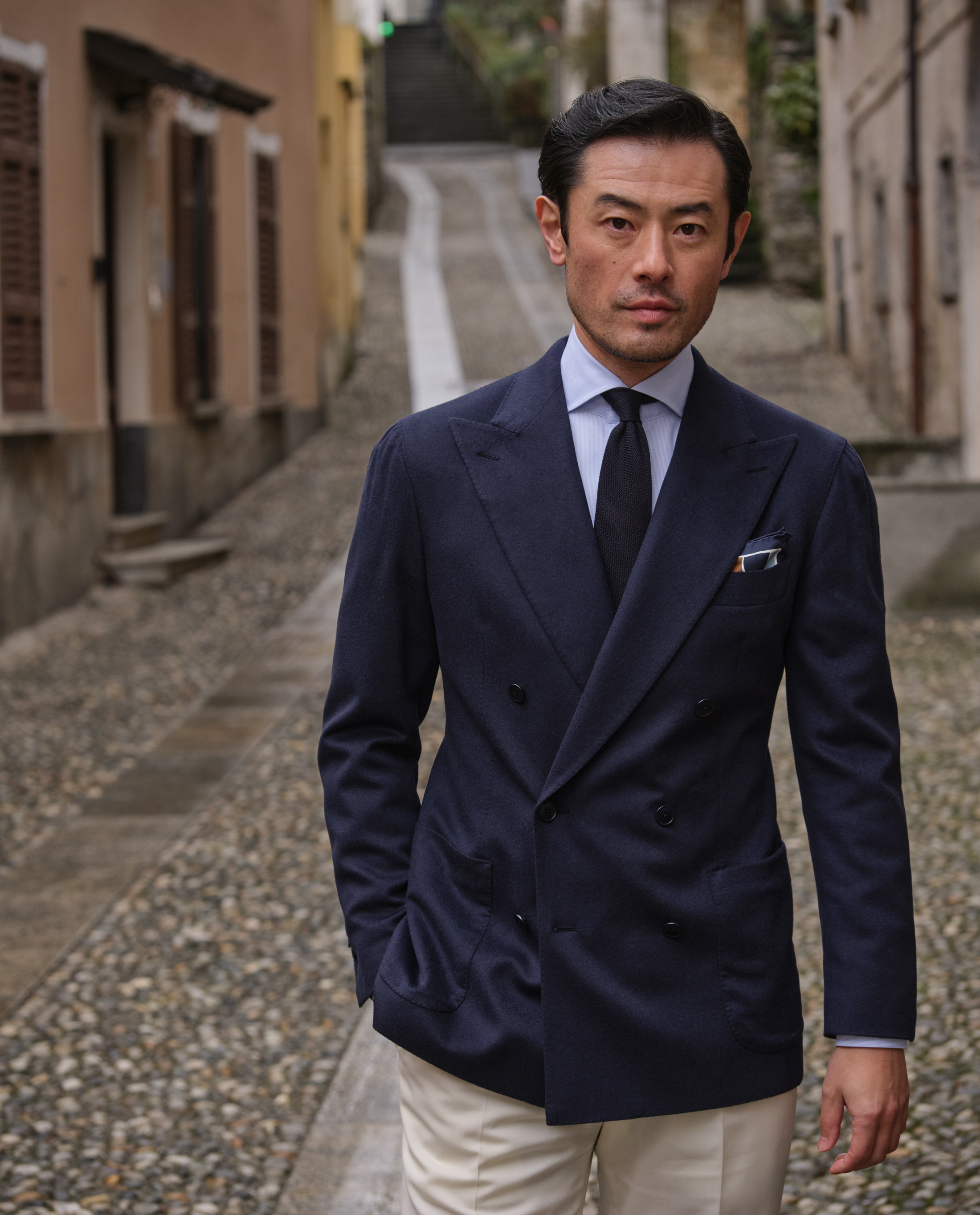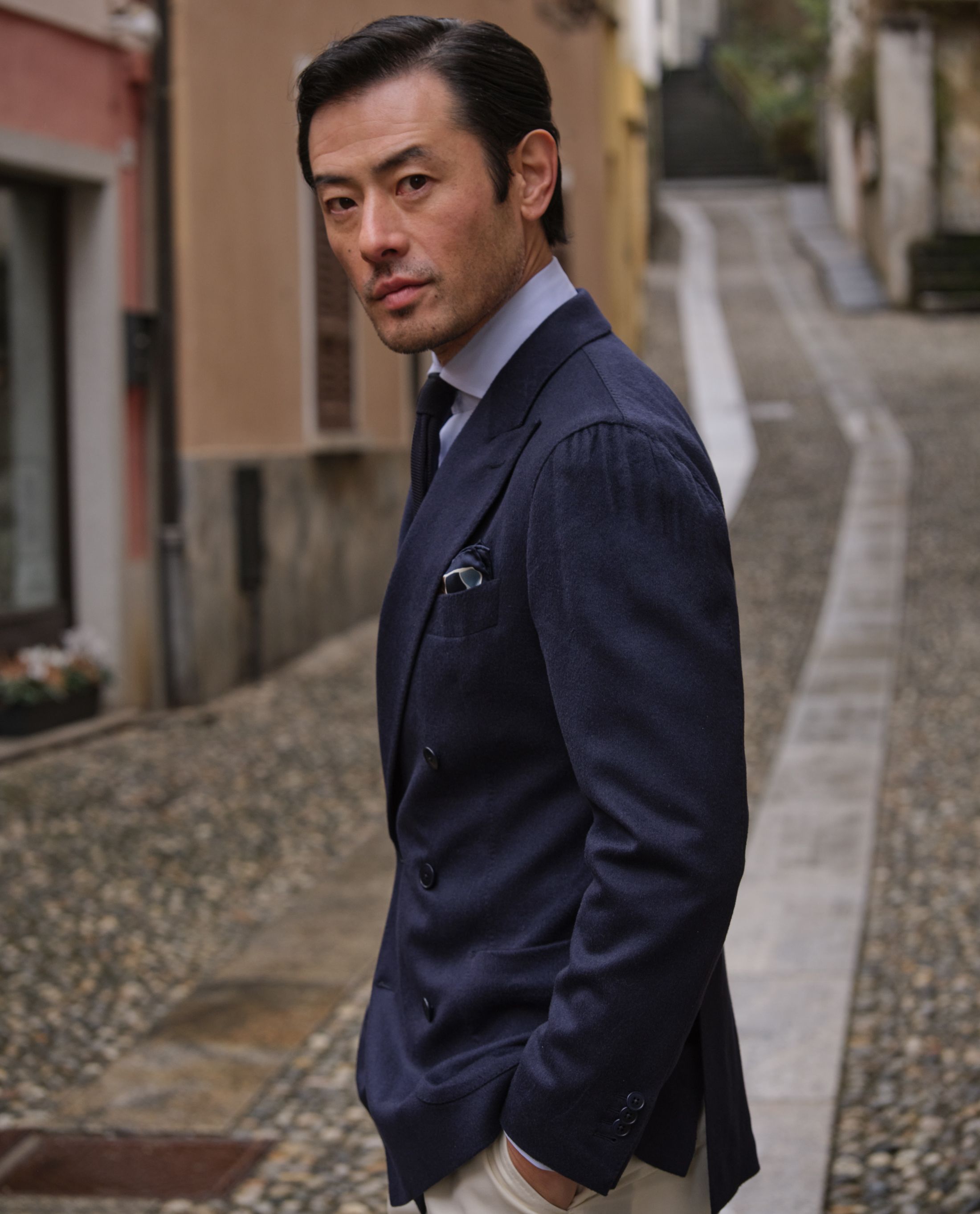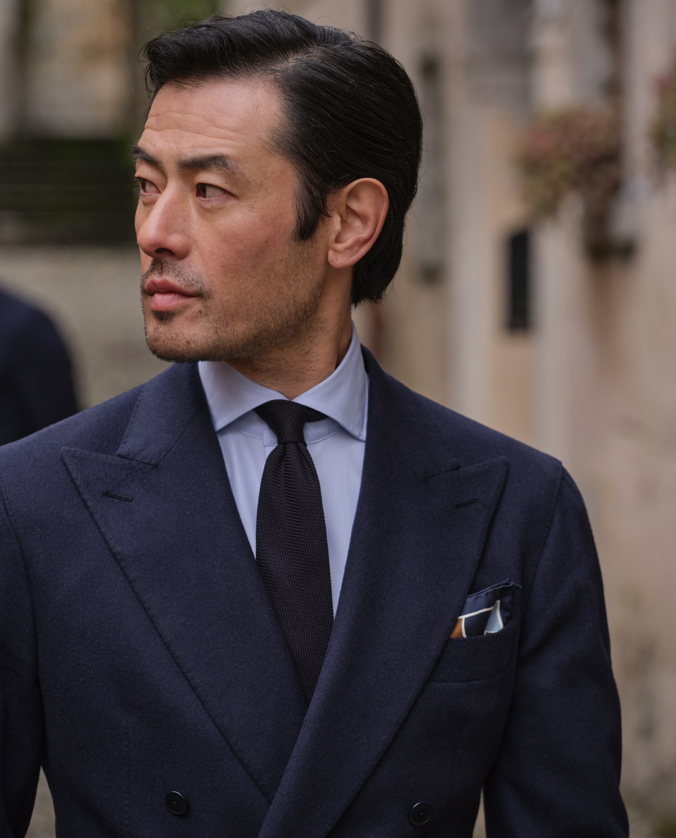 A midnight blue double-breasted jacket, refined and versatile, offers understated elegance. Crafted from brushed camel, it delivers subtle softness and depth. Complement it with a light blue kilim silk pocket square, a darker tie, and brown loafers for a look that’s quietly confident and effortlessly polished.