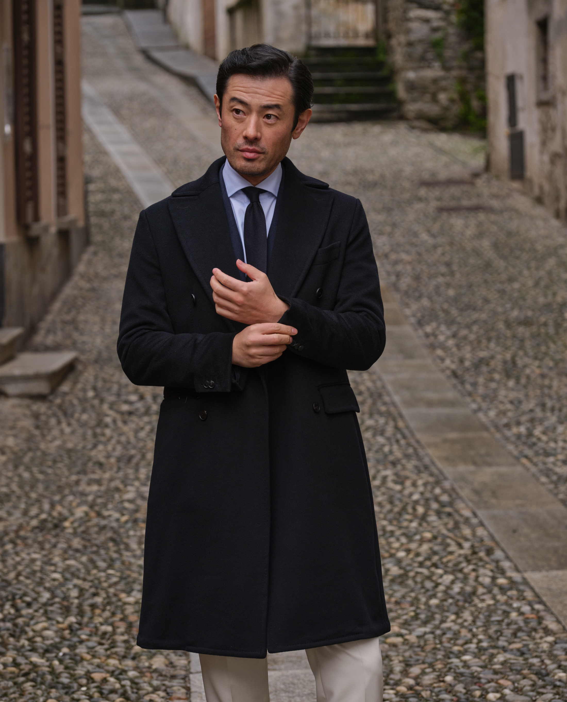This dark blue overcoat is crafted from the luxurious Bactrian camel fleece fabric made in Italy by Loro Piana. Sourced from the rare, noble fibers of baby camels in Mongolia, this ancestral quality is known for its exceptional softness, insulation, and natural color. Make this coat your own with our many customization options to choose from.