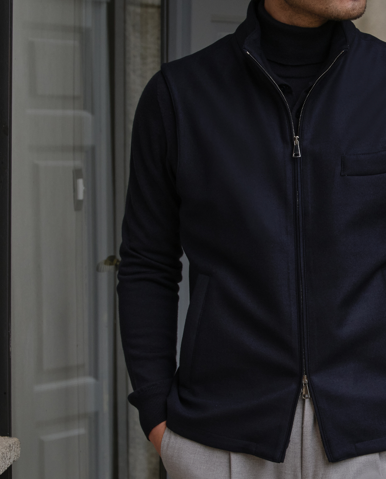 This midnight blue vest is crafted from Jersely® fabric made in Italy by Loro Piana. Combining the finest pure wool and a small percentage of stretch, this blend is woven on a shuttle loom to create the elasticity of knitted jersey. A soft and breathable garment that moves with the body. Style it with a turtle neck, woolen trousers, and loafers to complete the look. Make this vest your own with our many customization options. Wool blend Stretch Glen plaid Comfortable Breathable