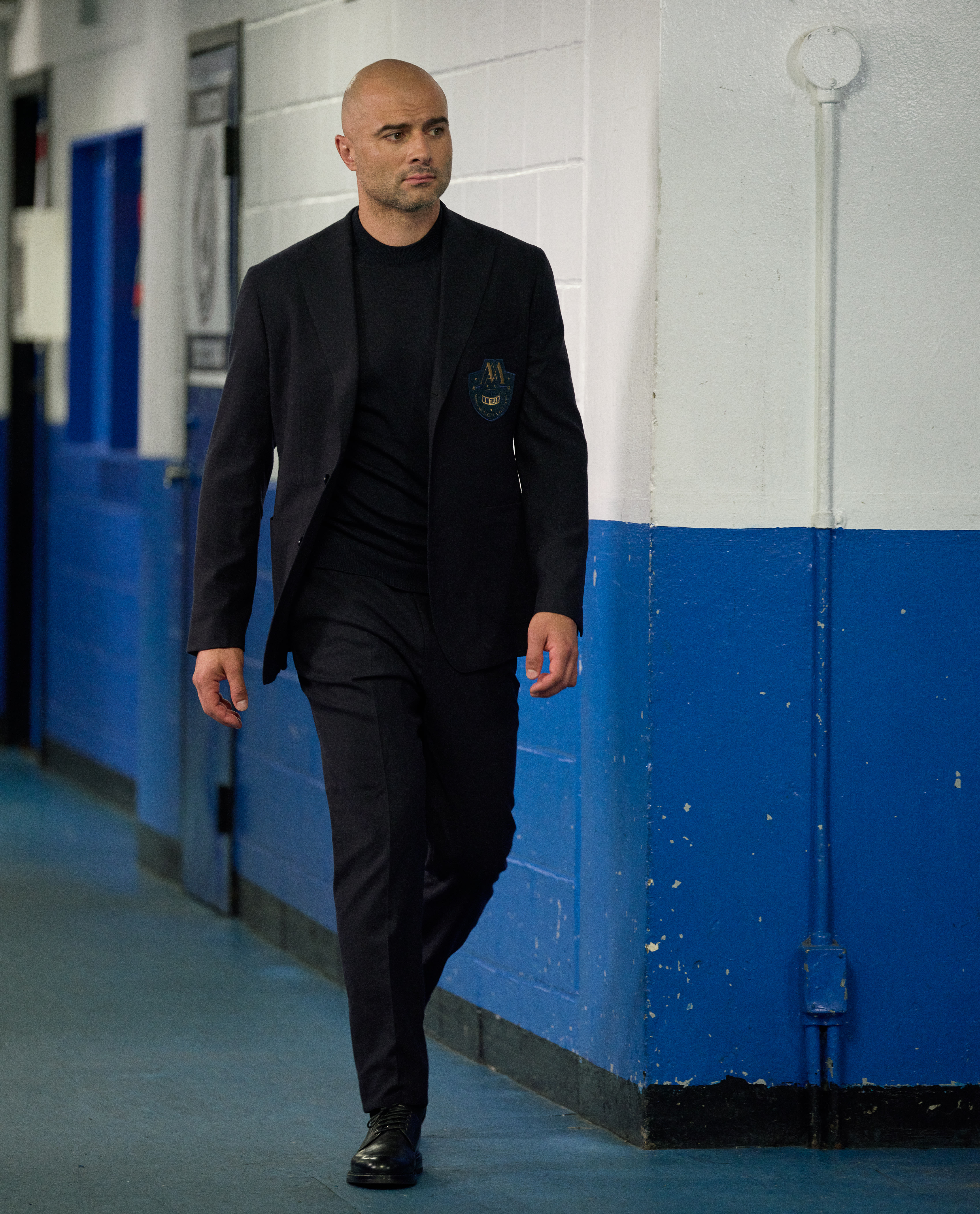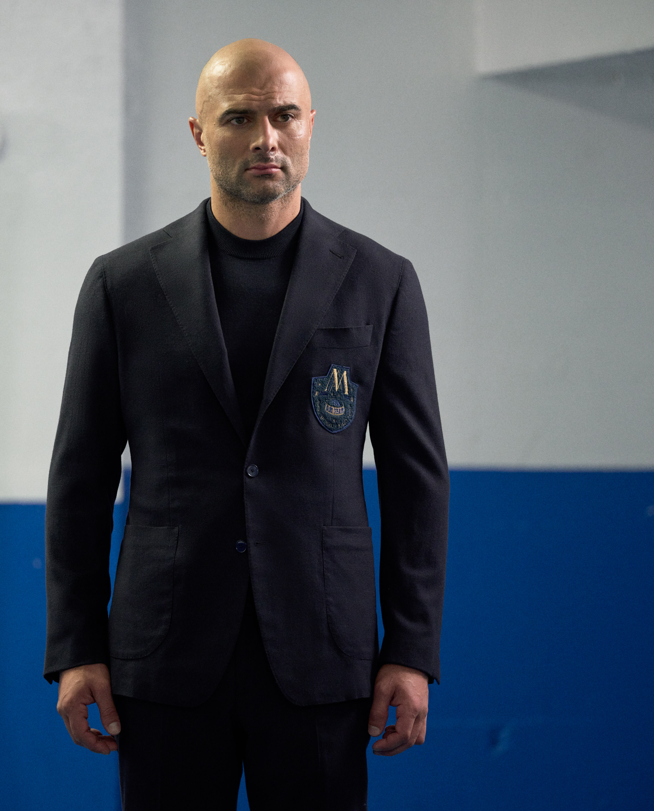 Mark’s pre-game look strikes the perfect balance between comfort and sophistication by combining a lightweight midnight blue stretch suit, midnight blue crew neck, and black Bluchers. What’s more, his sleek, monochromatic ensemble mirrors that of his AM teammates: all in midnight blue outfits tailored to their individual tastes, ensuring everyone is in the zone on game day.