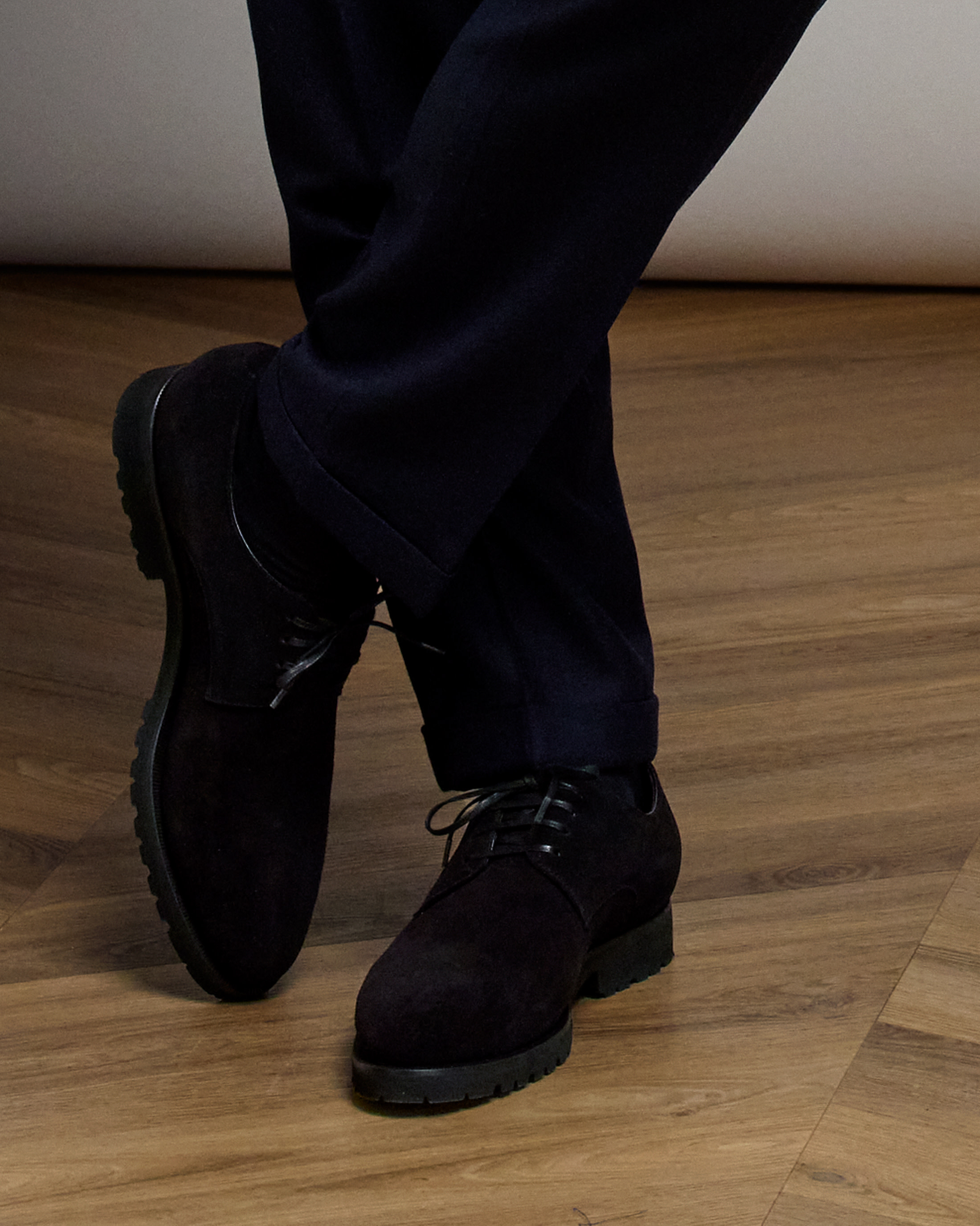 These black handmade Derbies offer lightweight luxury. The soft suede calfskin leather is chrome tanned and features a water-resistant finish. Designed here as a plain toe Derby shoe in our Blake Light construction. Make these shoes your own with our many customization options to choose from.