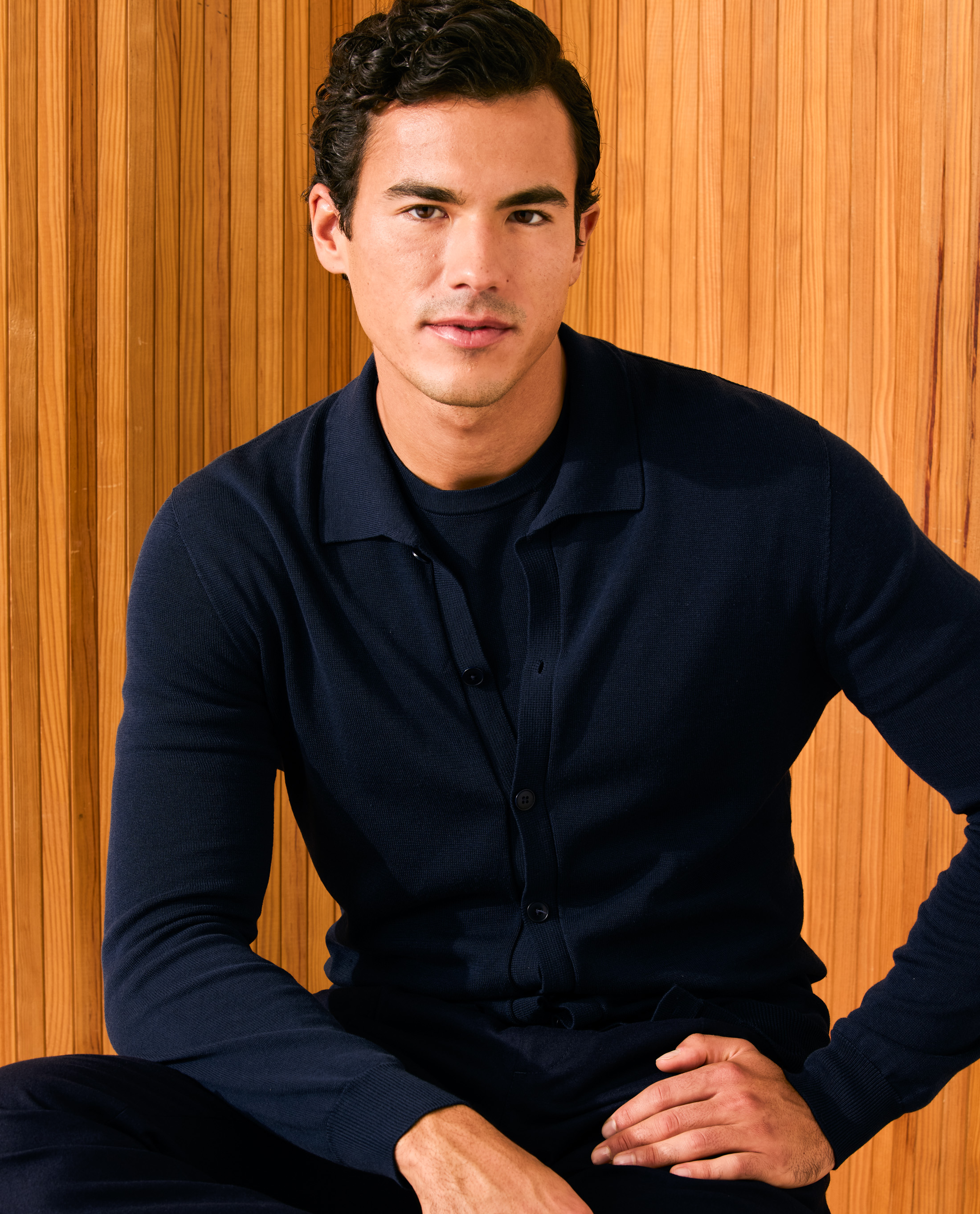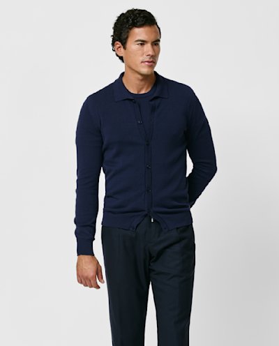 Lightweight with shine especially visible in the sunlight, consider this navy blue cardigan your quintessential summer knit. Seamlessly knitted from a luxe blend of breathable Egyptian cotton with mulberry silk, adding even more elegance, softness, and drape. Designed here as a cardigan with a polo collar and in double ply. Make this knitwear your own with our customization options.