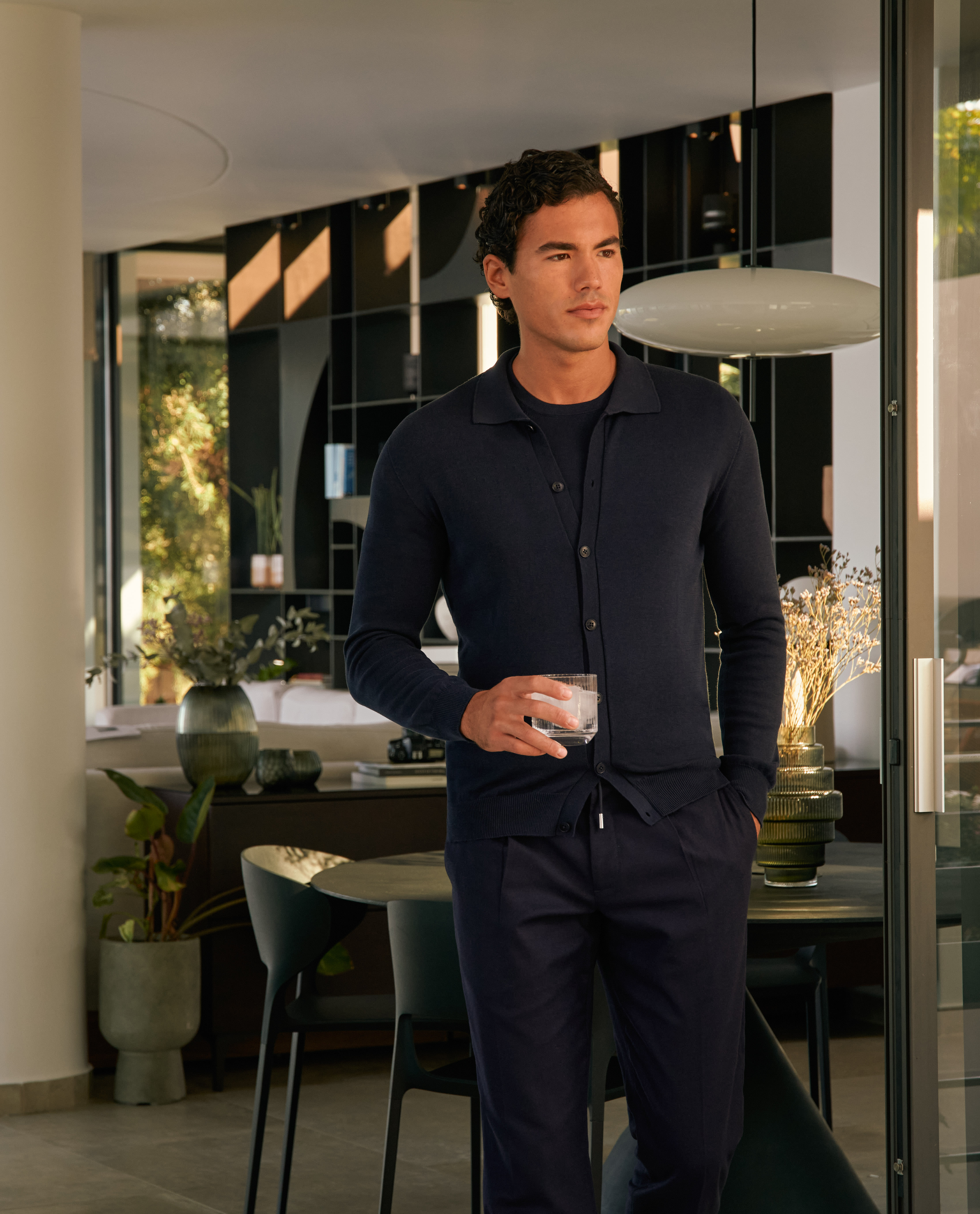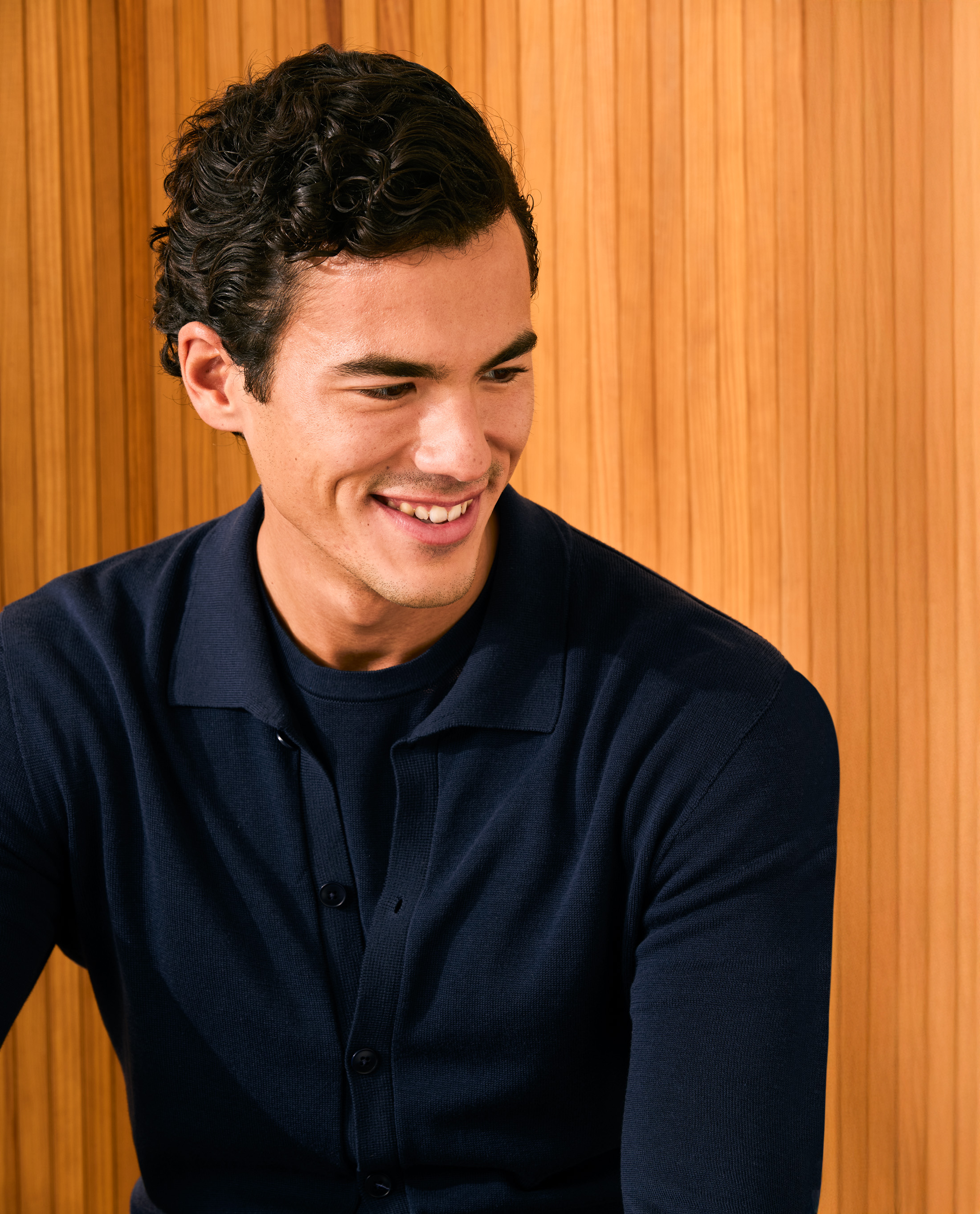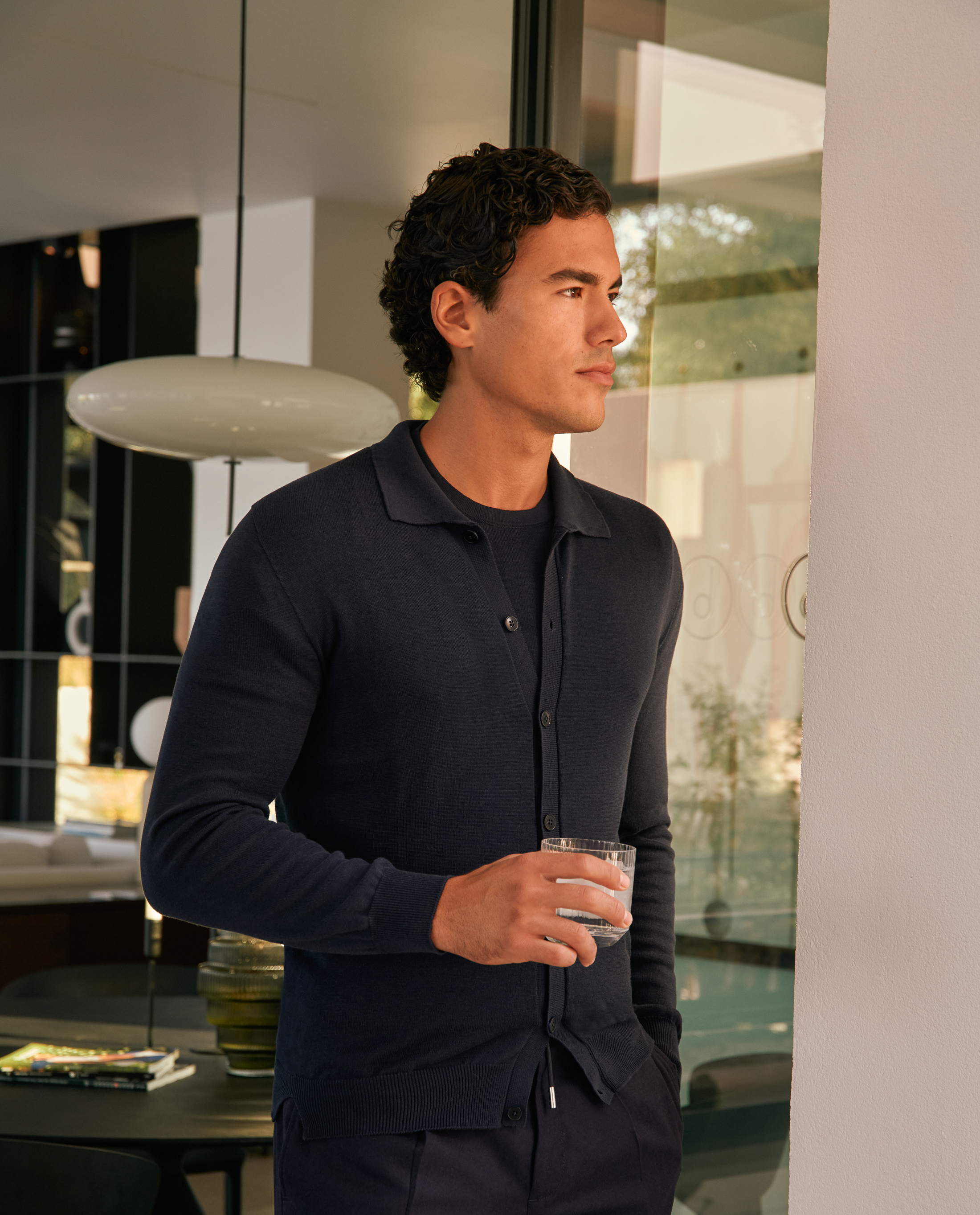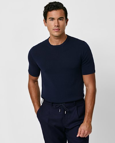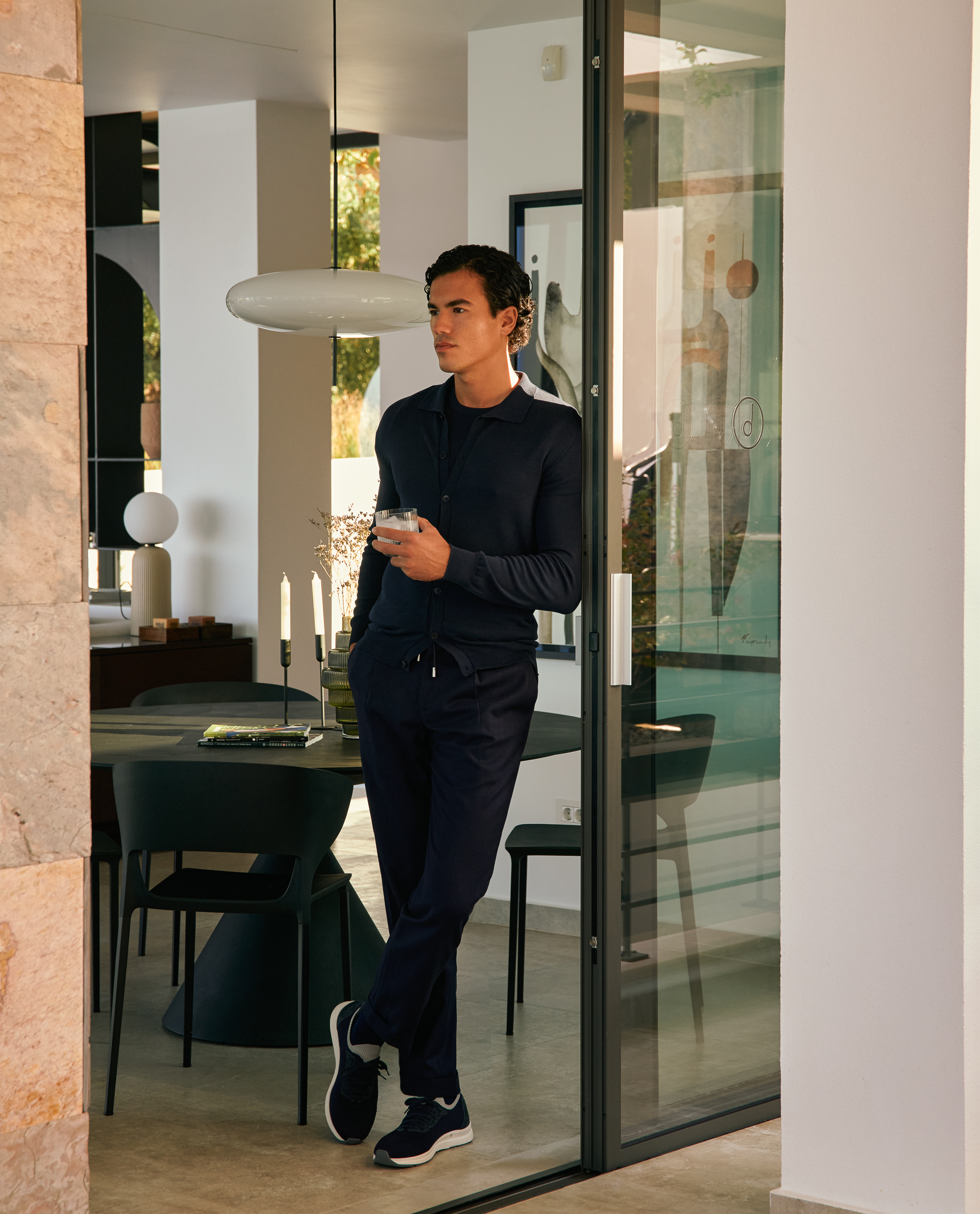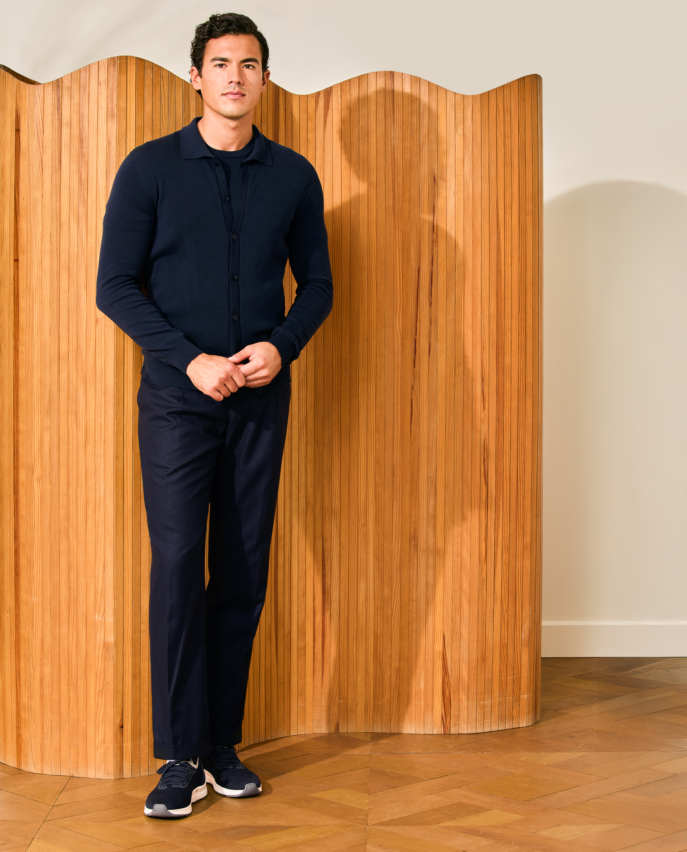 Your go-to weekend look: this navy t-shirt and matching cardigan knit hit that casual-chic sweet spot, whether you’re out for coffee, laying low, or catching up with friends. Comfortable, cohesive, and effortlessly cool with our navy stretch wool-lyocell-cashmere trousers and dark blue knit sneakers.