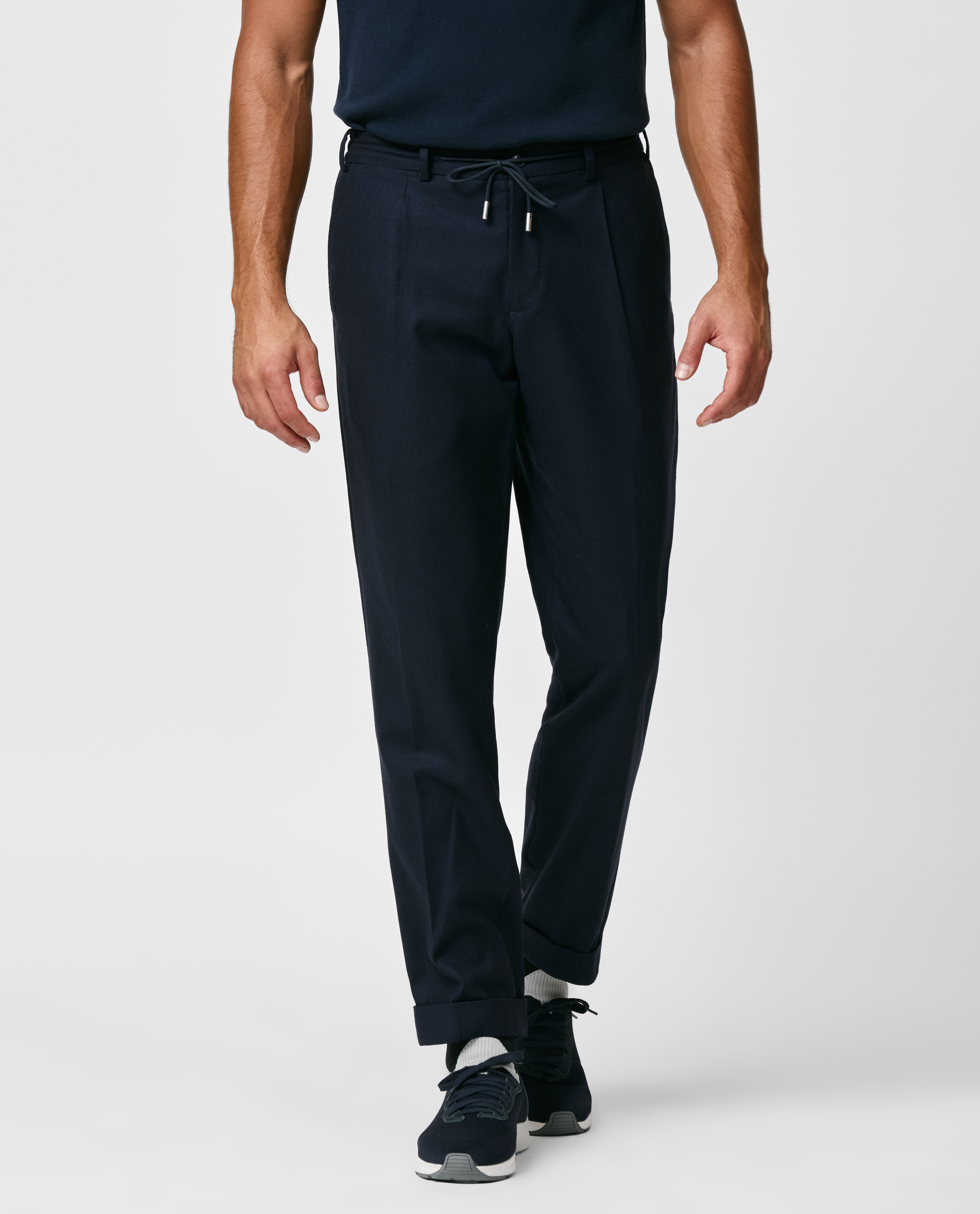 These navy trousers are casual-yet-refined option for the colder months. Made from a comfortable blend of wool, lyocell, and cashmere woven with stretch for a jersey feel, enhanced with a semi-brushed finish. Make these trousers your own with our many customization options to choose from. Wool, lyocell & cashmere blend Stretch Jersey feel Semi-brushed finish