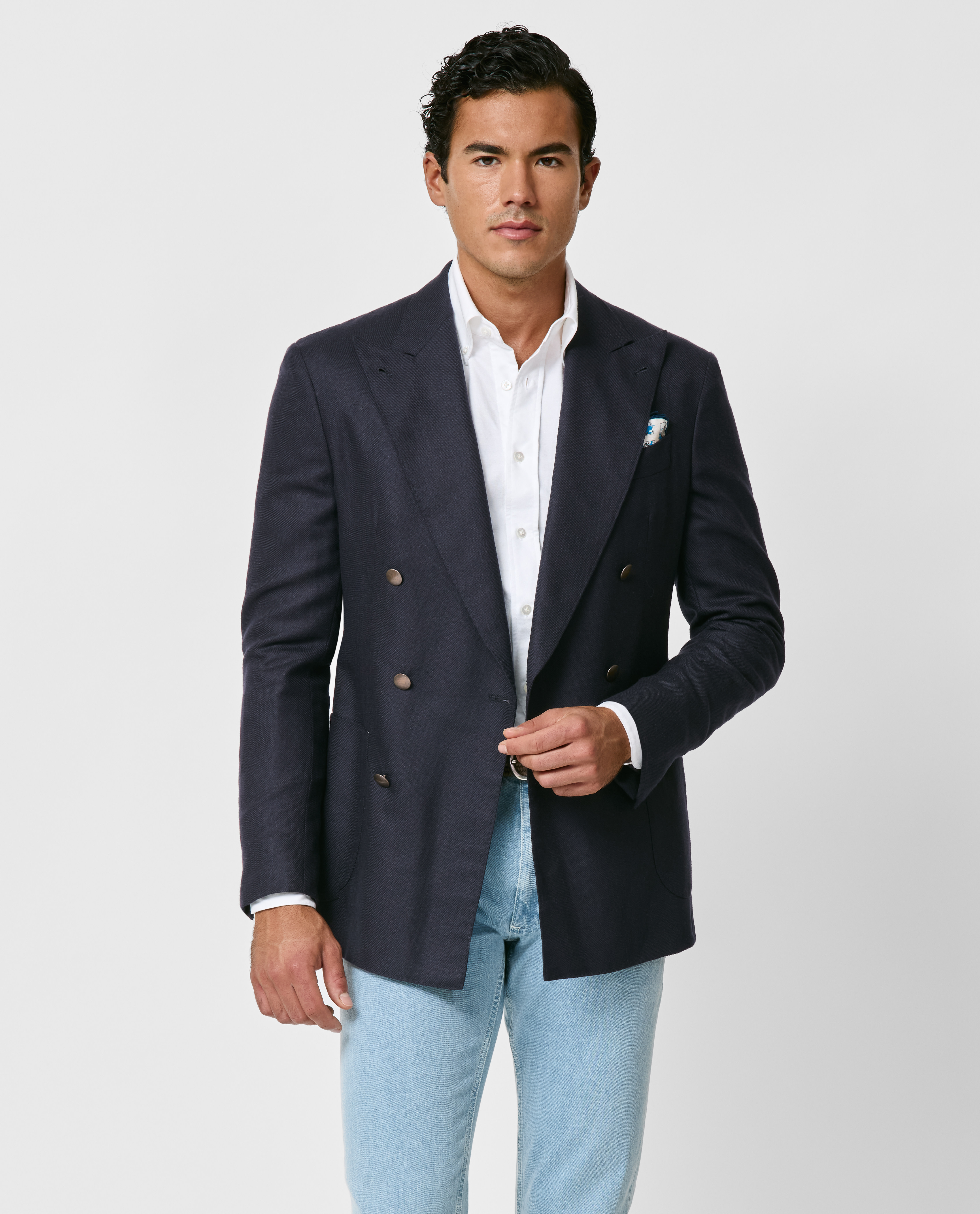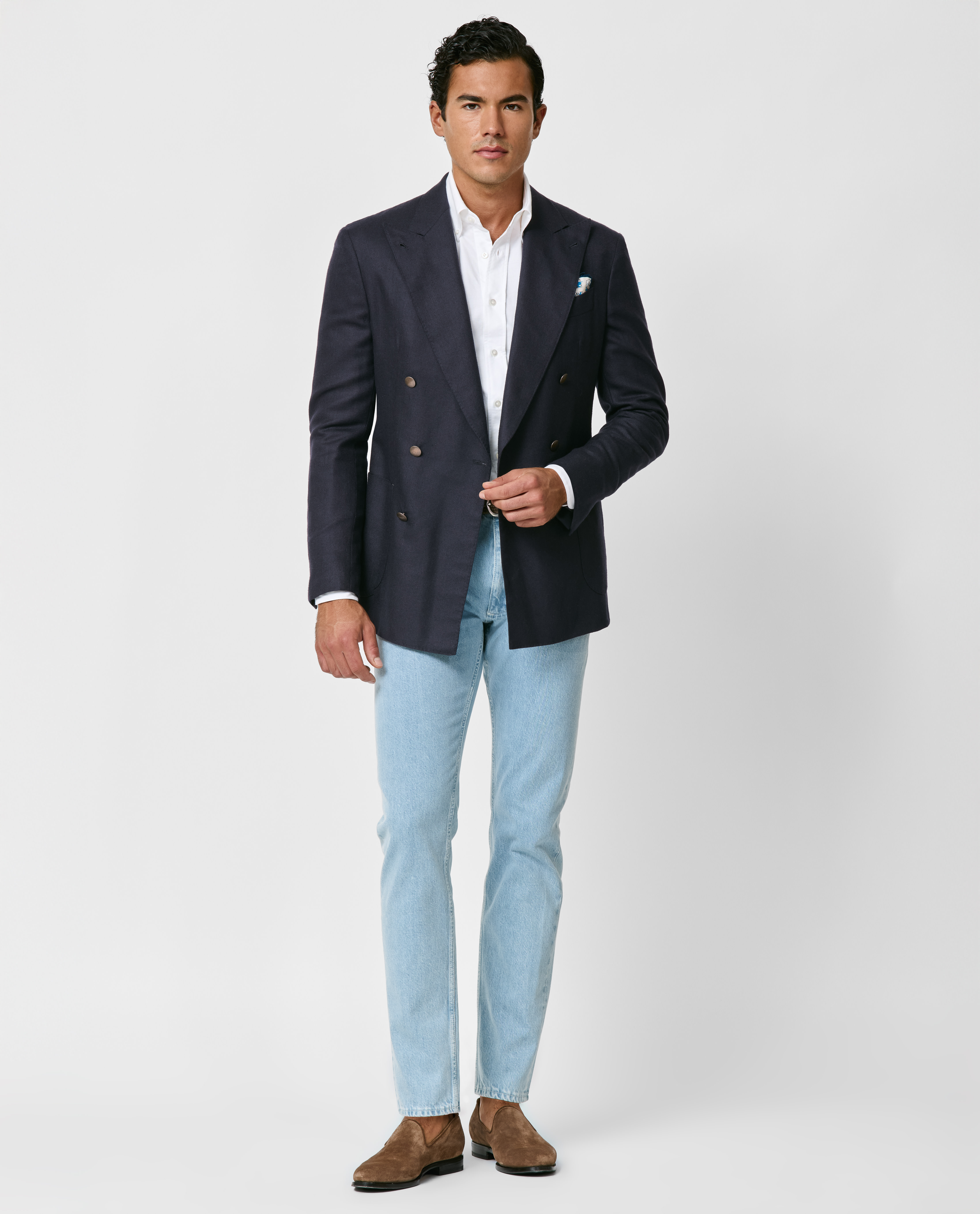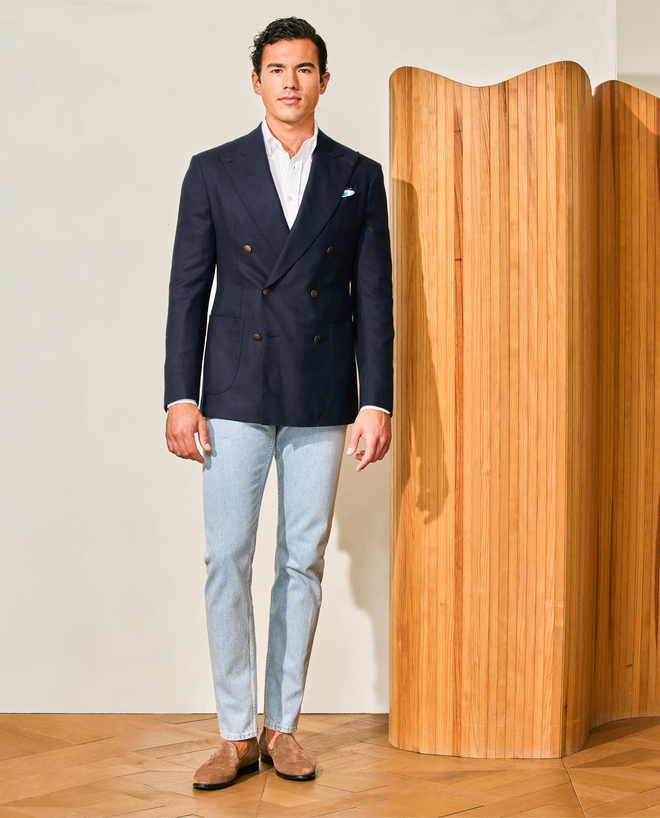 Who says double-breasted has to be formal? Finished with characteristic gold buttons, this navy blue silk-wool jacket pairs effortlessly with a white Oxford shirt and light selvedge jeans to create an effortless smart-casual look. Artfully tied together with a printed silk pocket square and brown suede loafers.