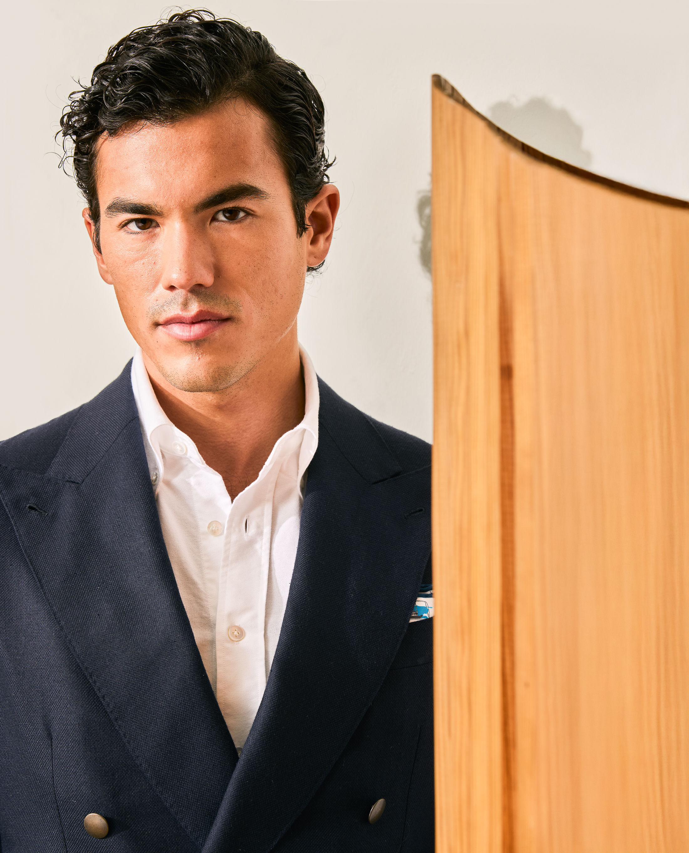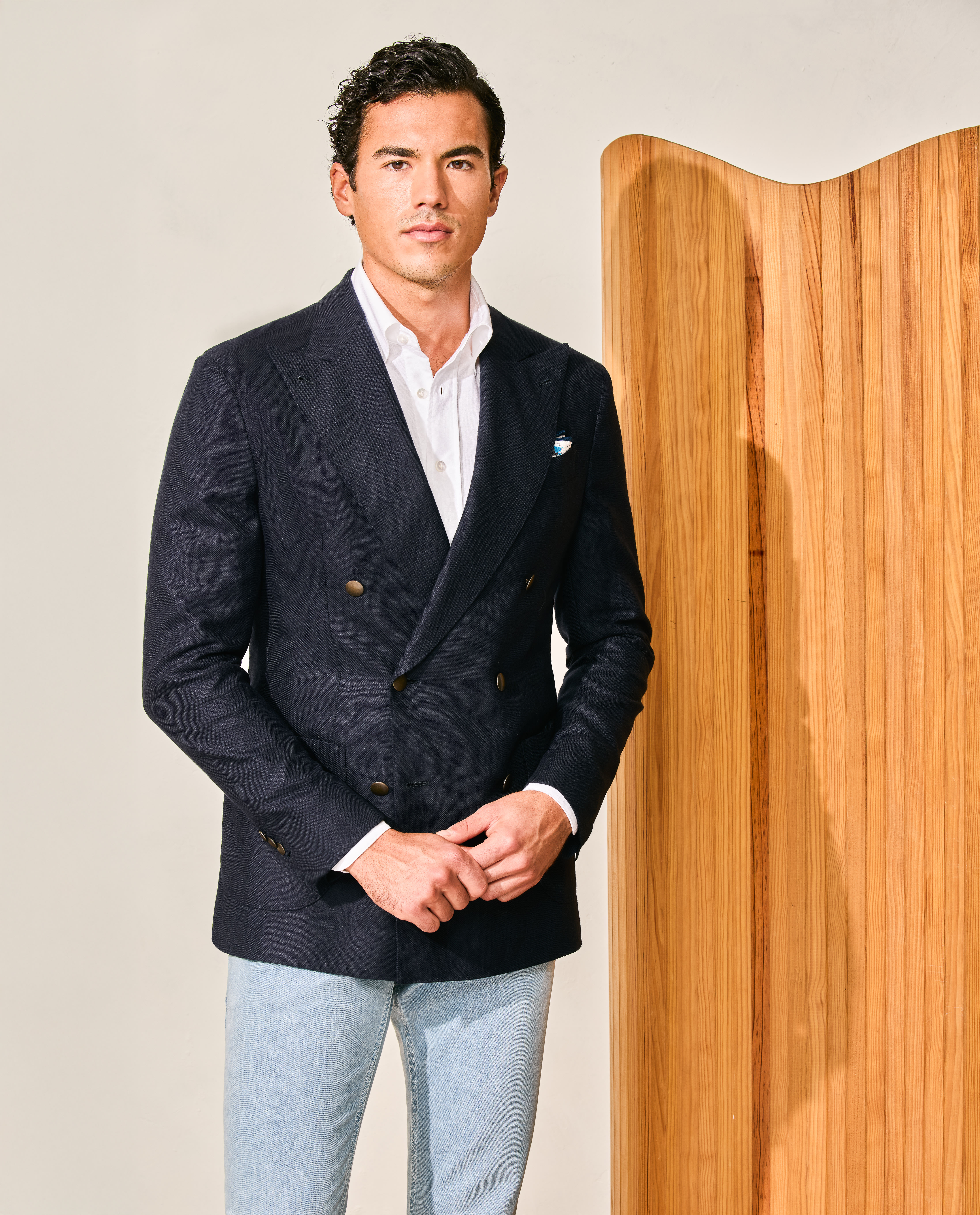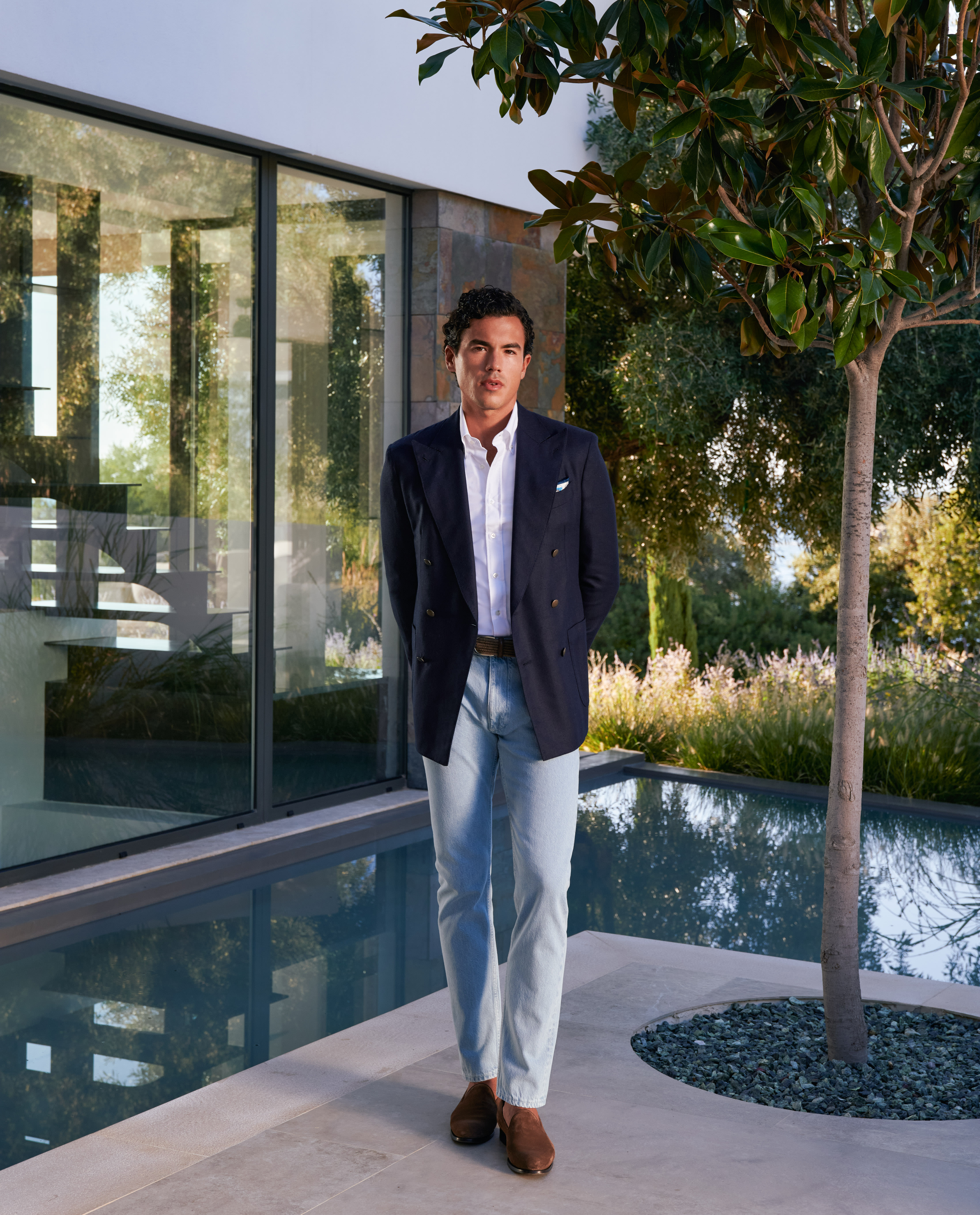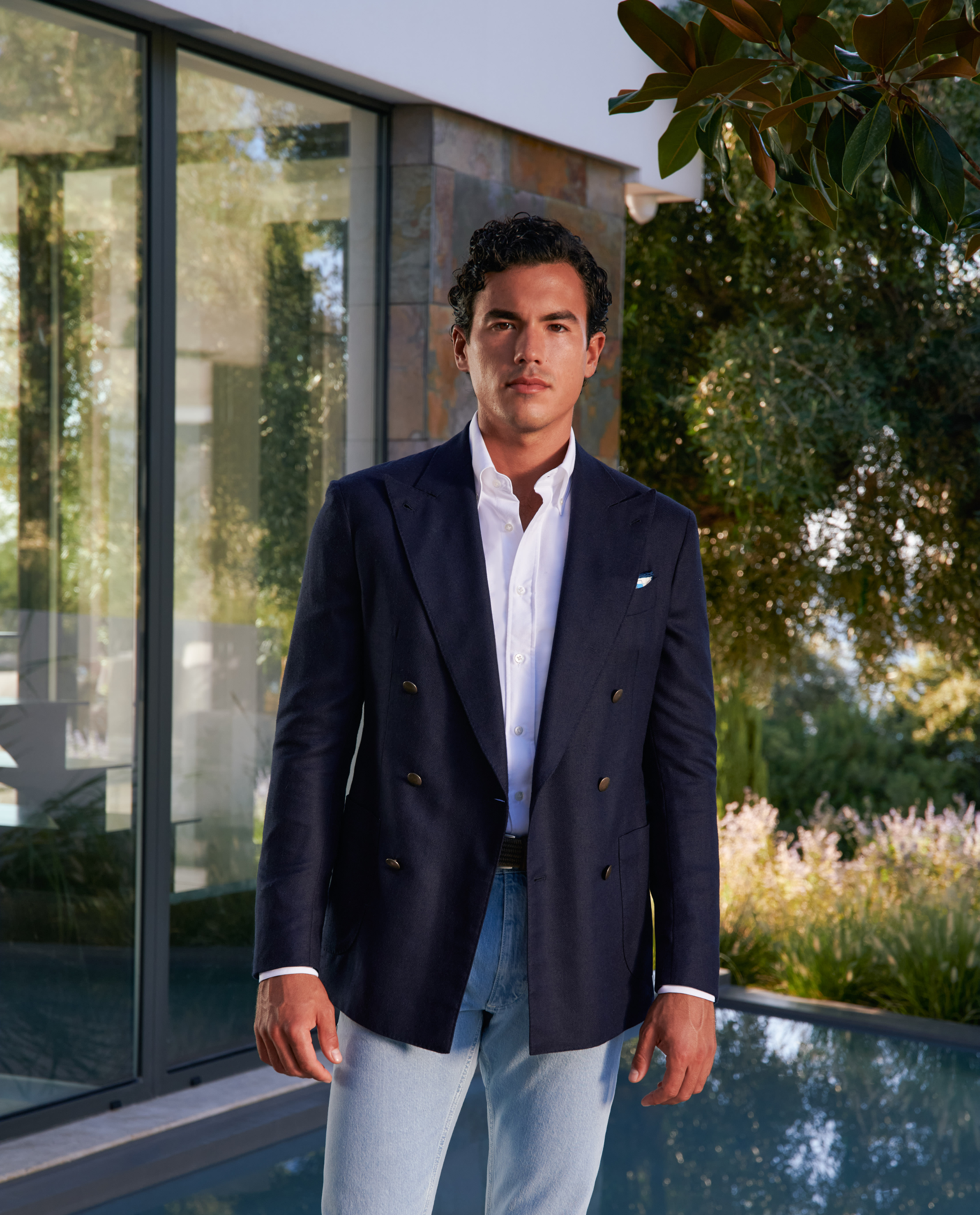Who says double-breasted has to be formal? Finished with characteristic gold buttons, this navy blue silk-wool jacket pairs effortlessly with a white Oxford shirt and light selvedge jeans to create an effortless smart-casual look. Artfully tied together with a printed silk pocket square and brown suede loafers.