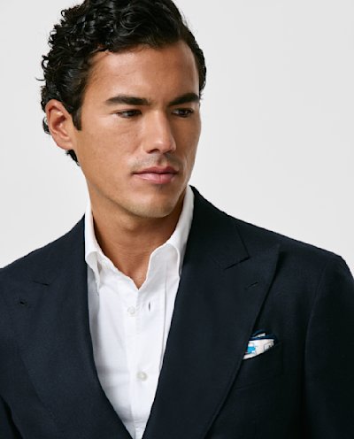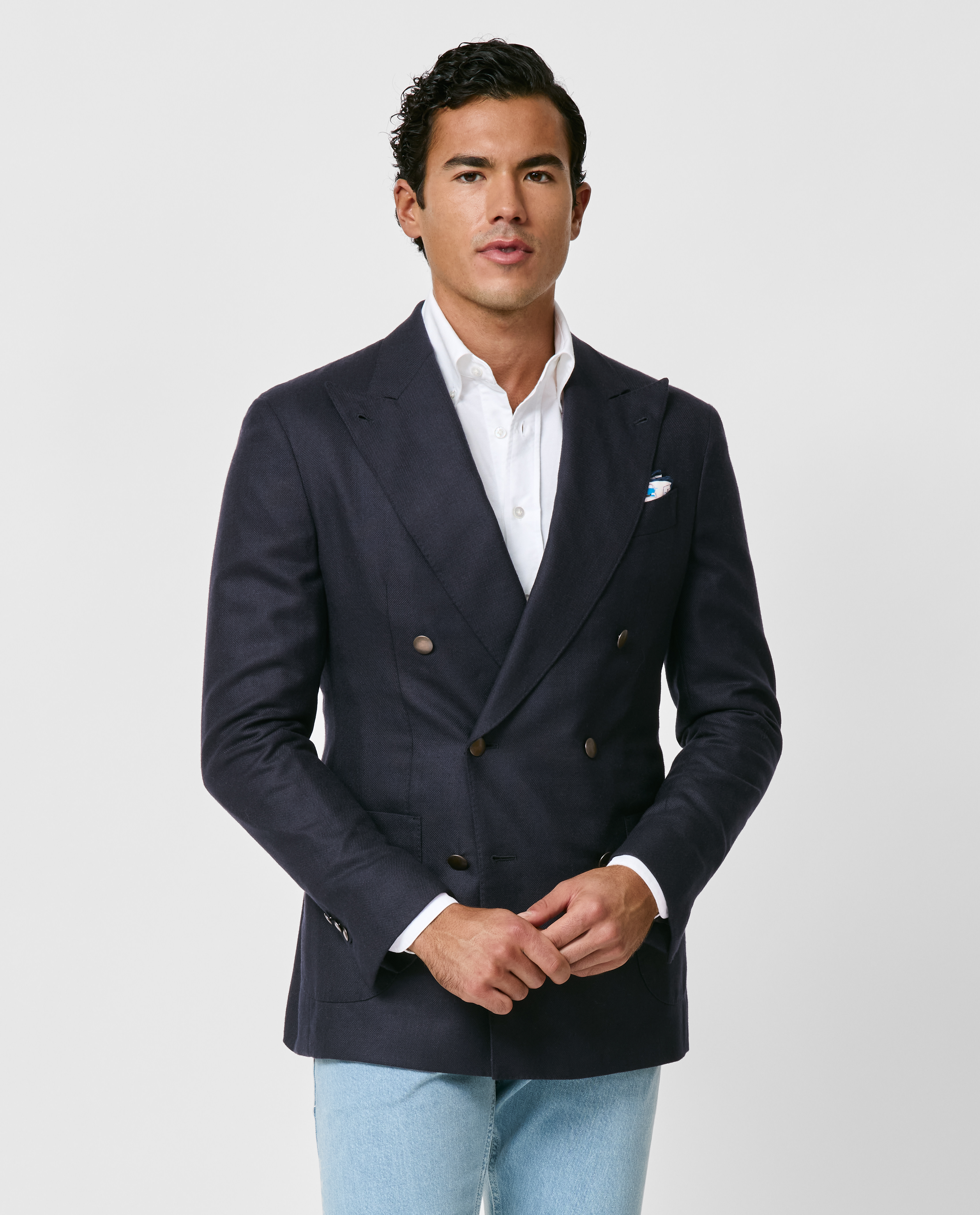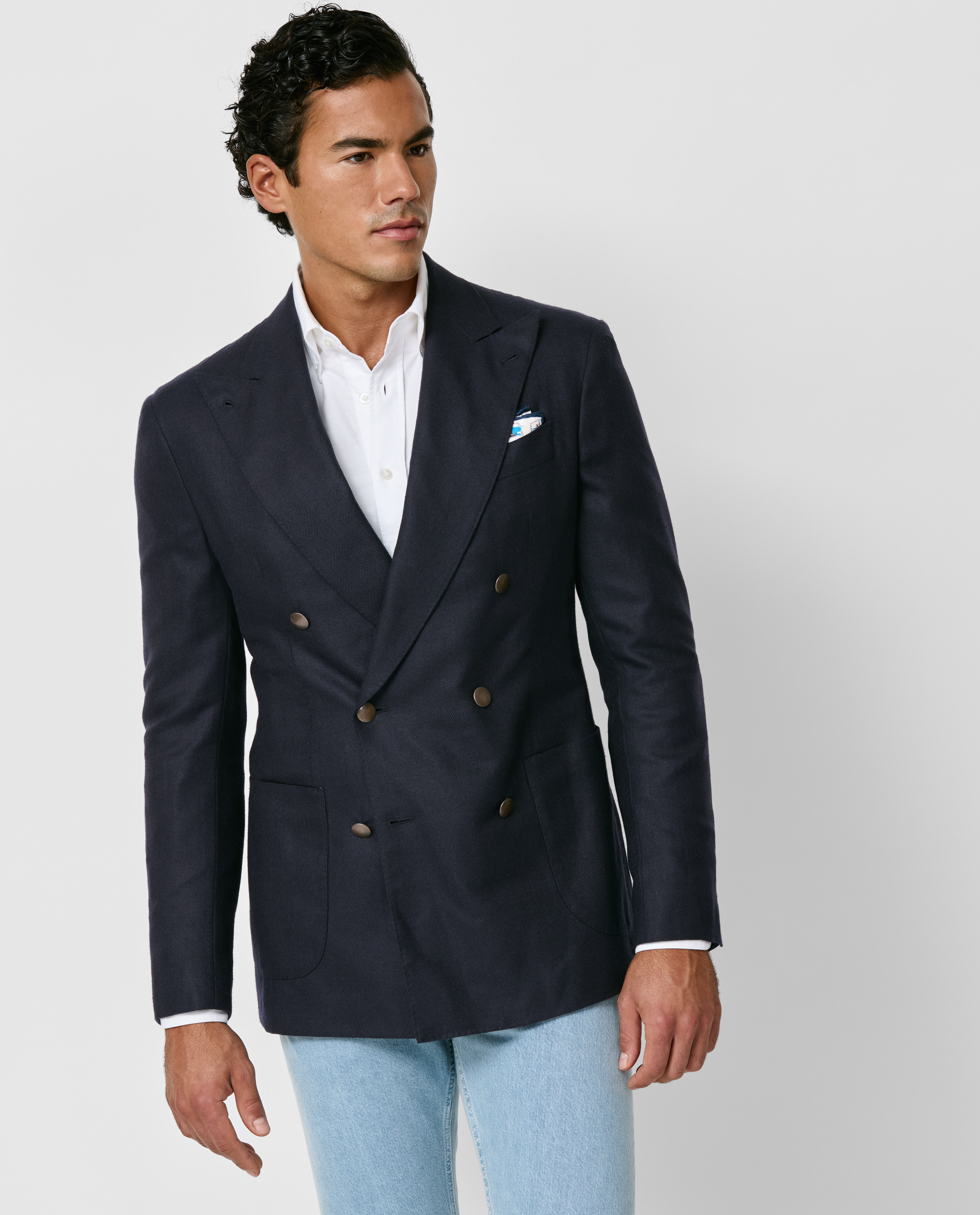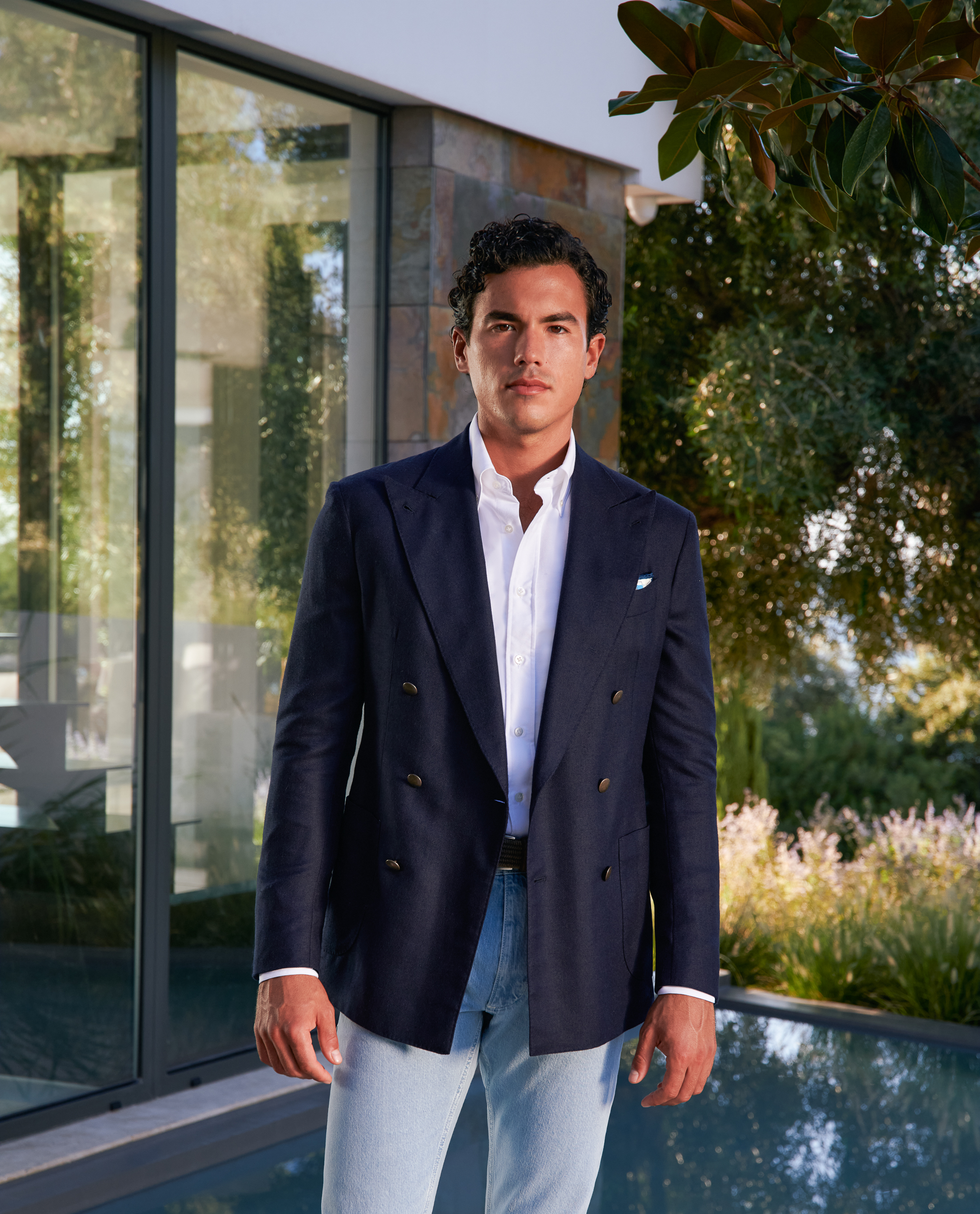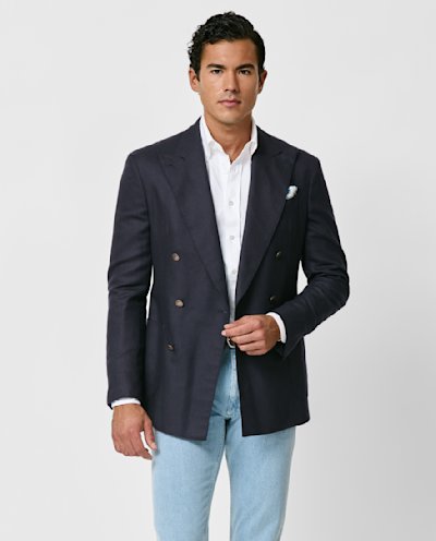 Crafted from a luxurious, four-season silk and wool basketweave with outstanding breathability and a soft handfeel, this navy blazer features a double-breasted closure, unconstructed shoulder, and patch side pockets. Pair it with a white shirt and jeans to create a polished smart-casual look. Prefer a different style? Every piece is made exclusively for you, with your choice of design options. Silk & wool Basketweave Luxurious Breathable Light four-season weight