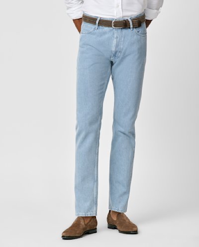 These light blue jeans are dyed and crafted by the famous Candiani mill. Made from 3x1 selvedge twill denim woven on original vintage shuttle looms and washed in the heart of Veneto to create a sophisticated, worn-in look. Dyed with all-natural indigo dyes–here in a gray cast. Make these jeans your own with our many customization options to choose from.