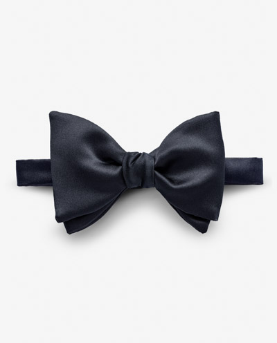 There is perhaps no more quintessential a choice for your nuptials than a navy blue tuxedo. Sporting peak lapels and styled traditionally from head to toe with a studded tuxedo shirt, midnight blue bow tie, matching cummerbund, and black patent tuxedo shoes.
