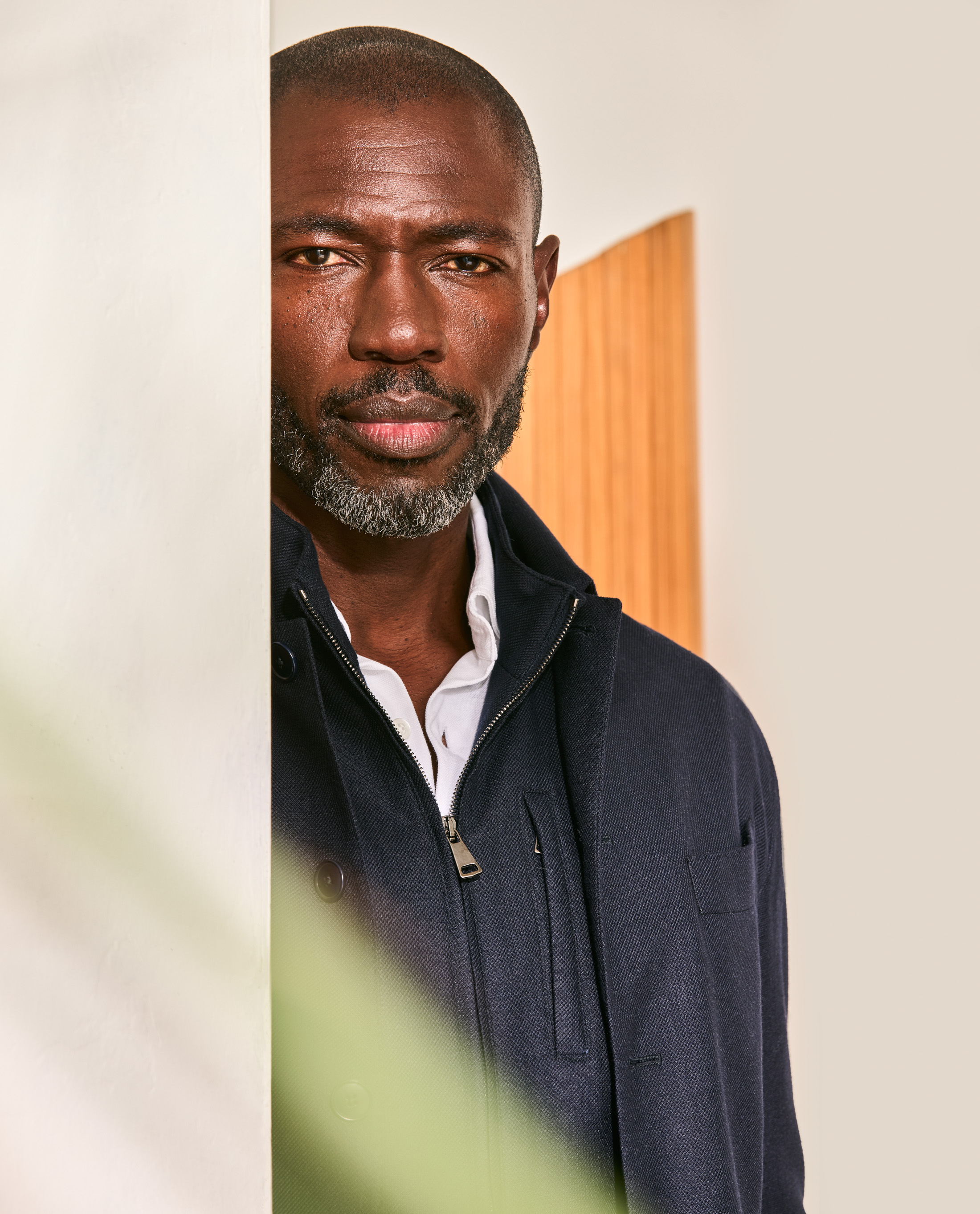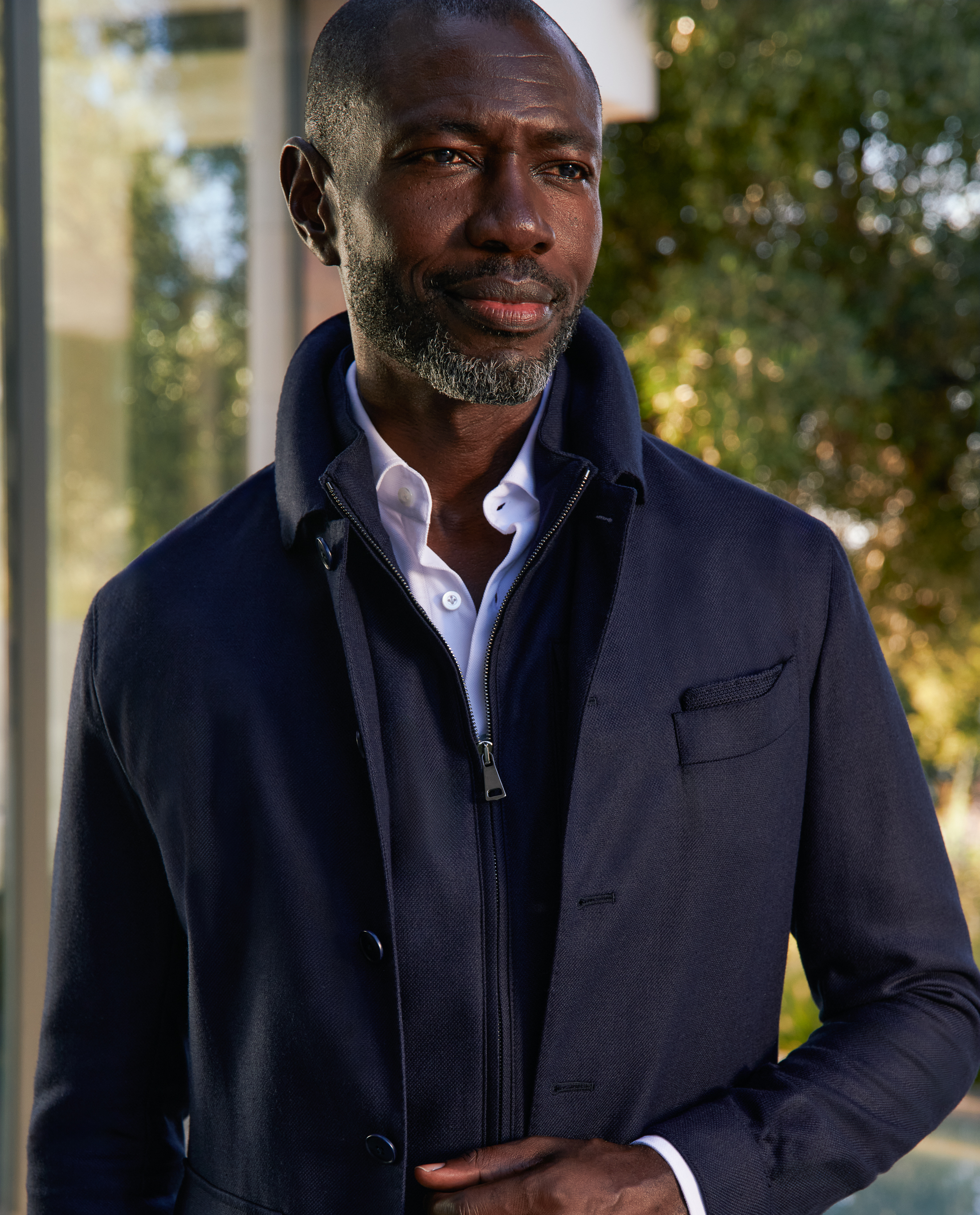Smart and relaxed, this is how you nail transitional dressing: in a matching utility jacket and two-way zip vest crafted from a chic, breathable blend of navy silk and wool. Layered but never bulky, this look features a white piqué knit button-up and light gray wool trousers for a style that’s equal parts sharp, adaptable, and airy.