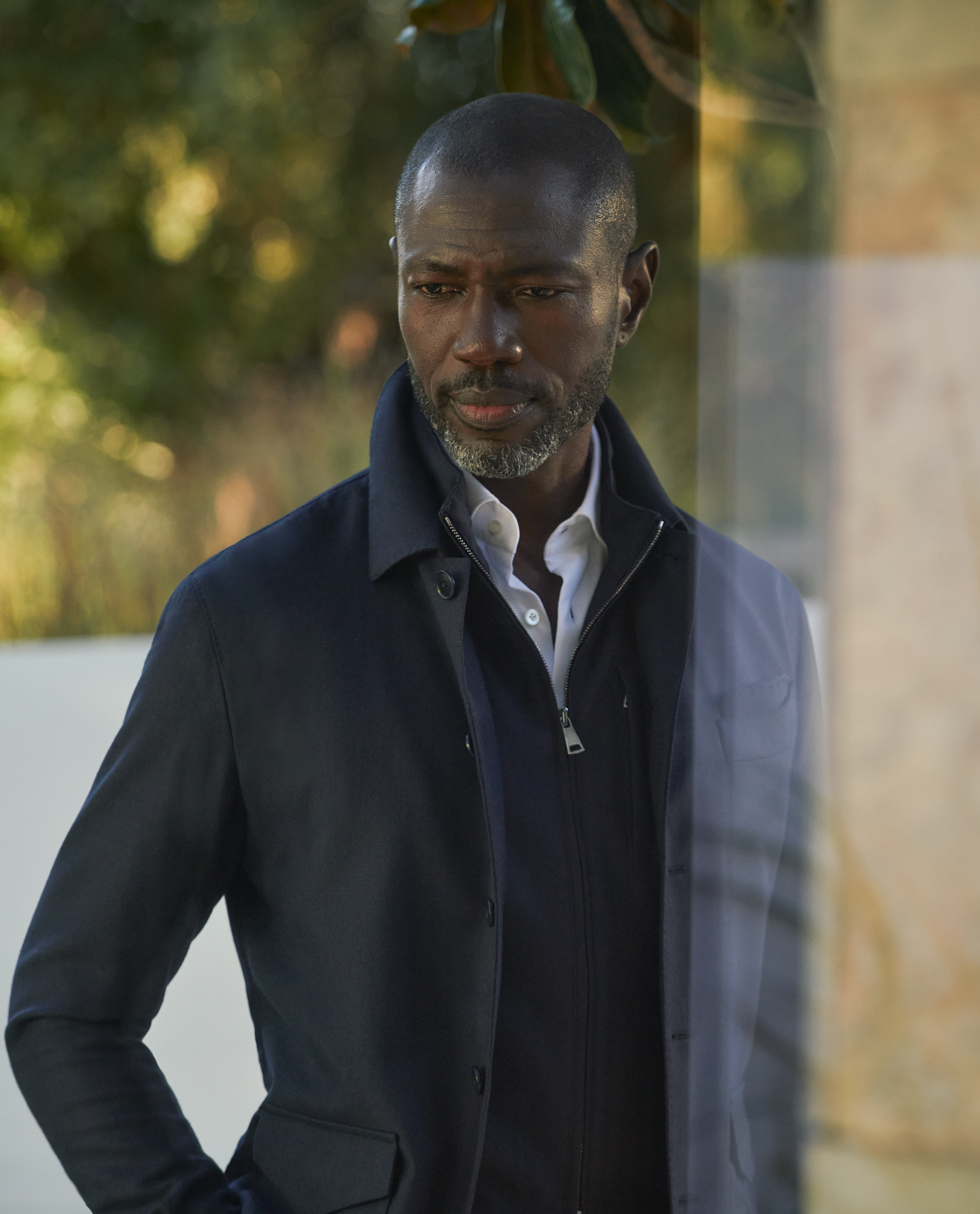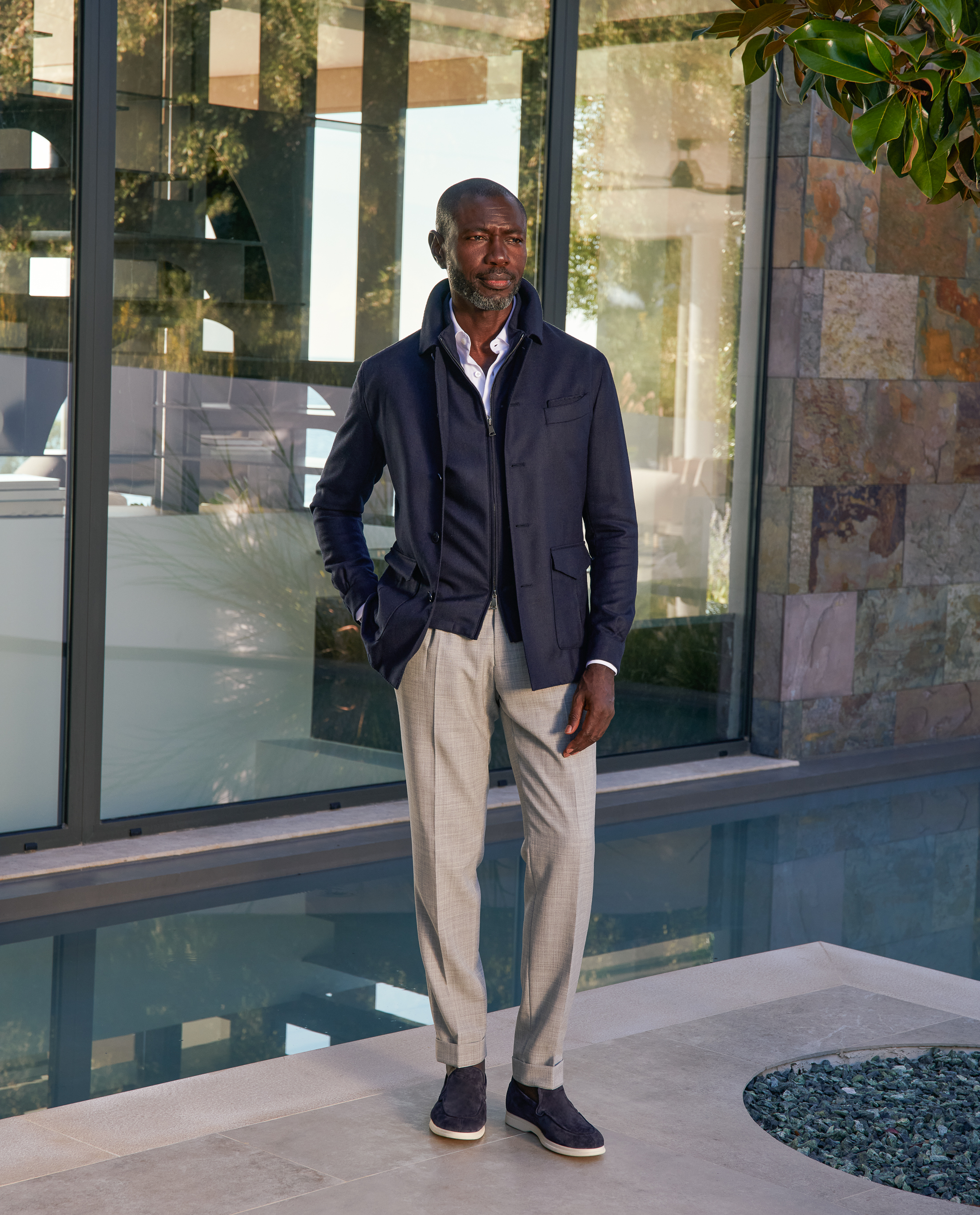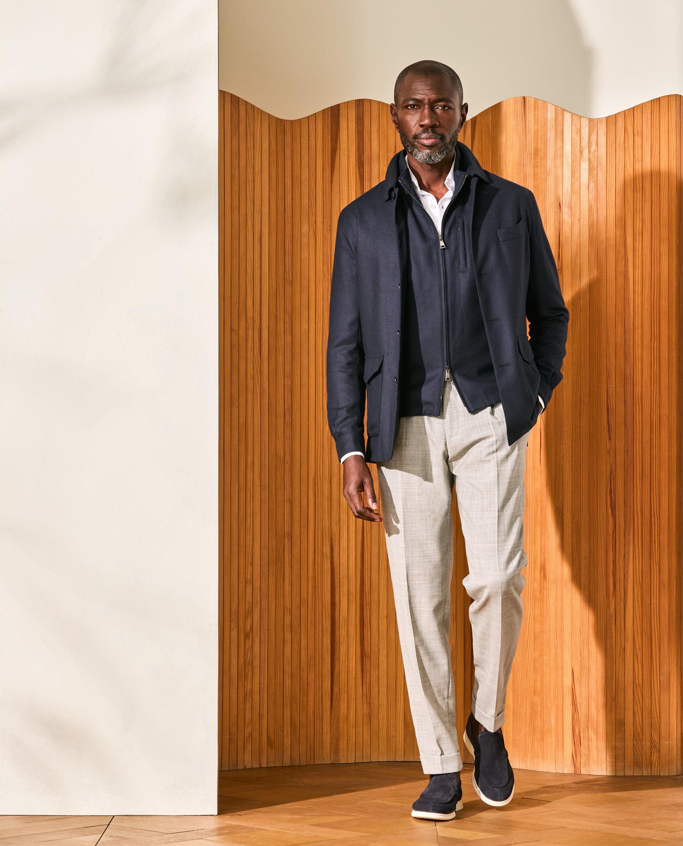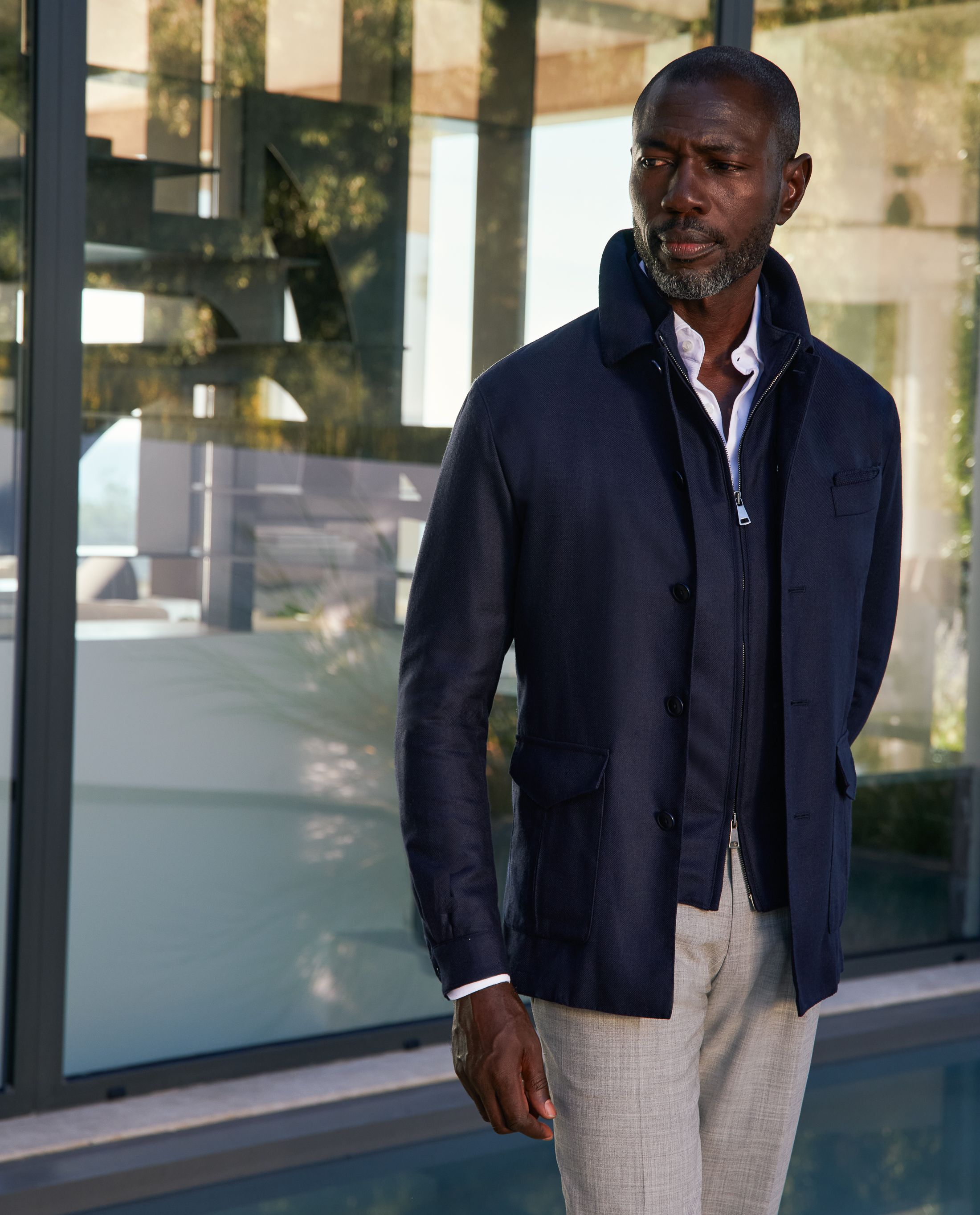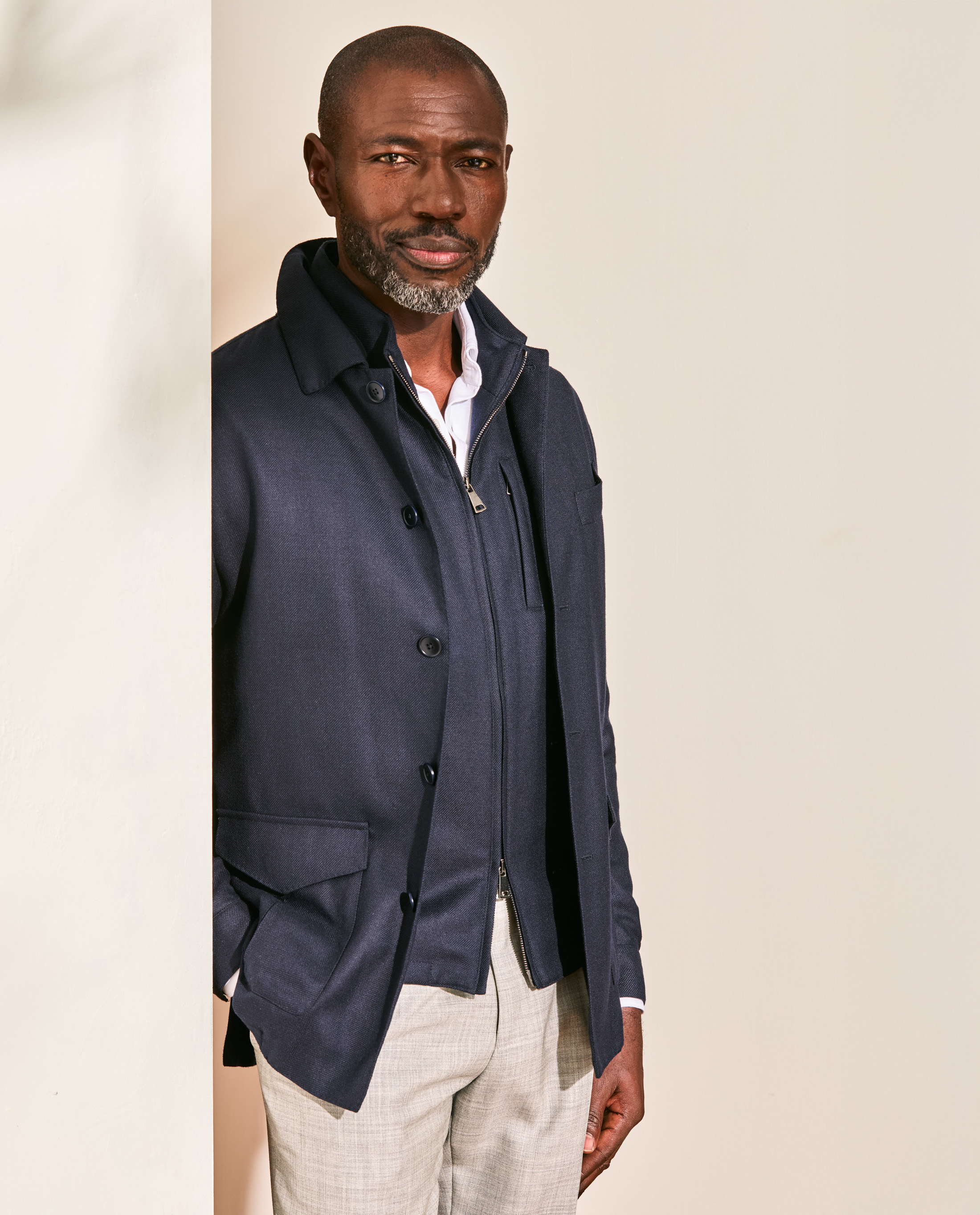 Crafted from a luxurious silk-wool navy basketweave with outstanding breathability and a soft handfeel, this lightweight utility jacket was designed with a 5-button closure, rounded welt chest pocket, and practical yet chic safari side pockets. Layer it over a matching two-way zip vest, white shirt, and light gray trousers to create a versatile smart-casual look.