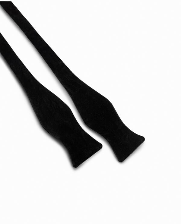 An elegant off-white bamboo jacket paired with contrasting black wool-mohair trousers. Simo plays on classic styling, with a white dot sateen shirt, black patent penny loafers, and black velvet bow tie.