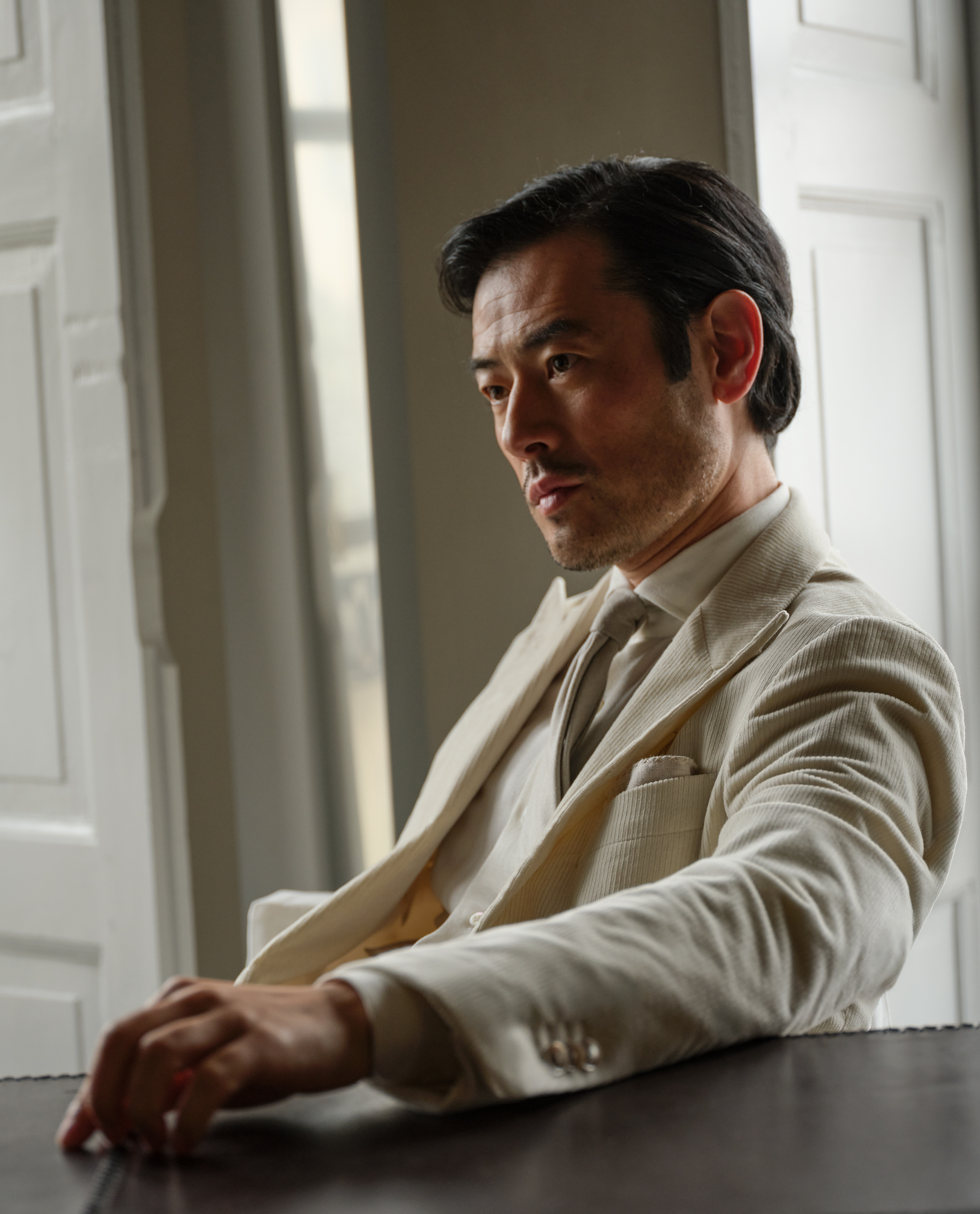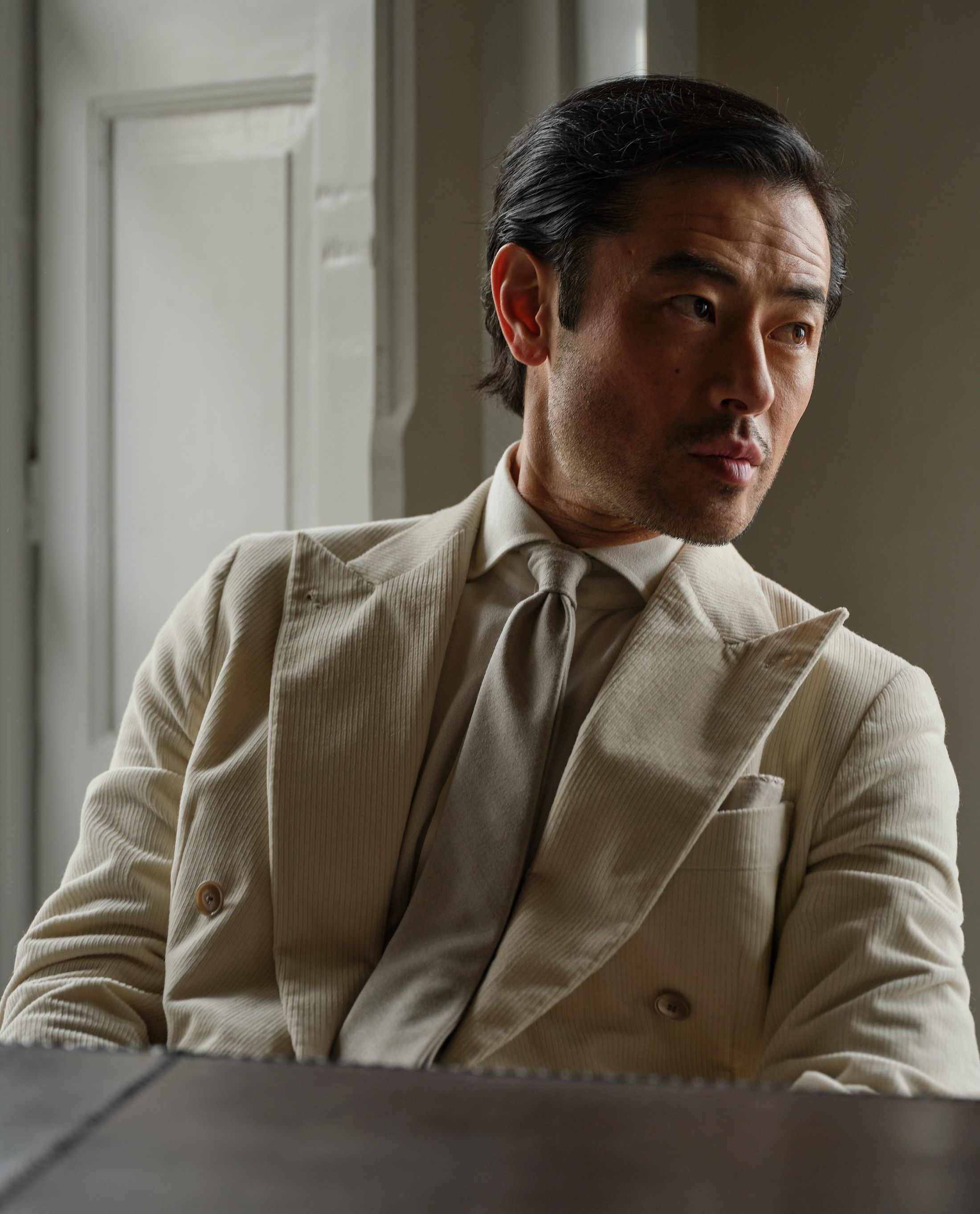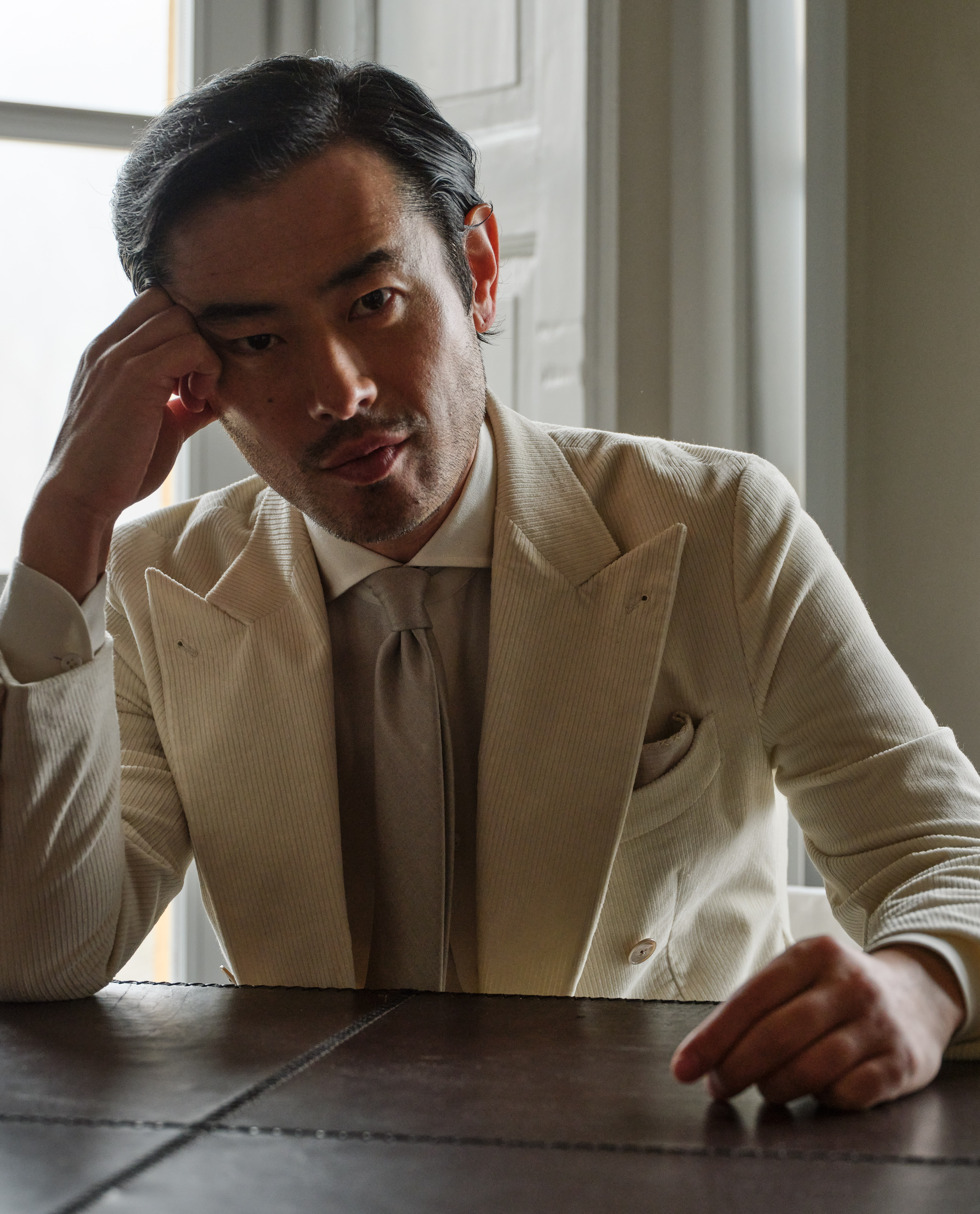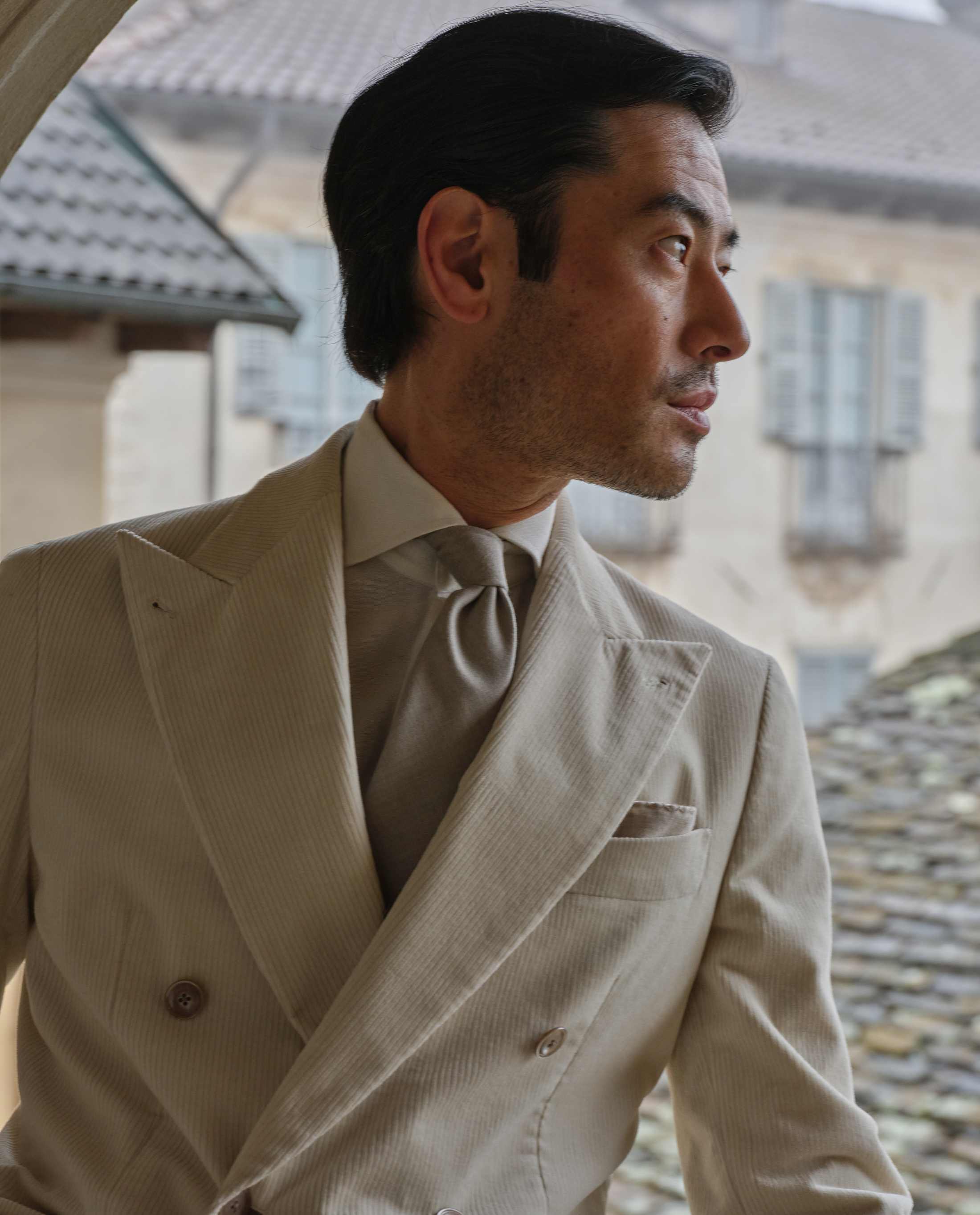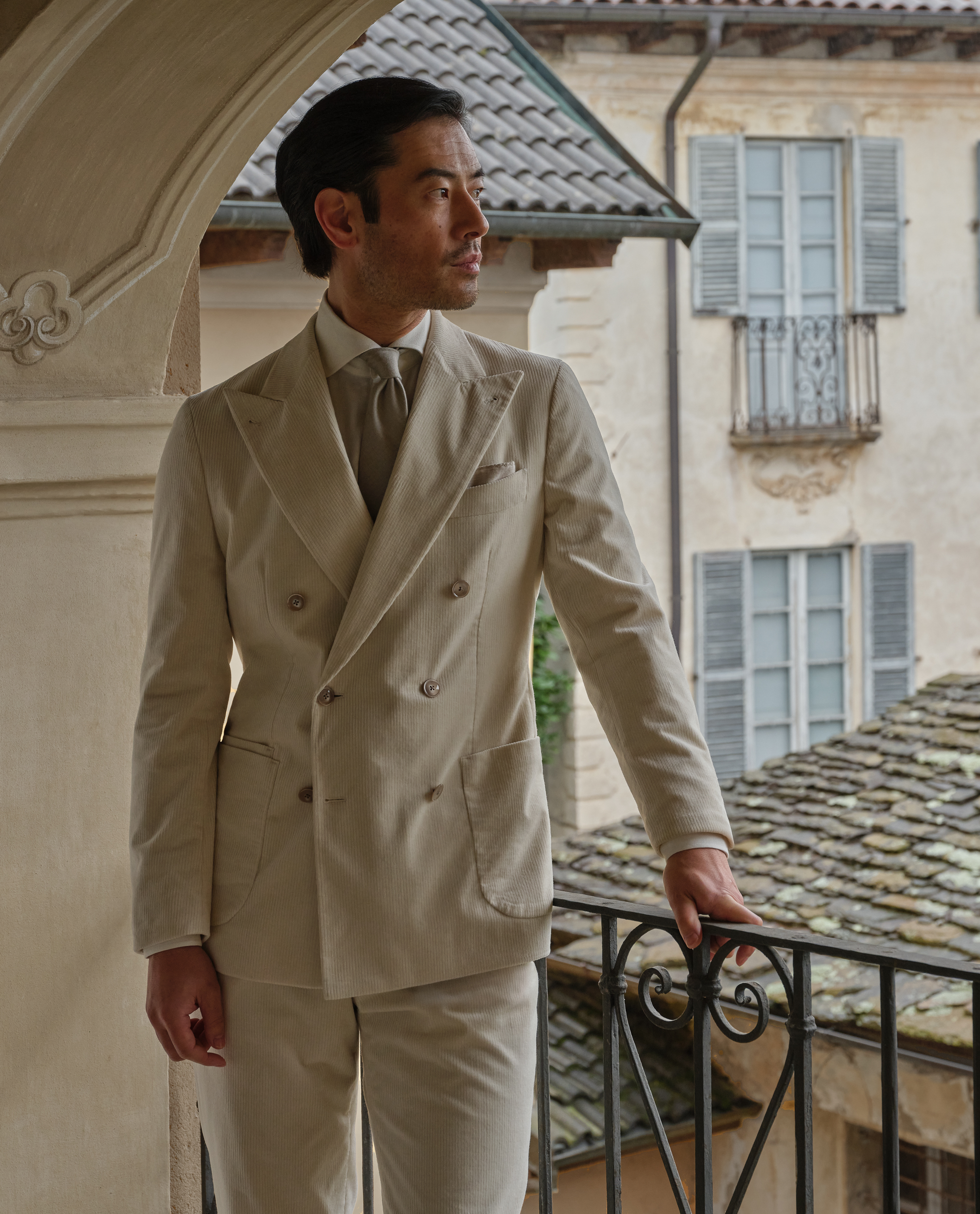 An ideal choice for cooler seasons, pair this off-white corduroy suit with an ivory mouliné modal and wool shirt for added warmth. Style with accessories in a complementary palette: white pocket square, oatmeal tie, and chocolate brown loafers.