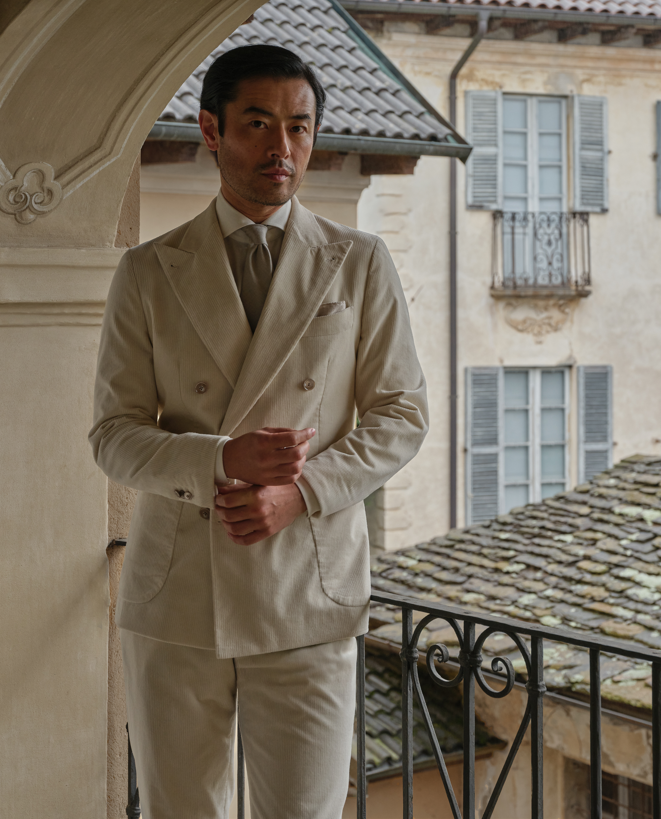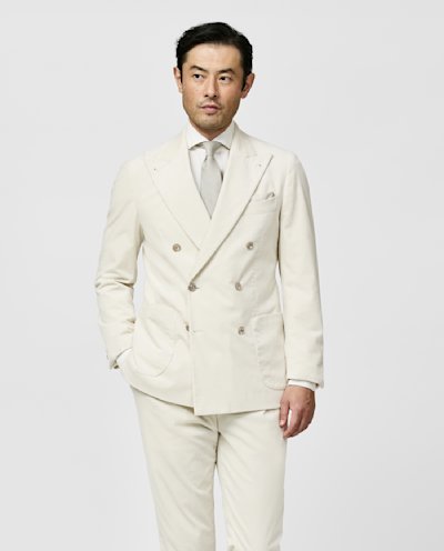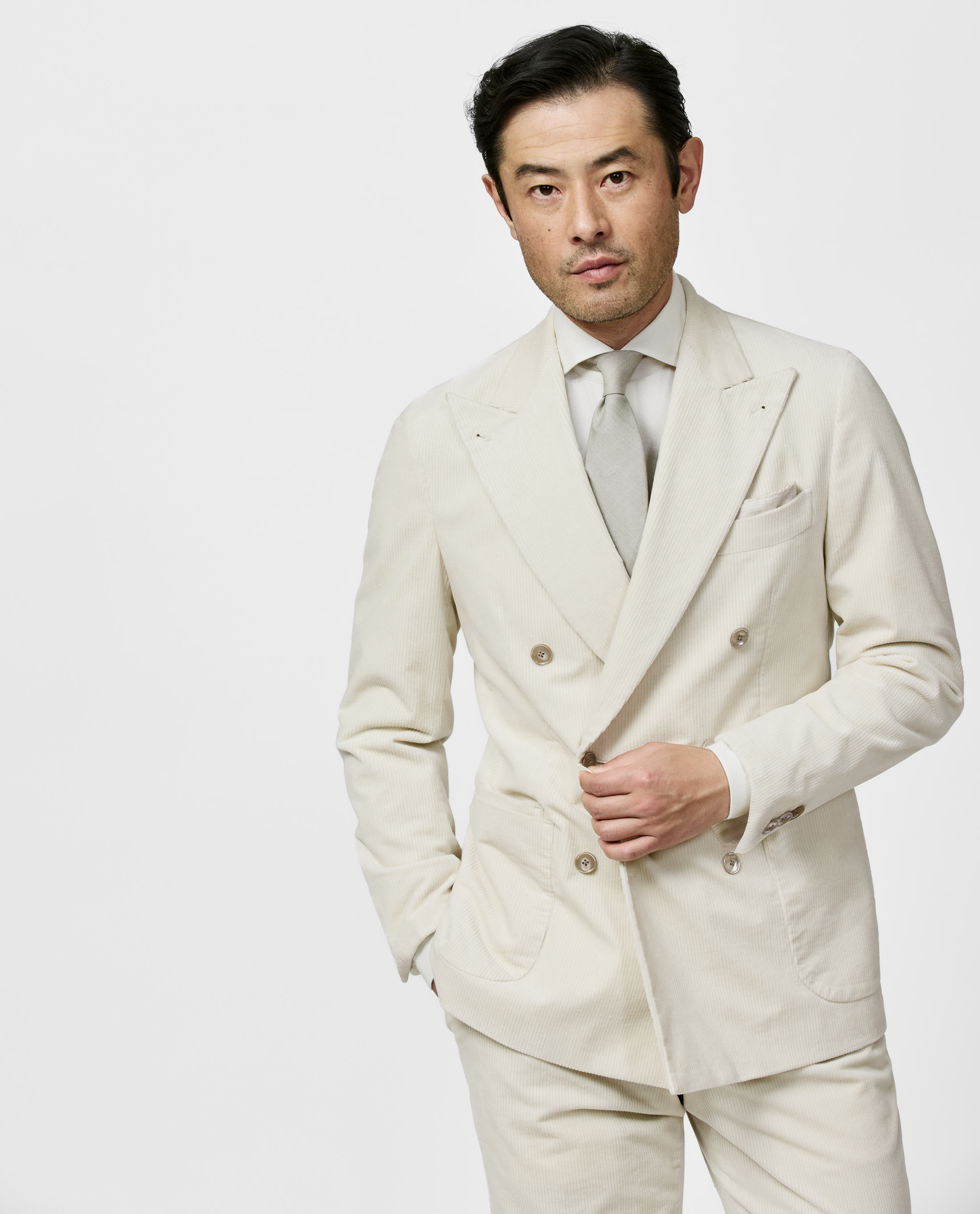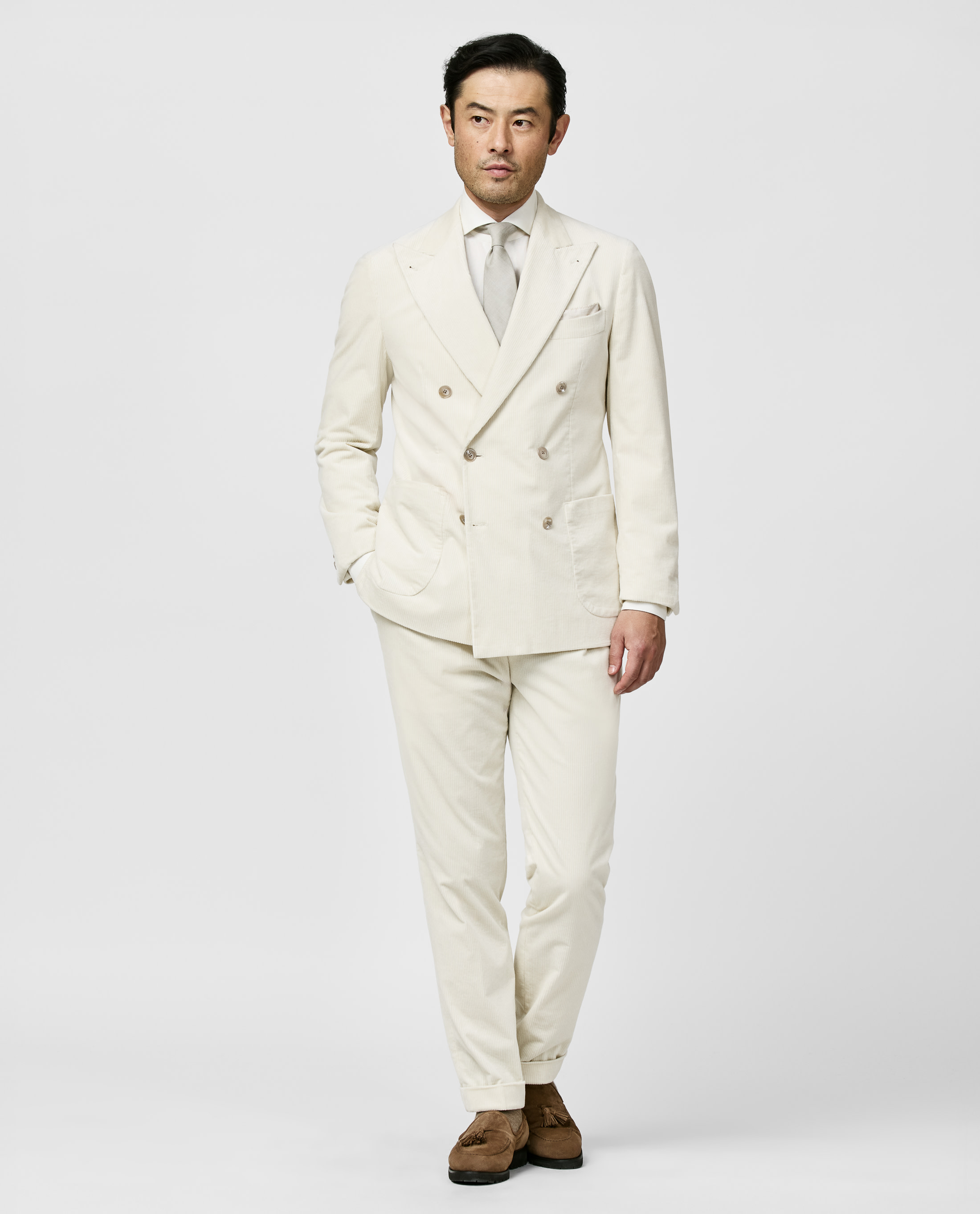 This off-white corduroy suit effortlessly combines comfort and durability, making it a wardrobe staple for cooler seasons. The marbled dyeing process gives the fabric a distinctive finish, while its fluidity ensures breathable warmth – ideal for fall and winter. Designed as a two-piece suit, it features a double-breasted jacket with six buttons, a peak lapel, and patch side pockets. Pair it with an ivory shirt, tie, pocket square, and chocolate brown tassel loafers for a truly refined appearance. Make this suit your own with our many customization options to choose from.