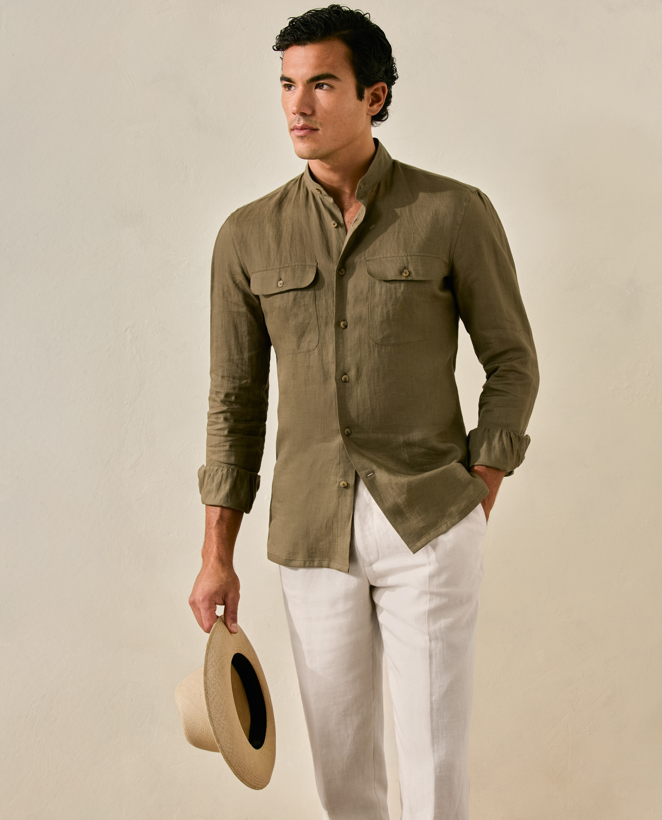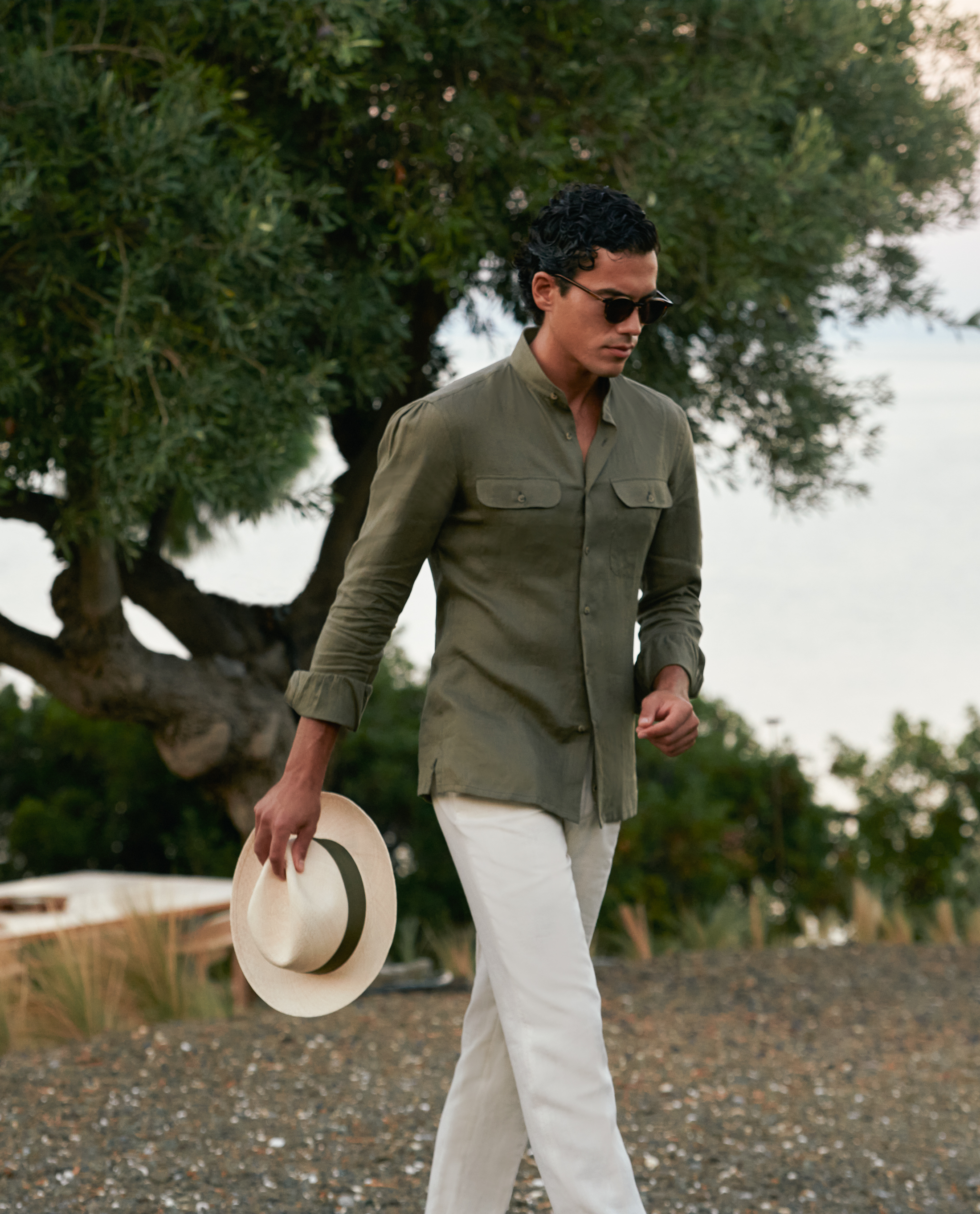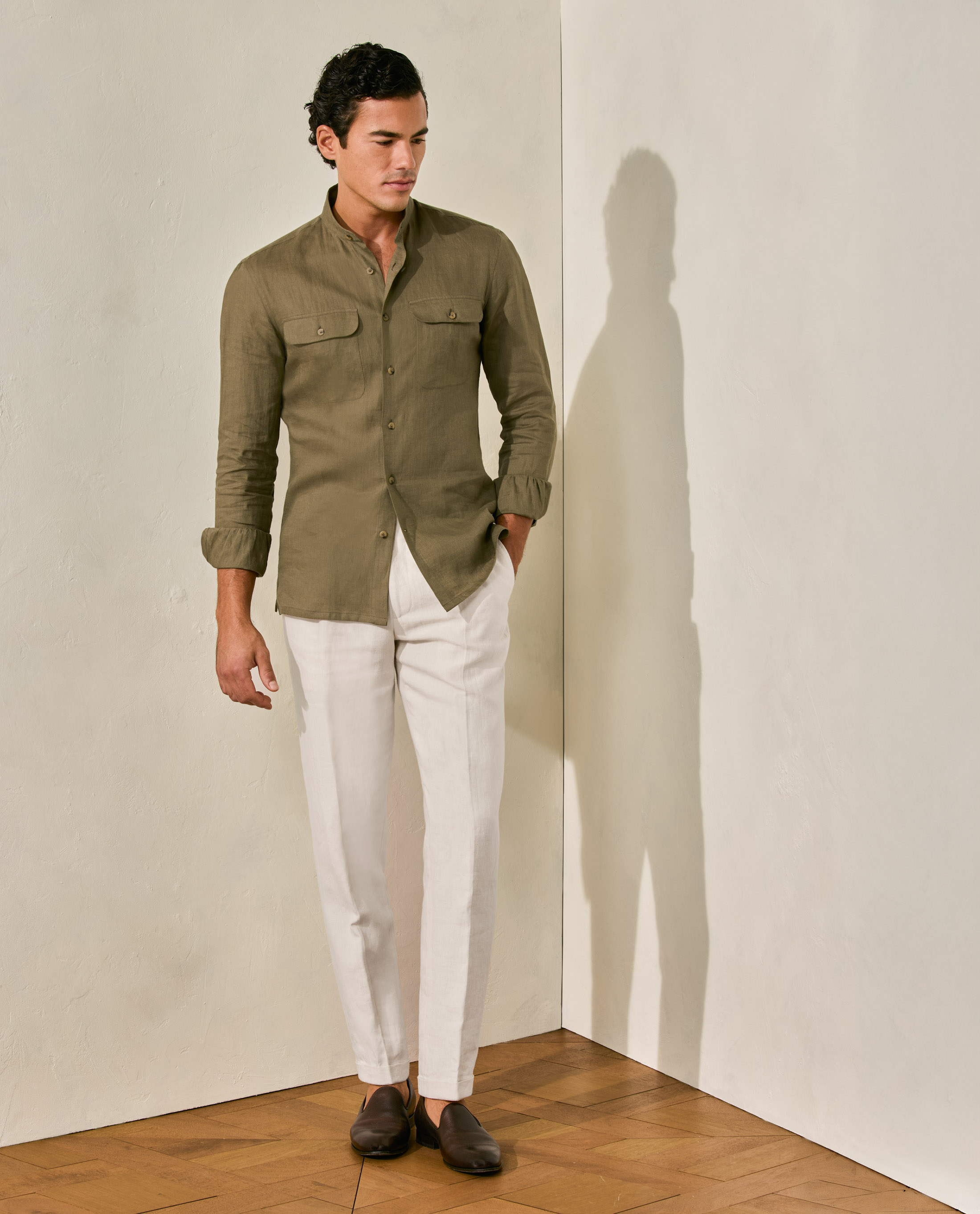 Soak up the sun in this cooling, relaxed-chic 100% linen look, exuding a distinct sense of understated elegance. No jacket needed: the olive green linen shirt with chest pockets and sand linen trousers provide all the style you need, finished with dark brown calfskin loafers for a timeless touch.