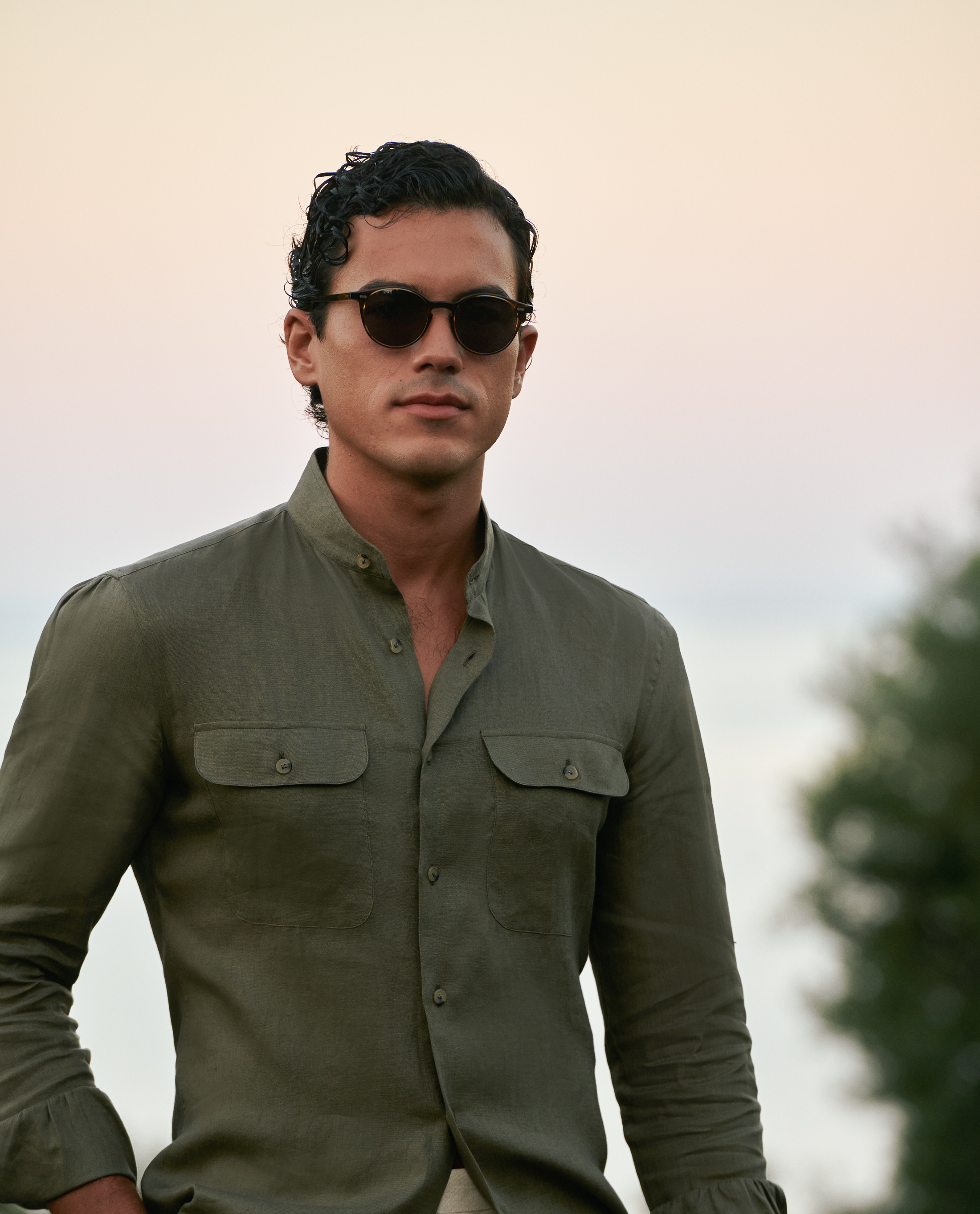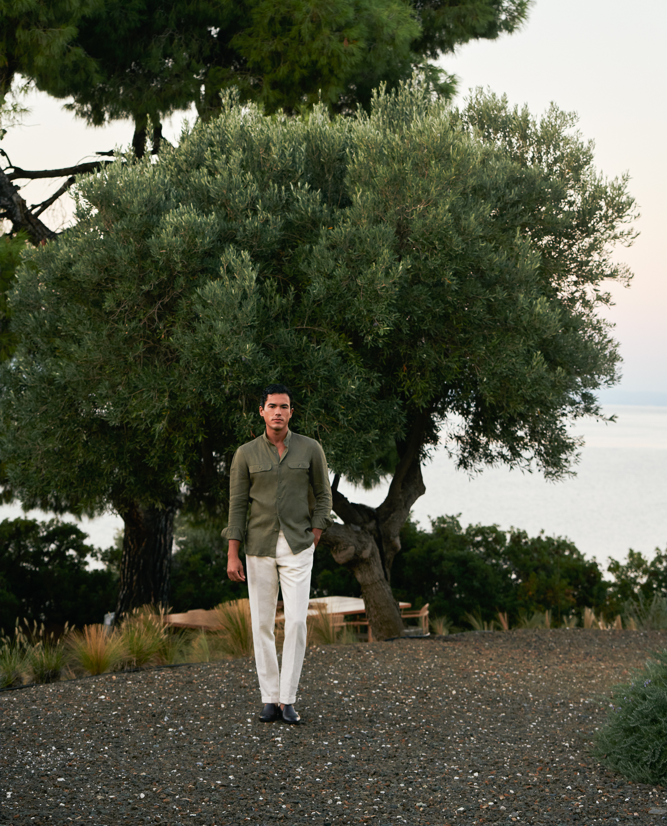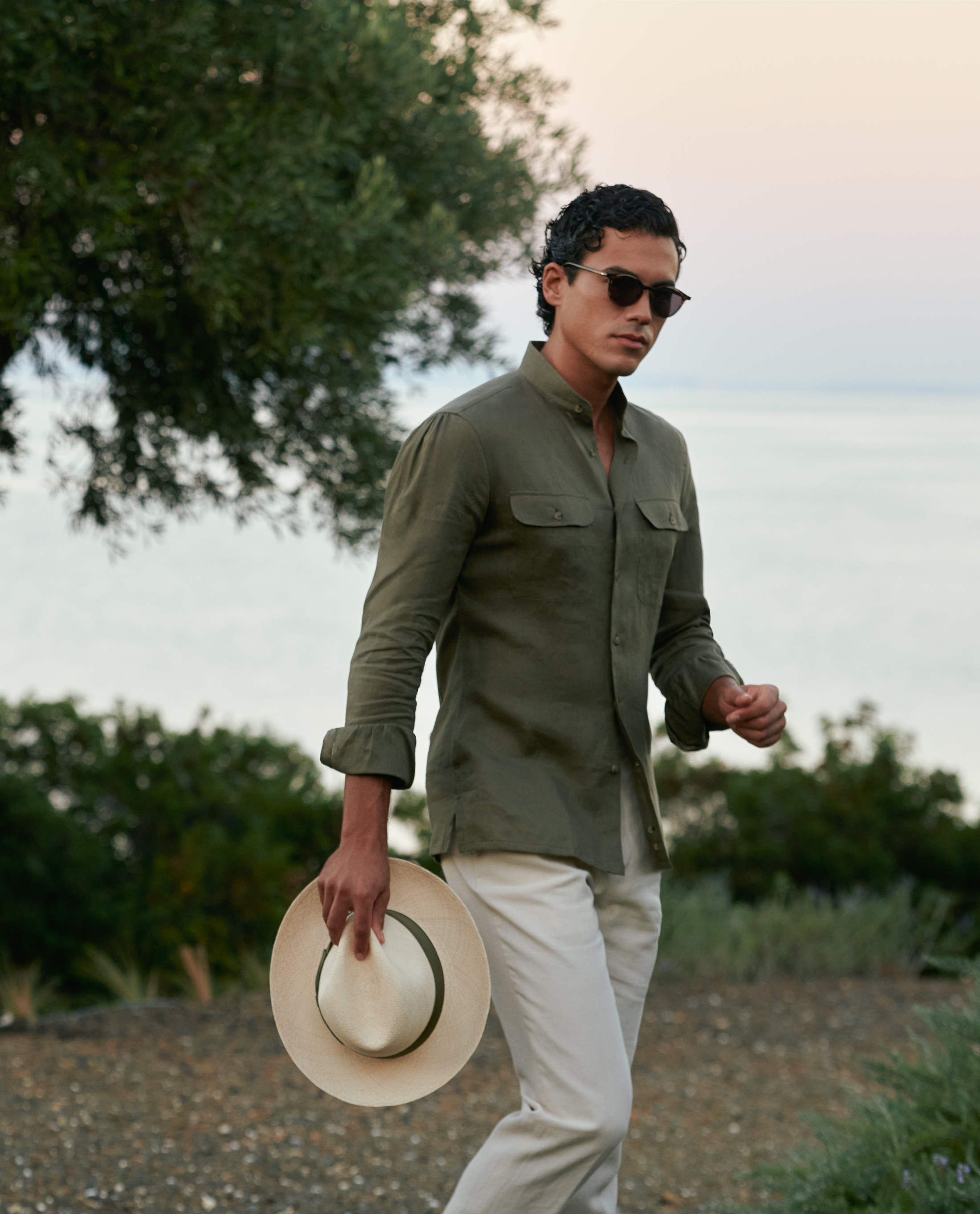 Soak up the sun in this cooling, relaxed-chic 100% linen look, exuding a distinct sense of understated elegance. No jacket needed: the olive green linen shirt with chest pockets and sand linen trousers provide all the style you need, finished with dark brown calfskin loafers for a timeless touch.