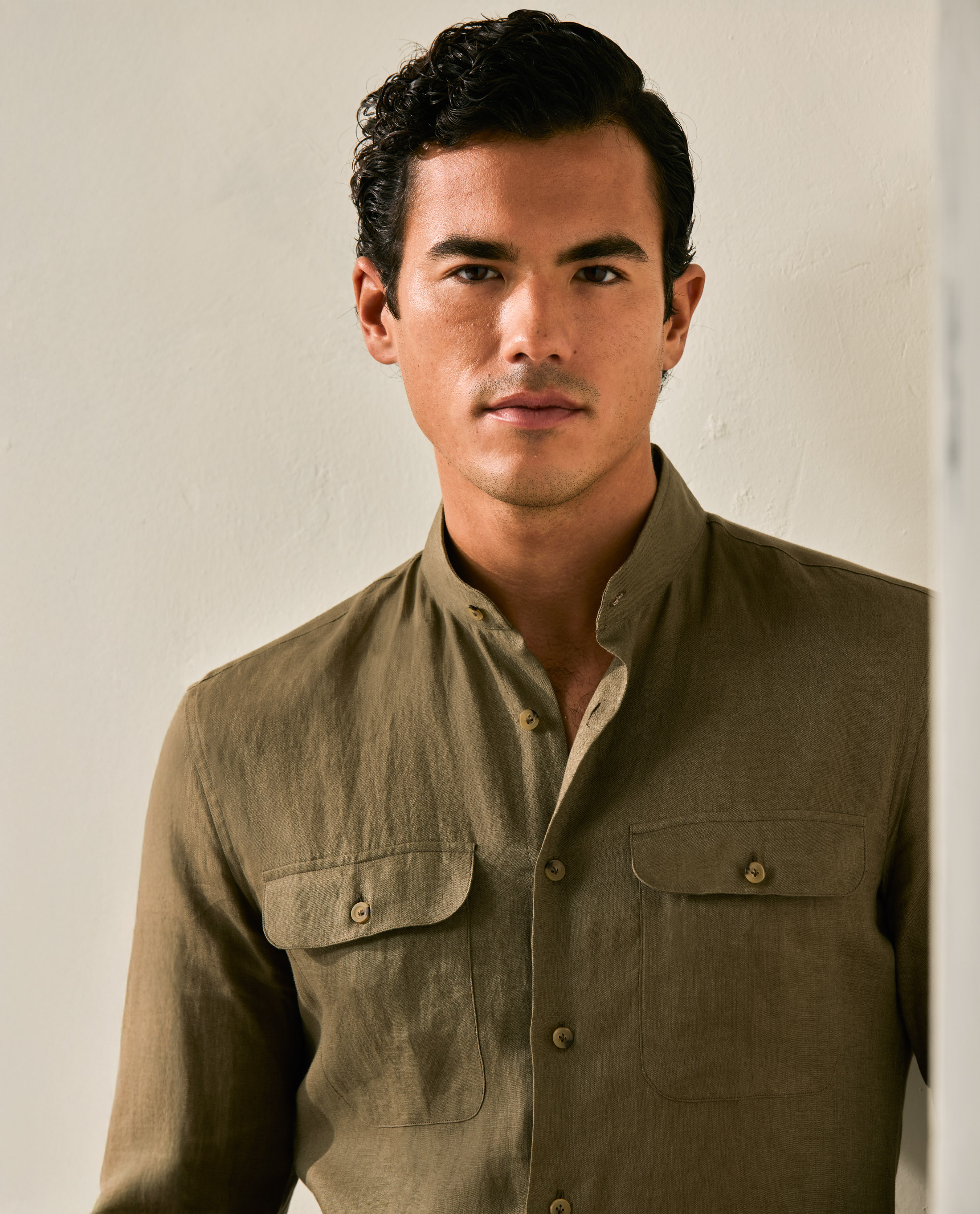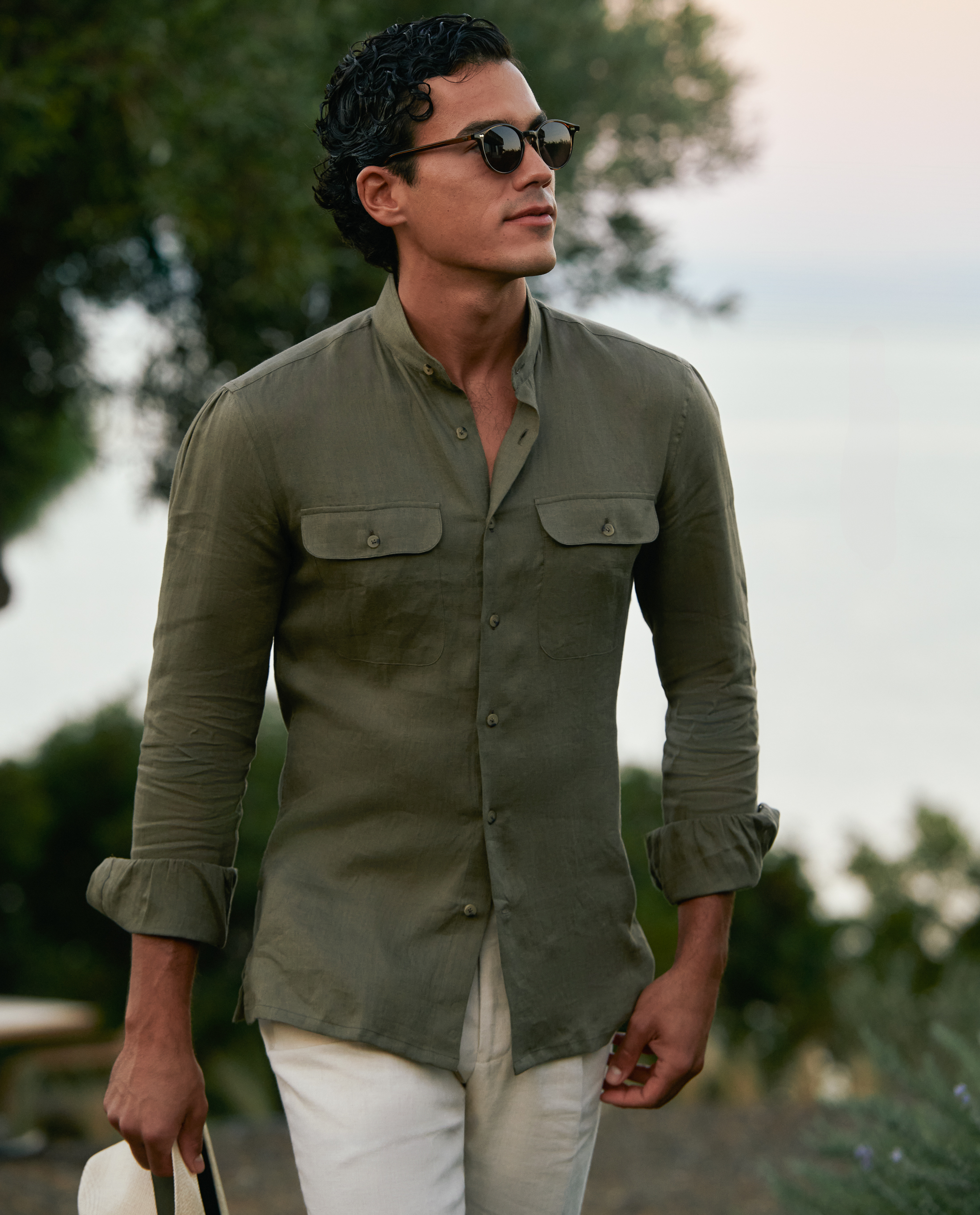 Crafted from ultra-cooling linen batiste, known for its crisp, earthy look and airy, lightweight feel, this olive green linen shirt delivers maximum breathability and comfort in warmer climates. Designed here with a chic Mao collar and 2 casual patch pockets with flap to create a refined yet relaxed summer aesthetic. Prefer a different style? Every piece is made exclusively for you, with your choice of design options. 100% linen Plain weave Crisp Breathable Lightweight feel