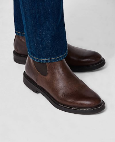 These dark brown boots are a complete classic. Handmade with vegetable-tanned grain calfskin to enhance the hide’s natural creases and veins for added character. Designed here as a Chelsea boot. Make these shoes your own with our many customization options to choose from. Handmade Grain calfskin leather Vegetable tanned Natural creases