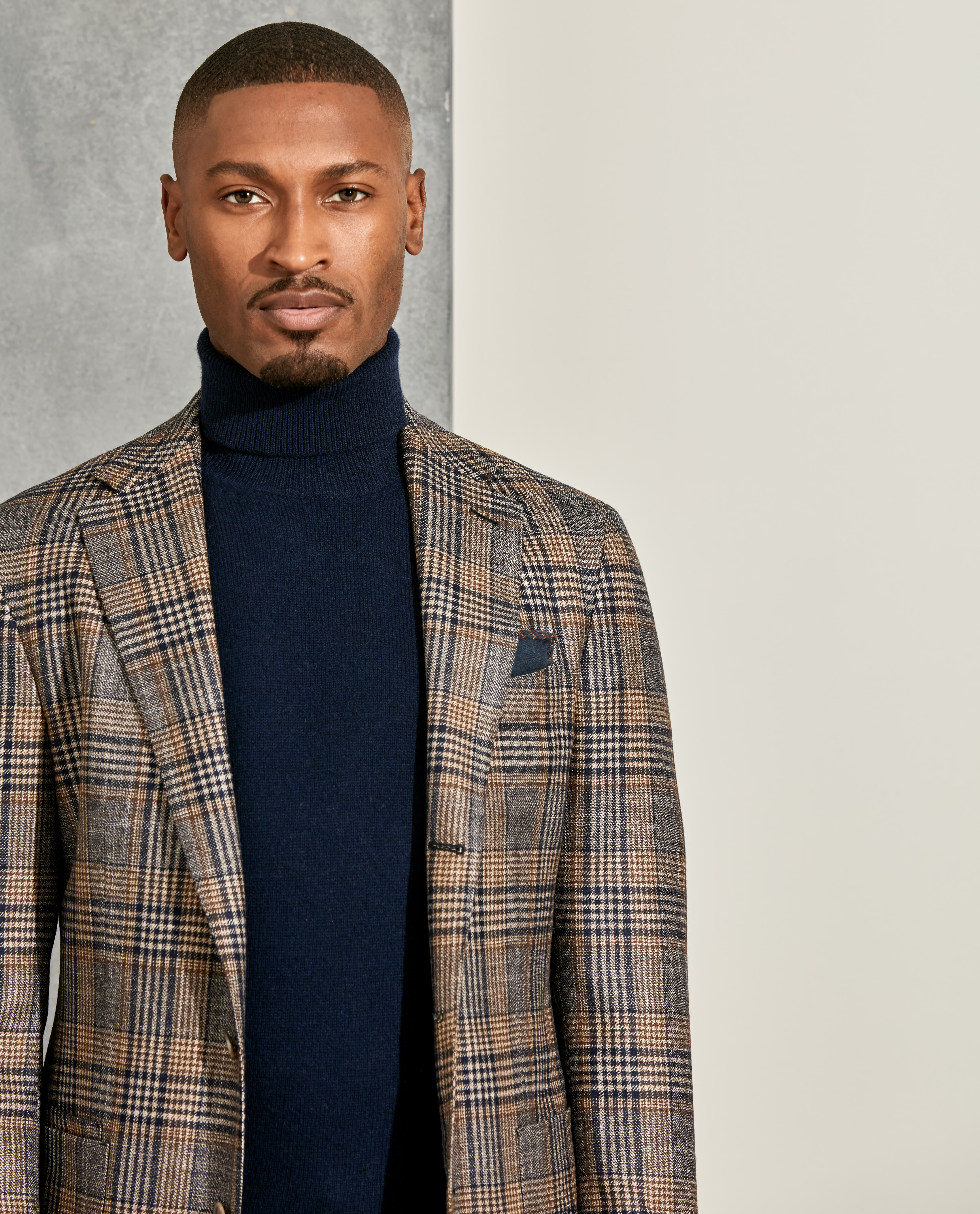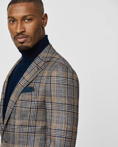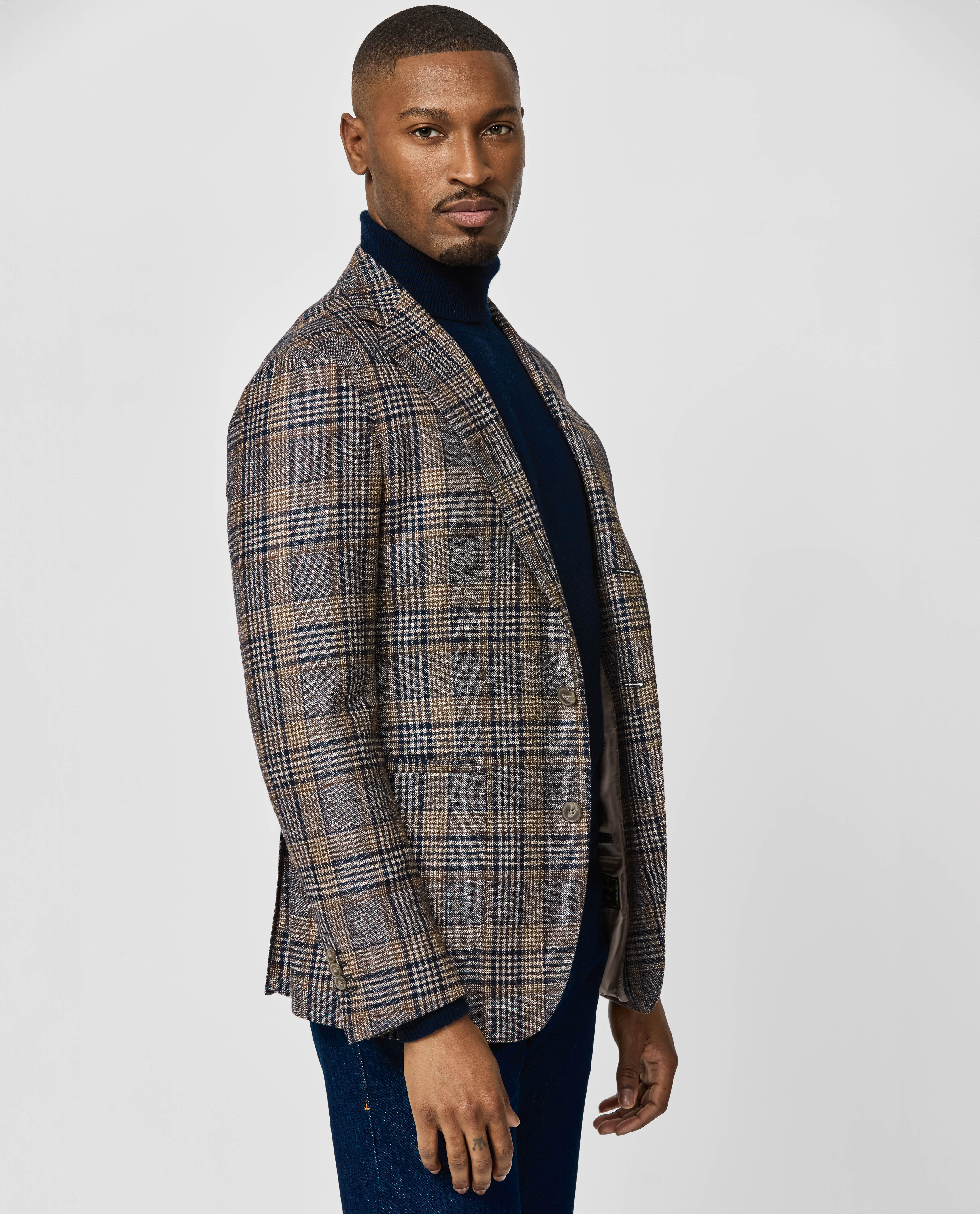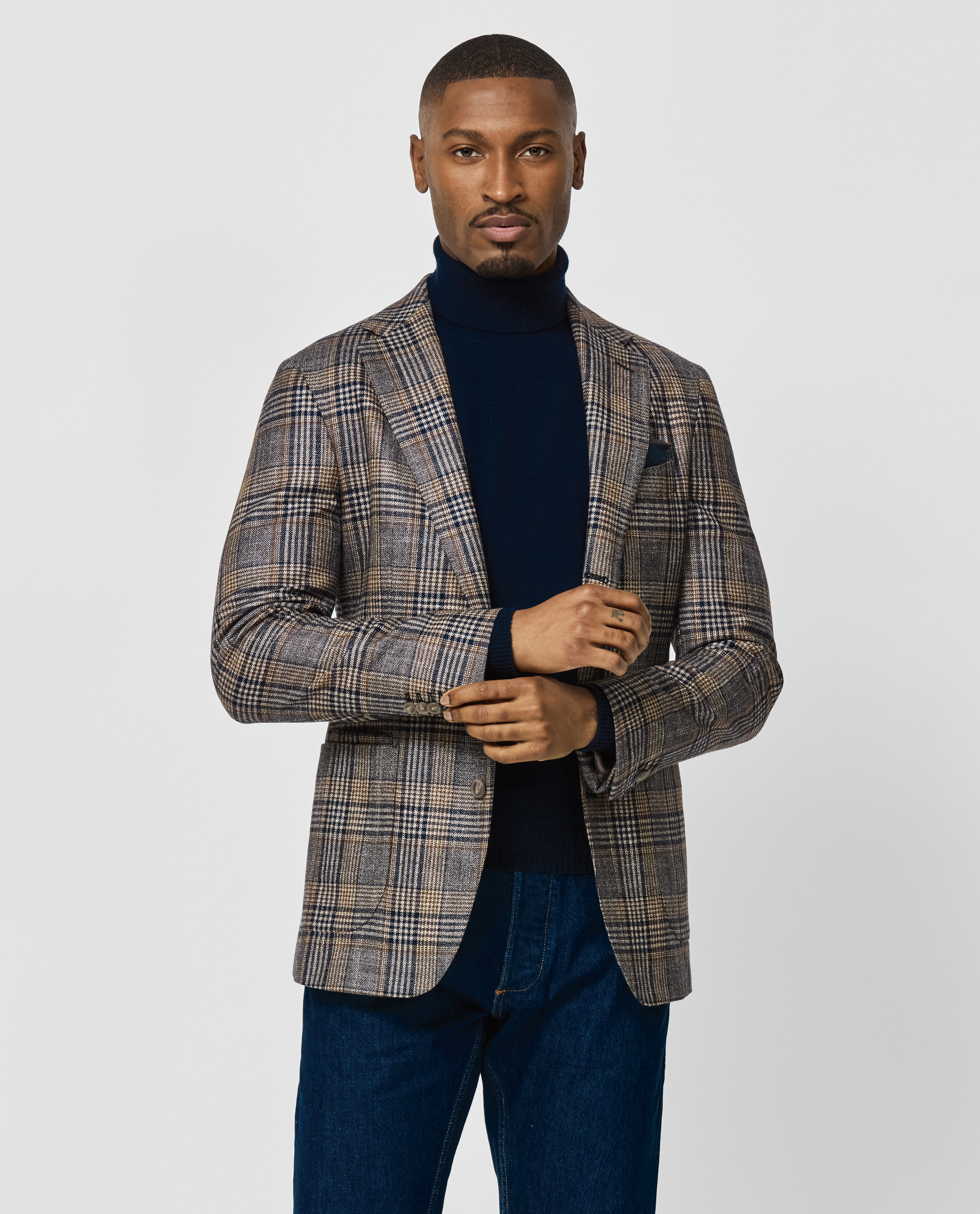 This chestnut brown jacket with a navy plaid offers lustrous winter style. Crafted from Silk Air® fabric made in Italy by Loro Piana. The soft and slubbed blend of merino wool, silk, and cashmere is lightweight and breathable with a textured look. Designed here with low-gorge lapels. Style it with a dark blue knit, selvedge jeans, and Chelsea boots to complete the look. Make this jacket your own with our many customization options to choose from. Wool, silk, & cashmere Glen plaid Lightweight Breathable Soft feel