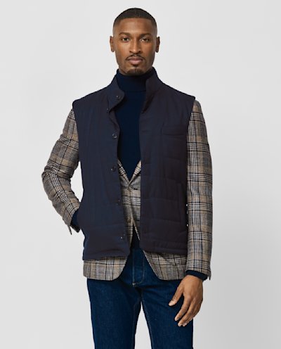 When temperatures drop, pop this midnight blue quilted vest over your knit to stay cozy. The supremely practical layer will keep your body warm while keeping your arms free. Made from pure wool flannel and padded with 100% eco-down sourced from recycled plastic bottles. Designed here with a 5-button closure and slanted welt side pockets. Style it with a navy knit, blue jeans, and calfskin boots to complete the look. Make this vest your own with our many customization options to choose from. S120 wool Flannel Natural stretch Eco-down padding