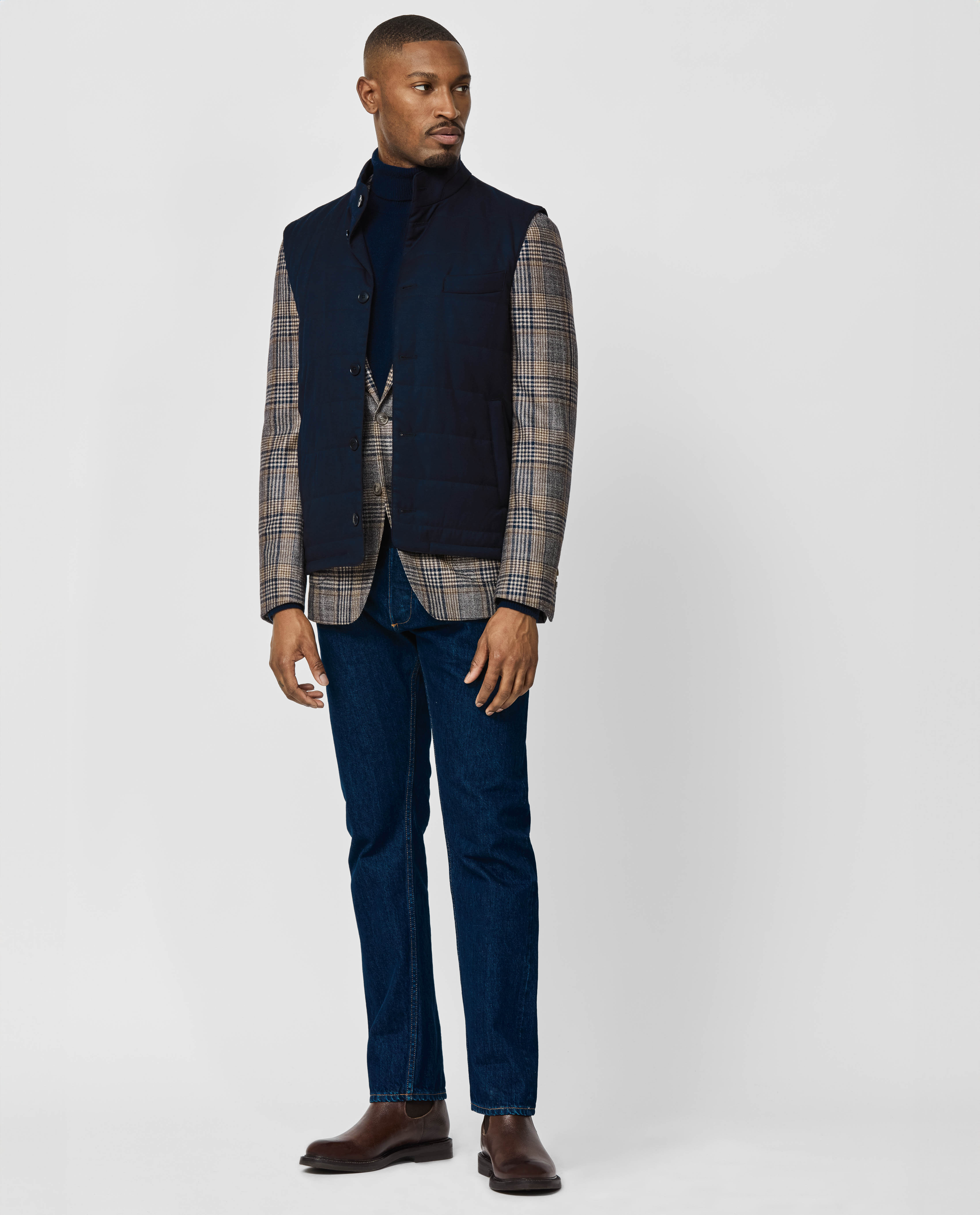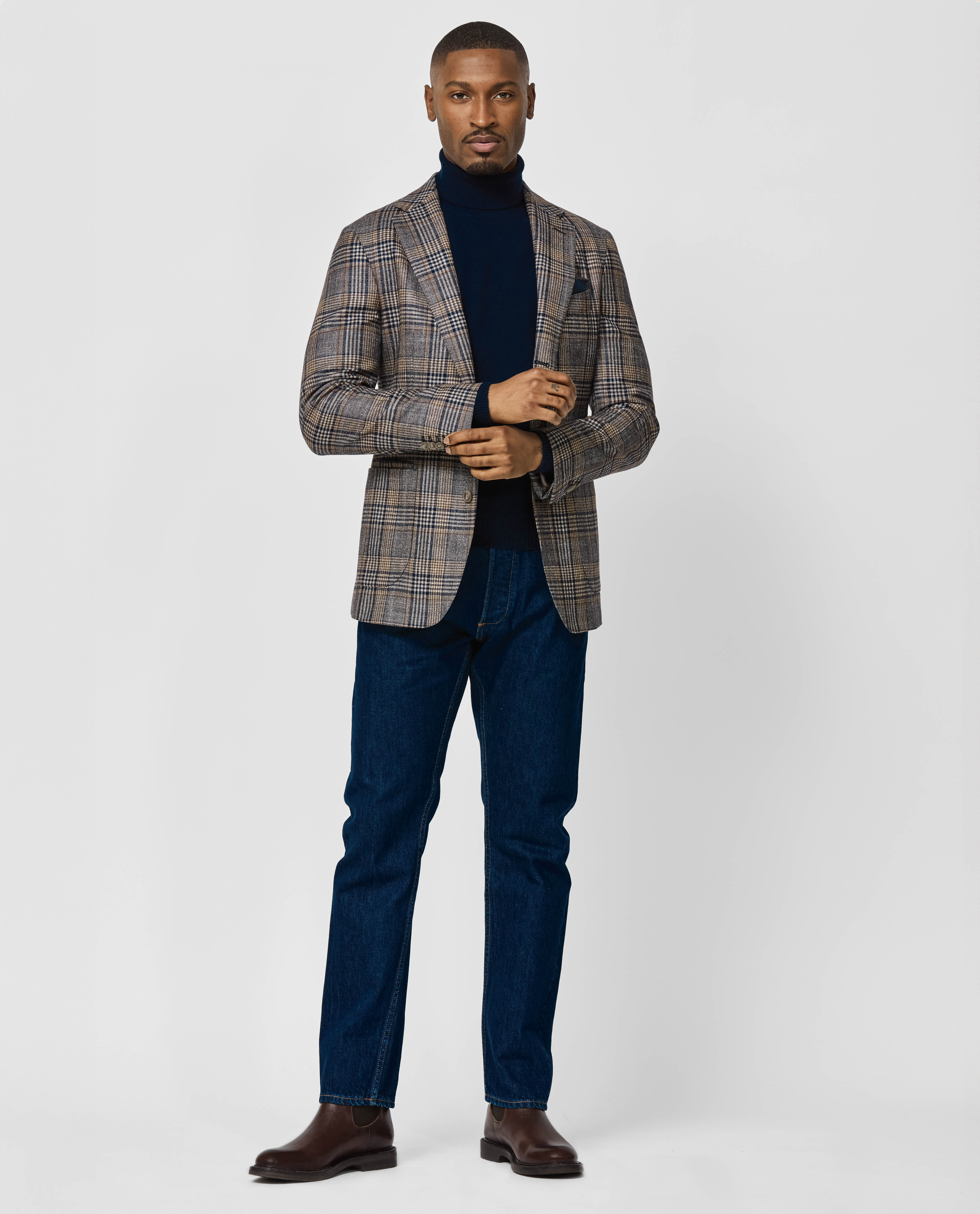 When selecting your essentials, a shared color palette will maximize your ability to mix and match. Case in point: this luxurious wool-silk-cashmere jacket in a striking navy and chestnut plaid layered under a midnight blue quilted vest and over a navy turtleneck knit, dark blue selvedge jeans, a blue pocket square, and dark brown Chelsea boots.