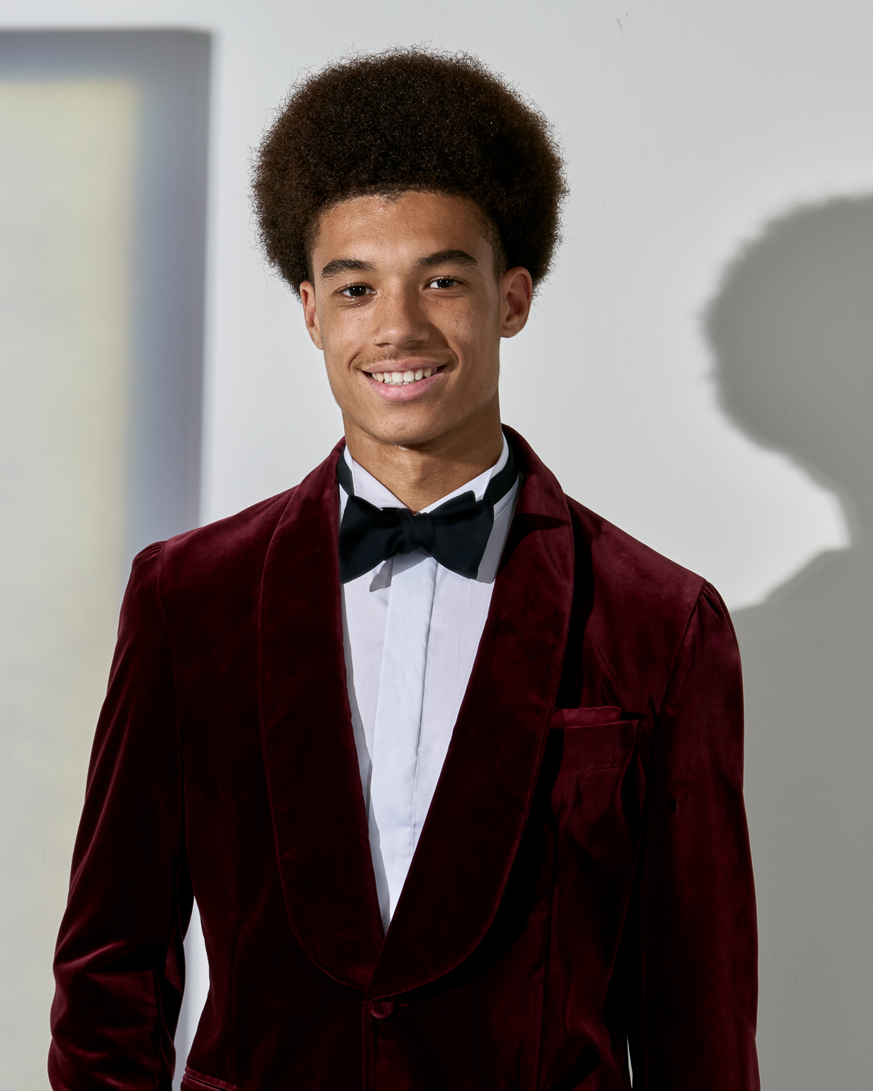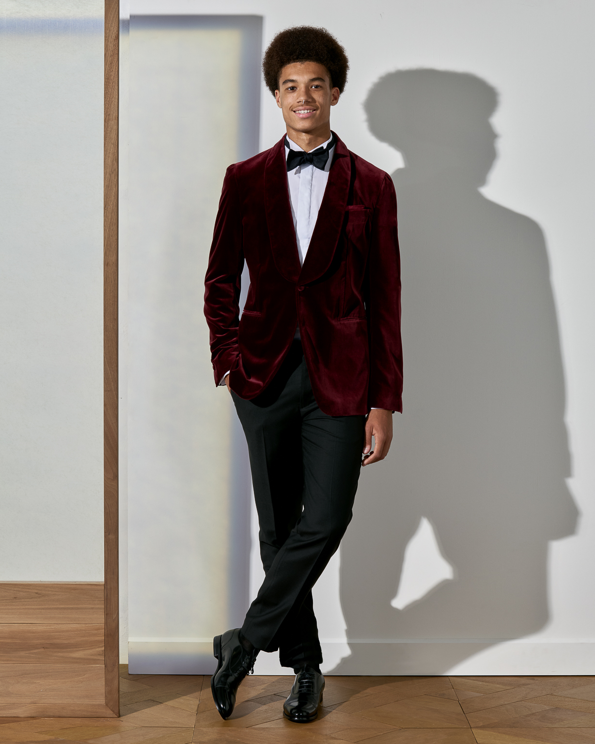 Aaron Bouwman, defender at AFC Ajax, brings timeless elegance to formal occasions with the rich texture of a wine red velvet jacket. A white sateen shirt, black satin bow tie, and matching silk pocket square add refinement, while black wool-mohair trousers and patent Oxford shoes complete the polished look.