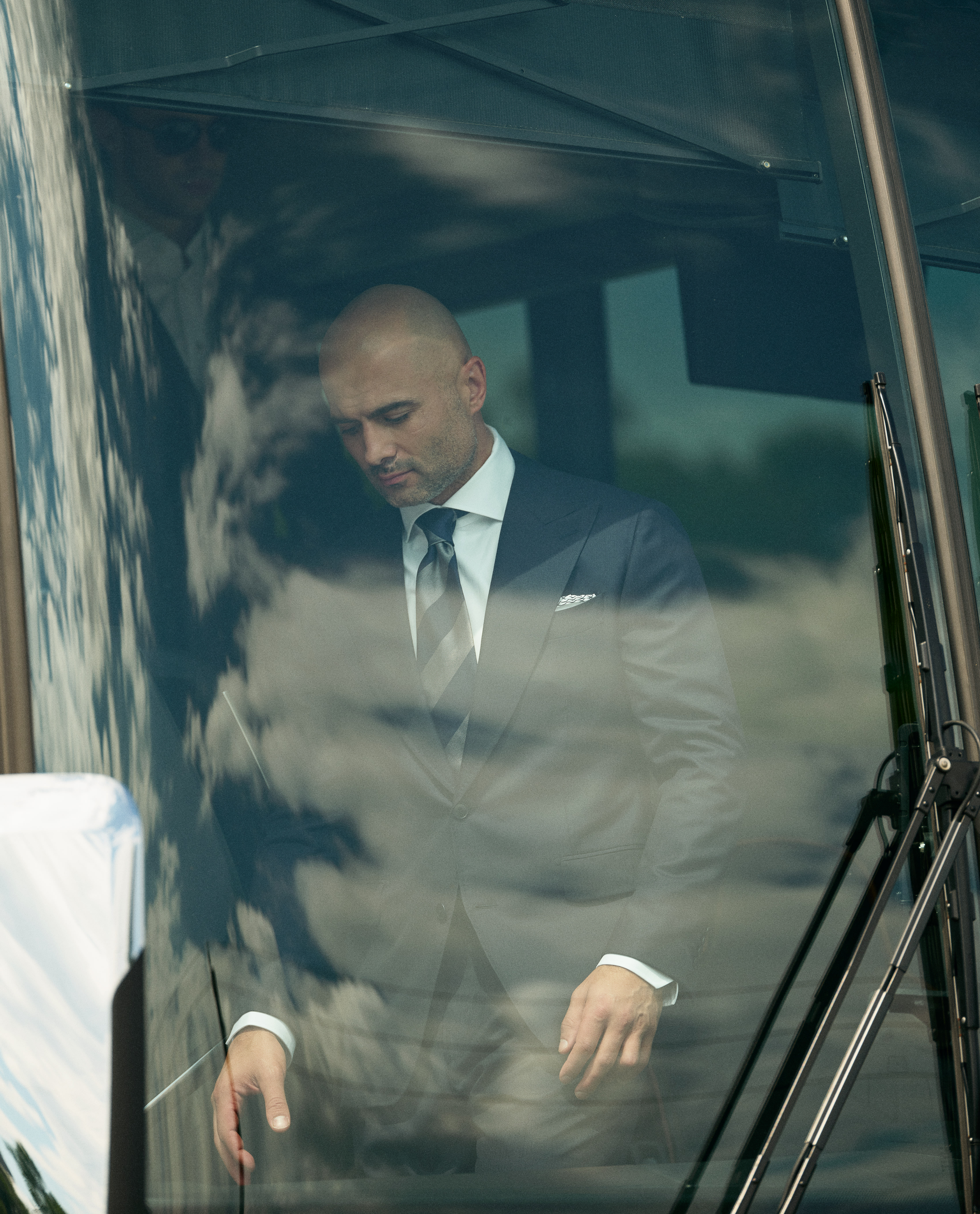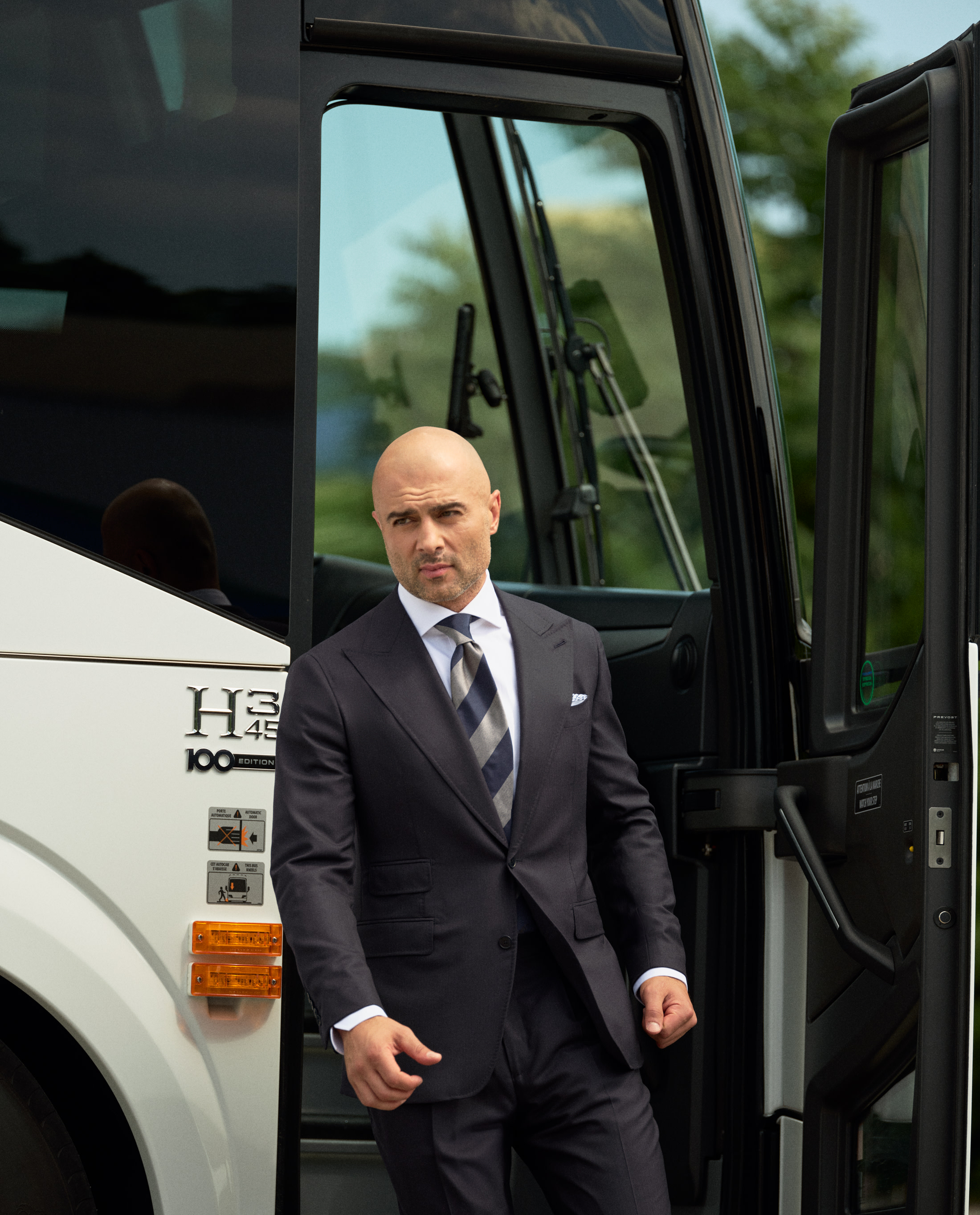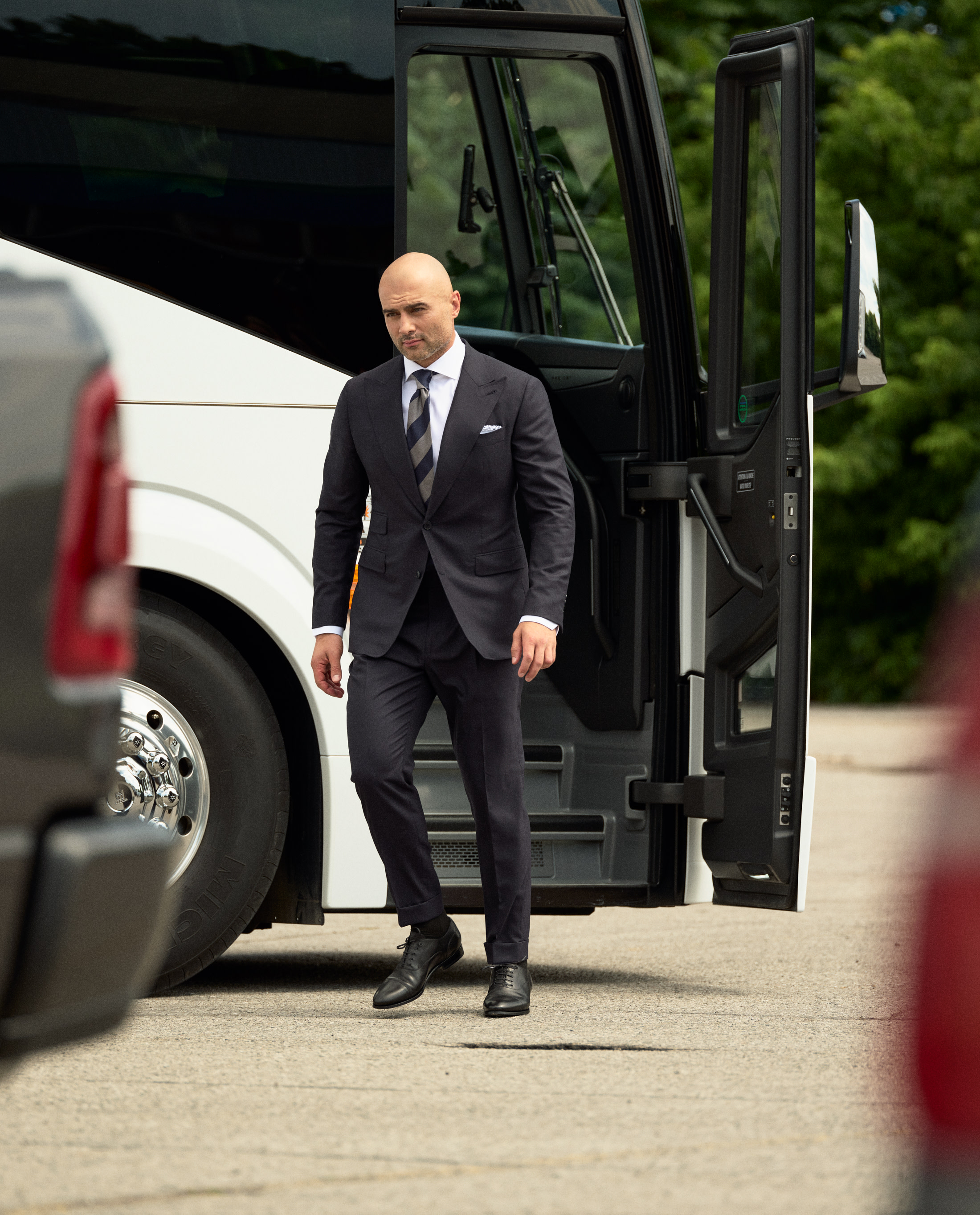 For NHL player Mark, style on and off the ice requires a focus on both quality and professionalism – showcased here by his choice of an all-season midnight blue herringbone suit in luxurious S130 wool. Finished with an extra-formal vibe thanks to his choice of a crisp white cotton shirt, white pocket square with handstitched blue details, and boldly striped silk tie.