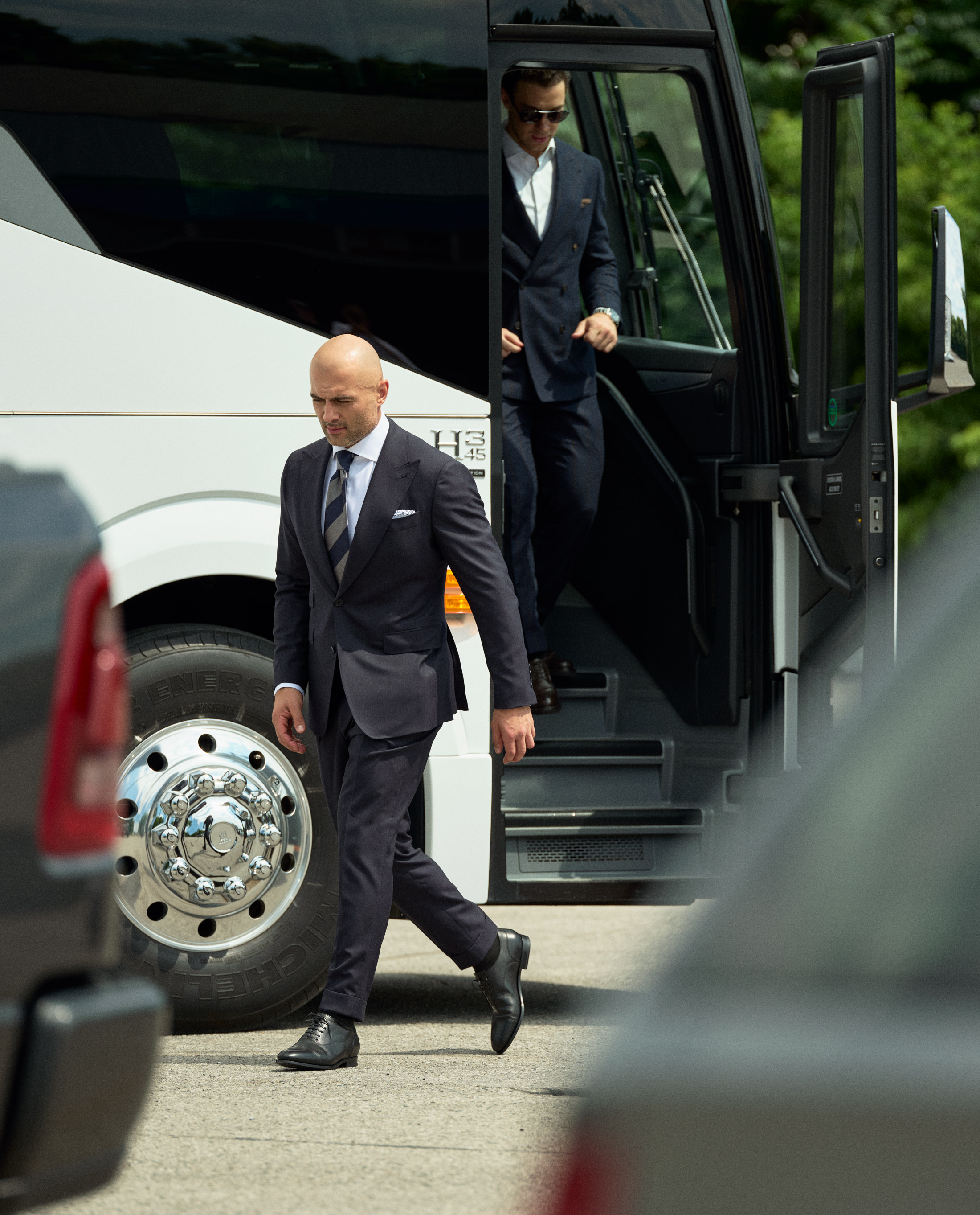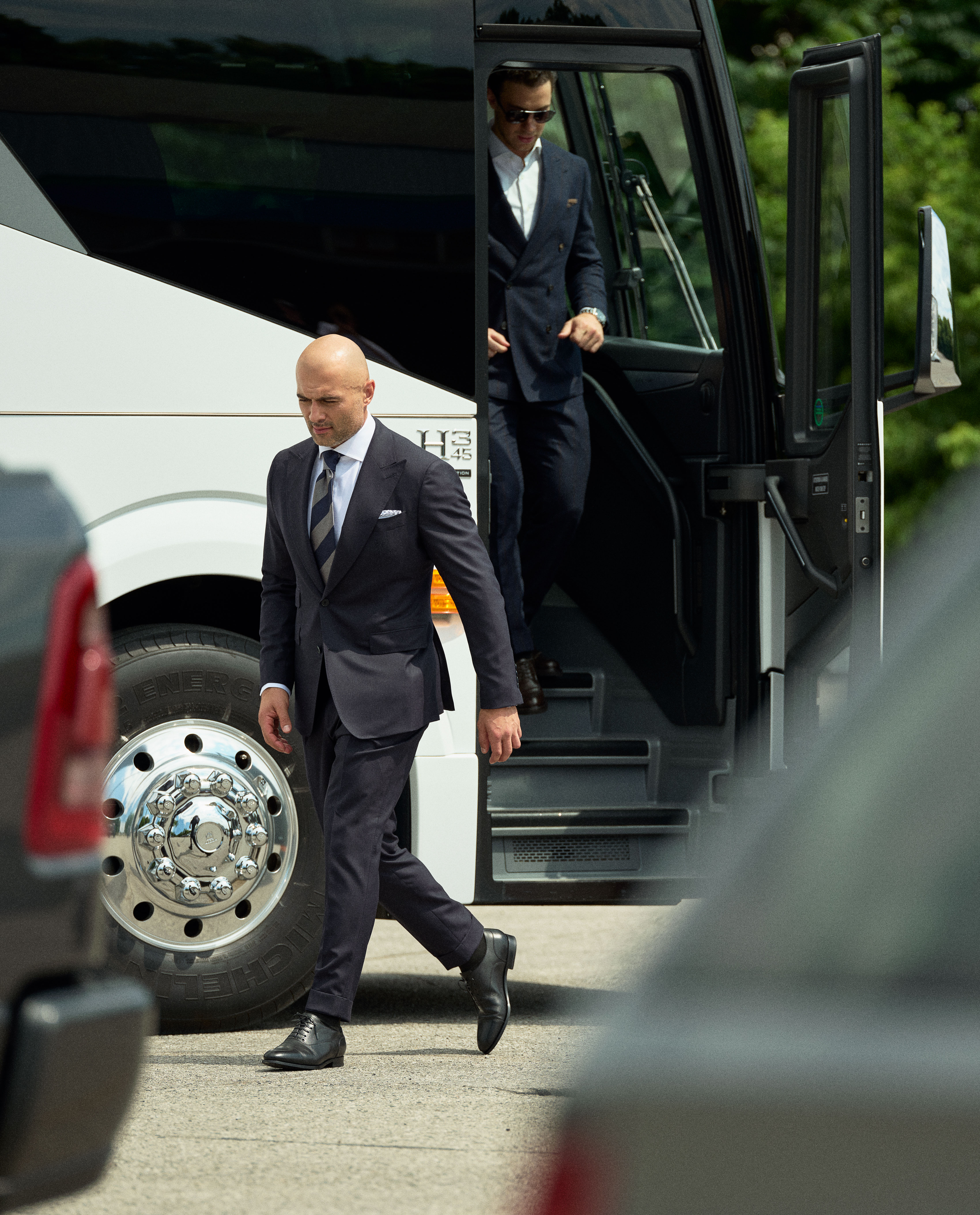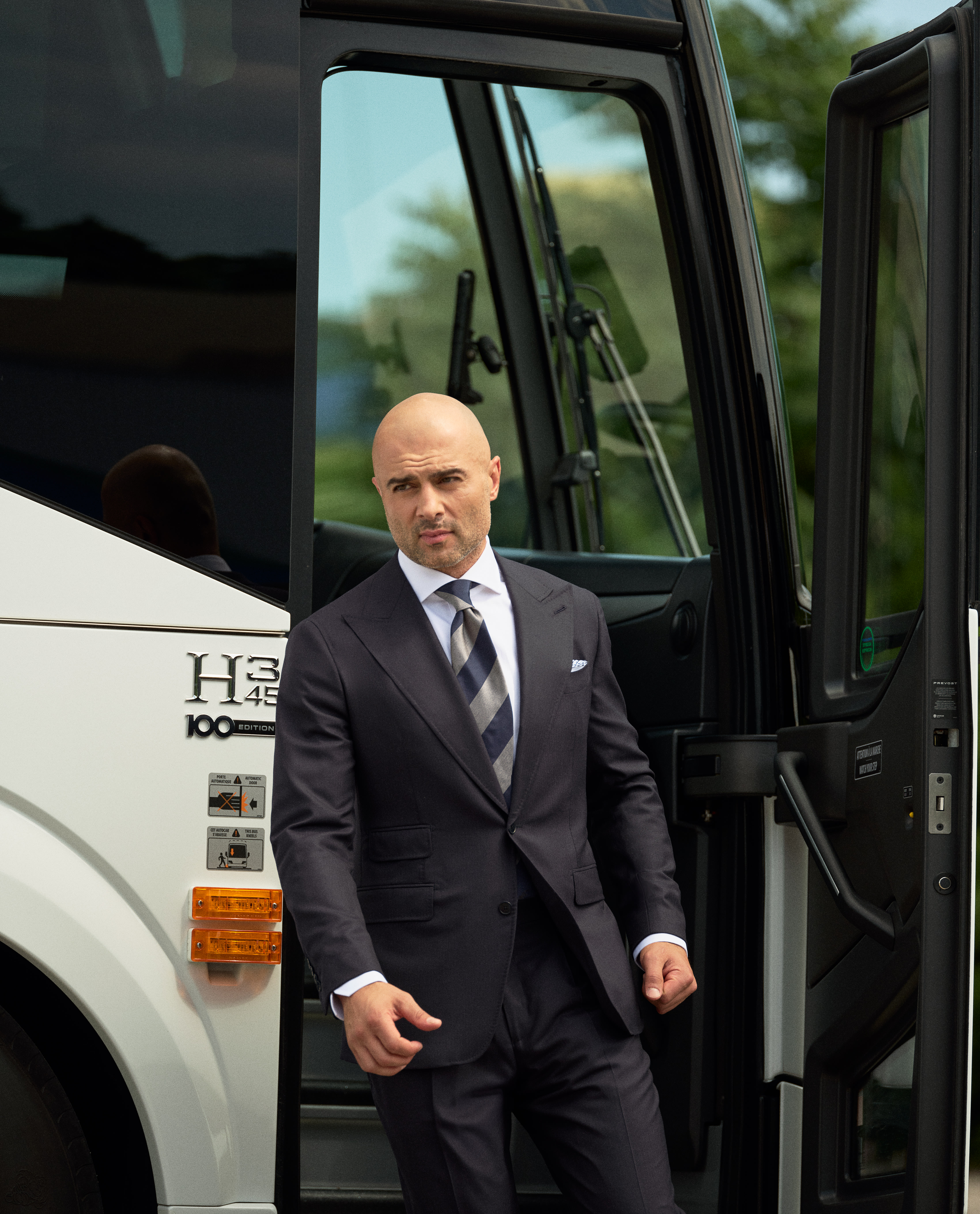 For NHL player Mark, style on and off the ice requires a focus on both quality and professionalism – showcased here by his choice of an all-season midnight blue herringbone suit in luxurious S130 wool. Finished with an extra-formal vibe thanks to his choice of a crisp white cotton shirt, white pocket square with handstitched blue details, and boldly striped silk tie.