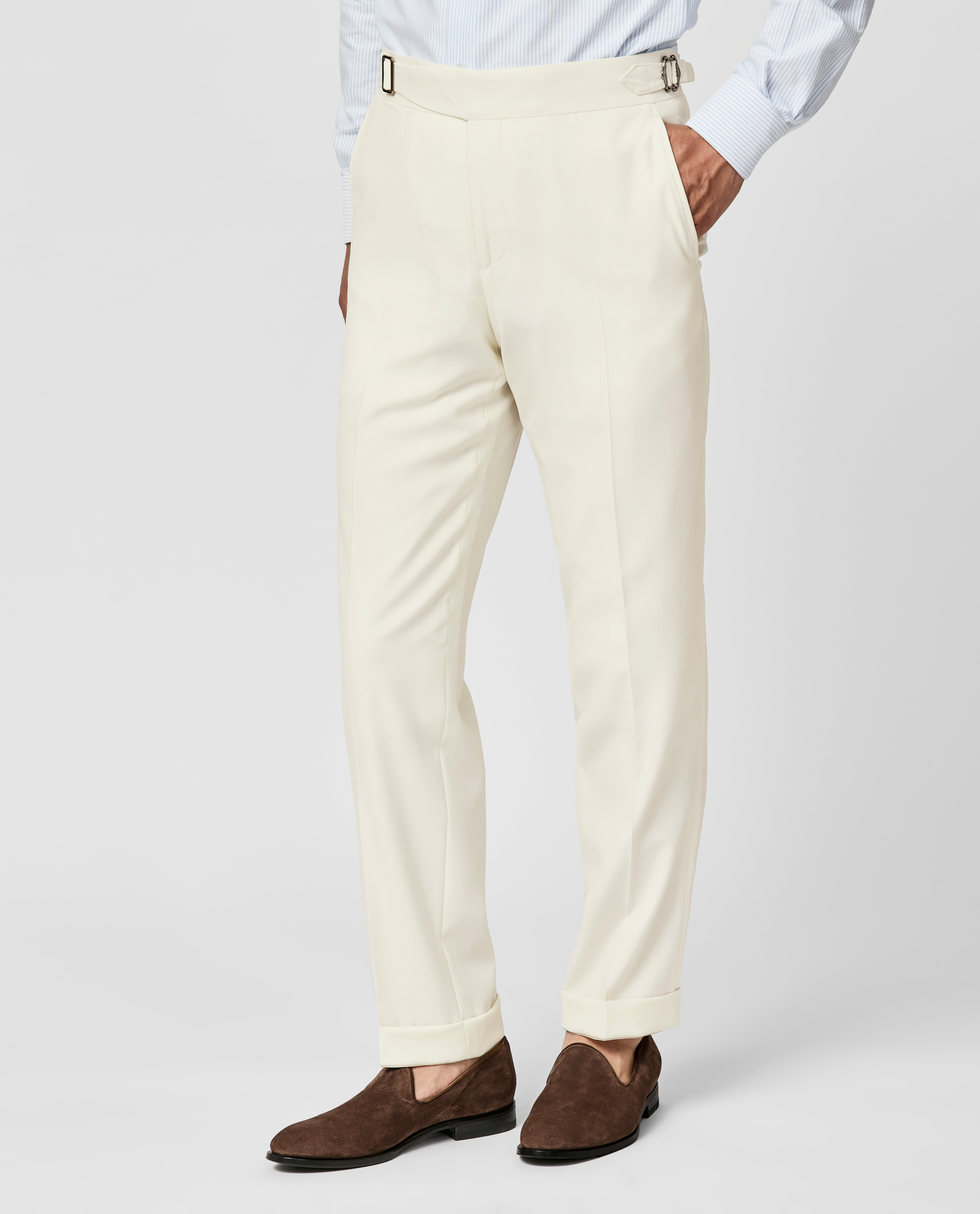 These ivory trousers offer a rare look and feel for any season. The gabardine is densely woven in Japan from a unique mix of fine Australian merino wool with rougher raw wool giving the fabric the resilience and cool feeling of a mohair blend. Designed here with a high waist, single pleats, and 4cm turn up. Make these trousers your own with our many customization options to choose from. 100% wool All seasons Resilient Cool feeling