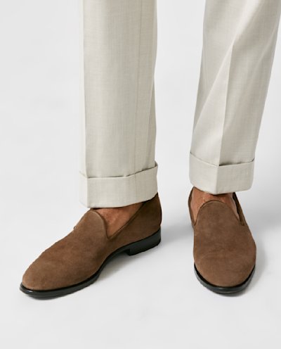 An elegant suede loafer in chocolate brown. Handmade from a flexible chrome-tanned calfskin leather, this light suede features a short nap for a touch of softness. Designed here as a plain toe loafer. Make these shoes your own with our many customization options to choose from.