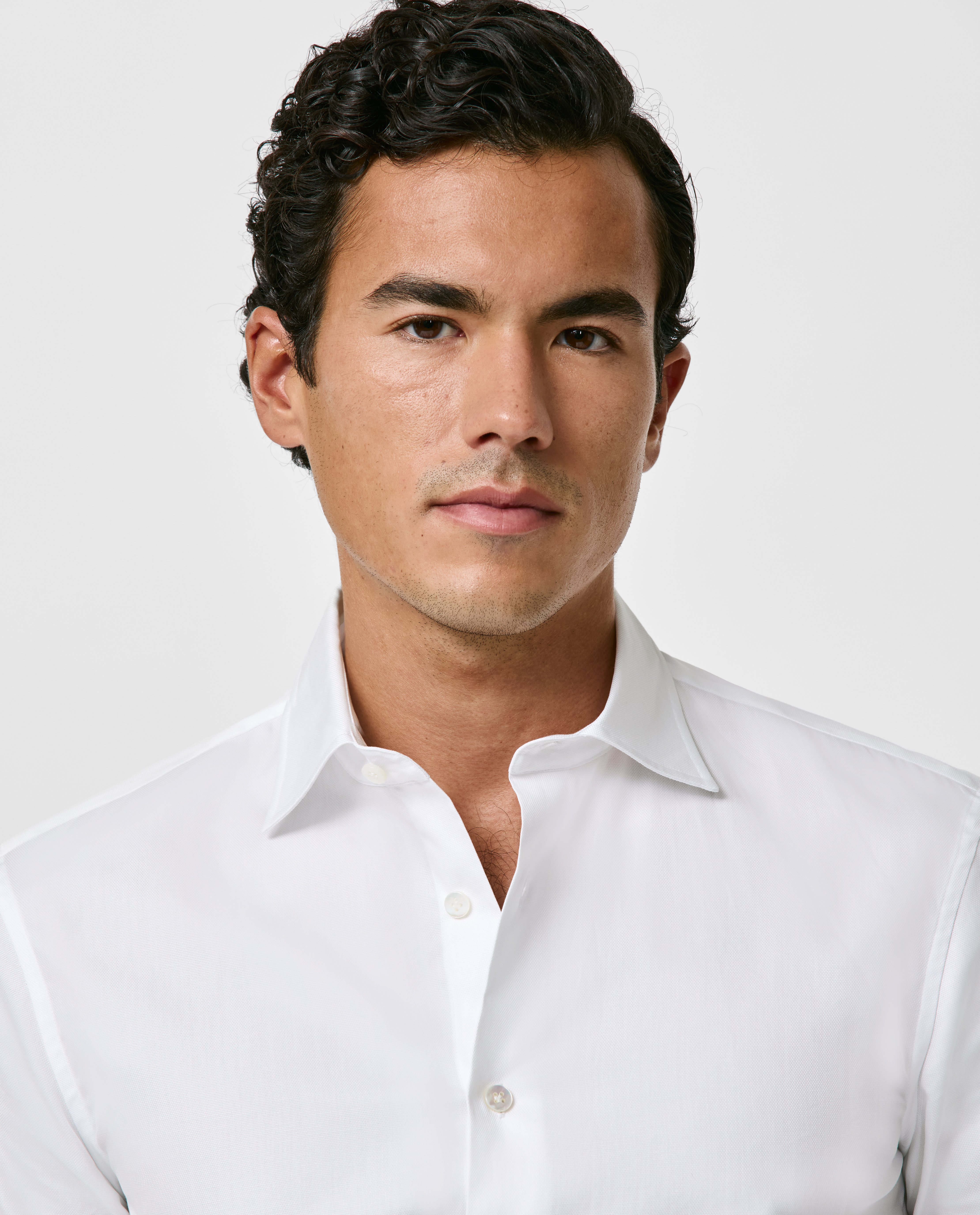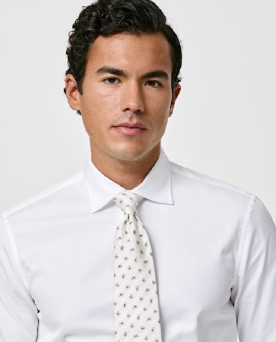 A white cotton dobby woven in Italy from fine single yarns for a soft hand-feel. Designed here with a classic collar. Featuring a light sheen, this is ideal for a day at the office or more formal occasions. 100% cotton
