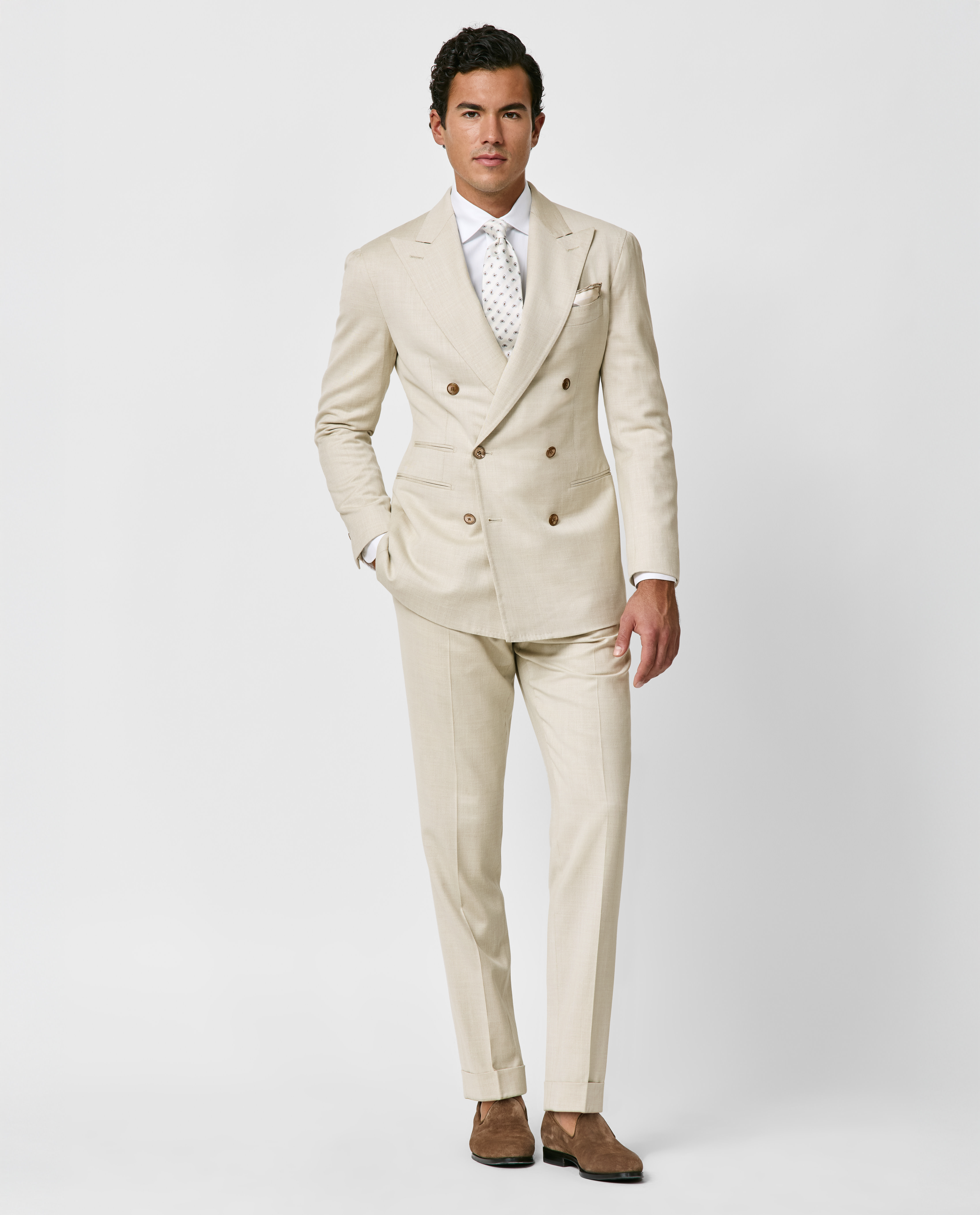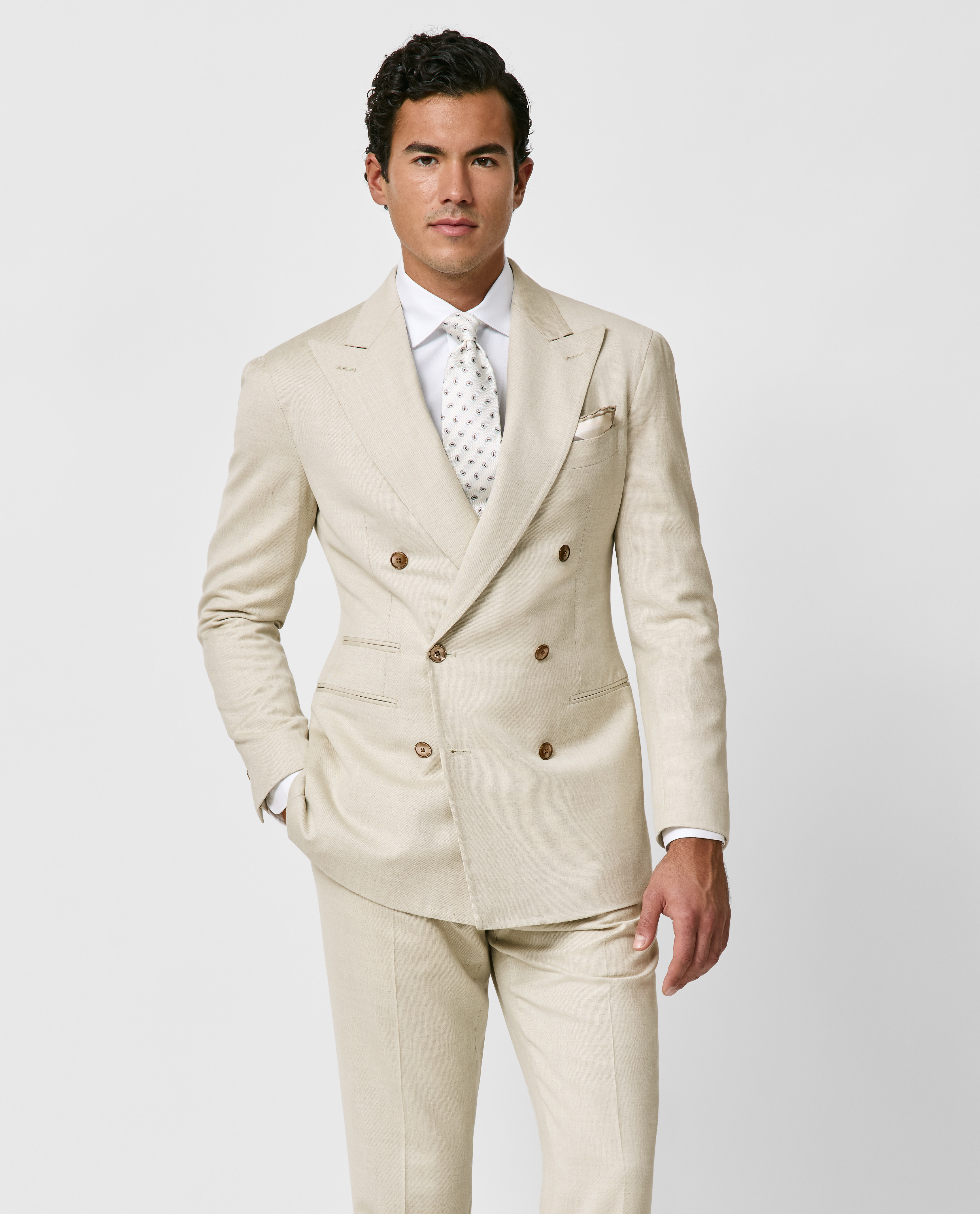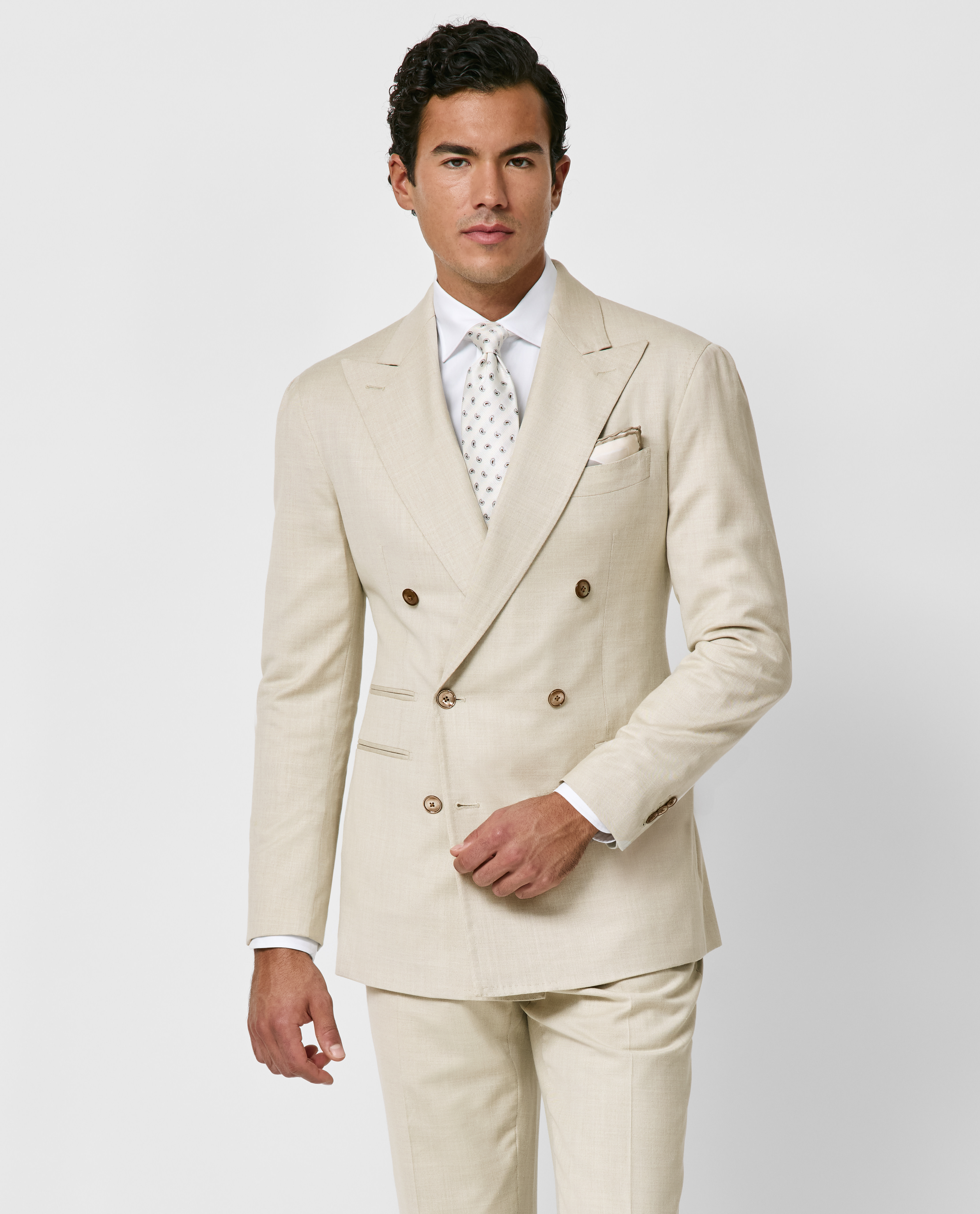 Crafted from sand-colored stretch Jersely® fabric made in Italy by Loro Piana, this luxurious wool-silk-linen suit offers comfortable knit-like elasticity, outstanding breathability, and an elegant, understated shine. Designed here with a double-breasted closure, wide peak lapels, and straight jet side pockets. Pair it with a white shirt, silk tie, and suede loafers to create a distinctive look worthy of any special occasion. Prefer a different style? Every piece is made exclusively for you, with your choice of design options. Stretch wool, silk & linen Twill weave Subtle shine Breathable Four-season weight