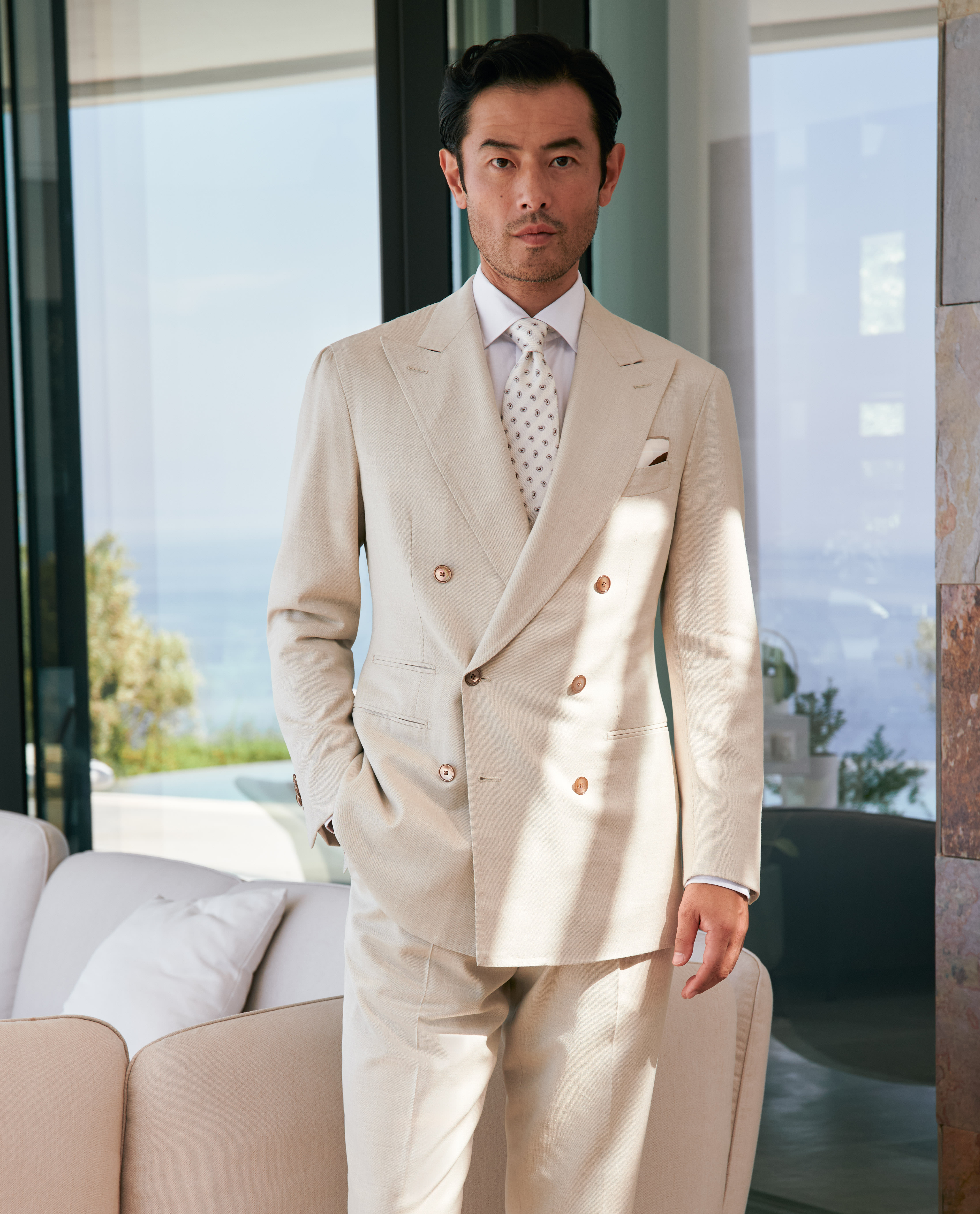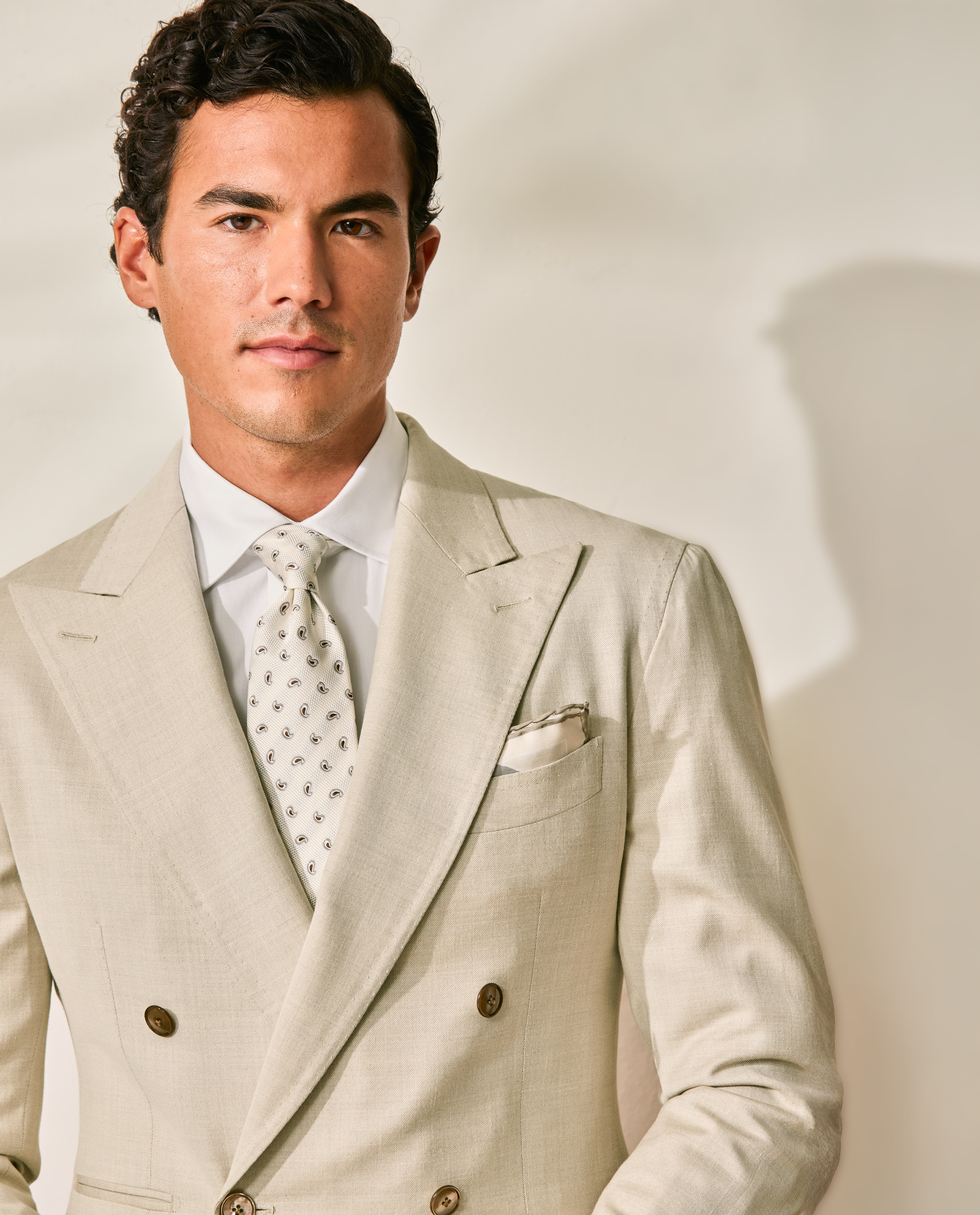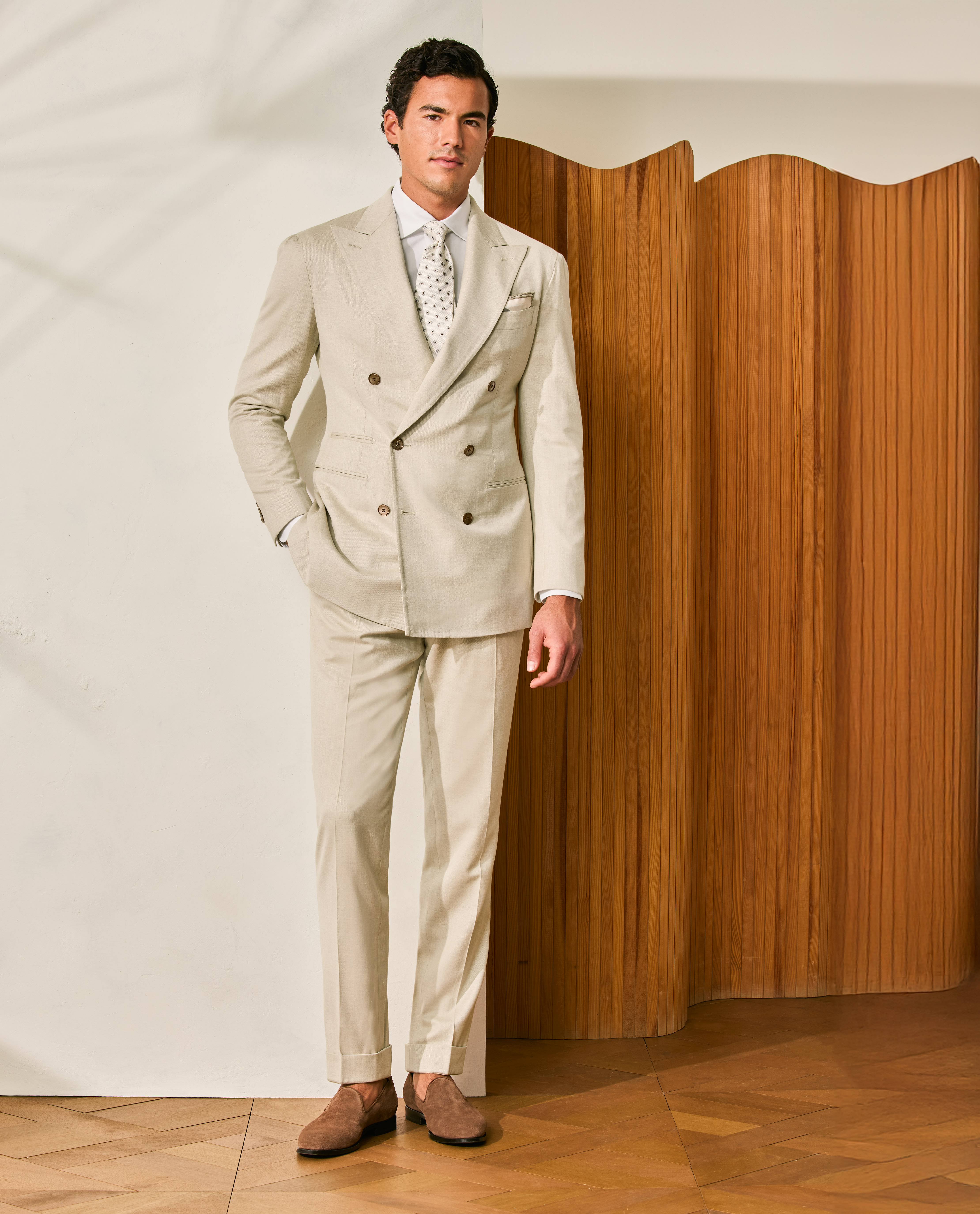 Crafted from sand-colored stretch Jersely® fabric made in Italy by Loro Piana, this luxurious wool-silk-linen suit offers comfortable knit-like elasticity, outstanding breathability, and an elegant, understated shine. Designed here with a double-breasted closure, wide peak lapels, and straight jet side pockets. Pair it with a white shirt, silk tie, and suede loafers to create a distinctive look worthy of any special occasion. Prefer a different style? Every piece is made exclusively for you, with your choice of design options. Stretch wool, silk & linen Twill weave Subtle shine Breathable Four-season weight