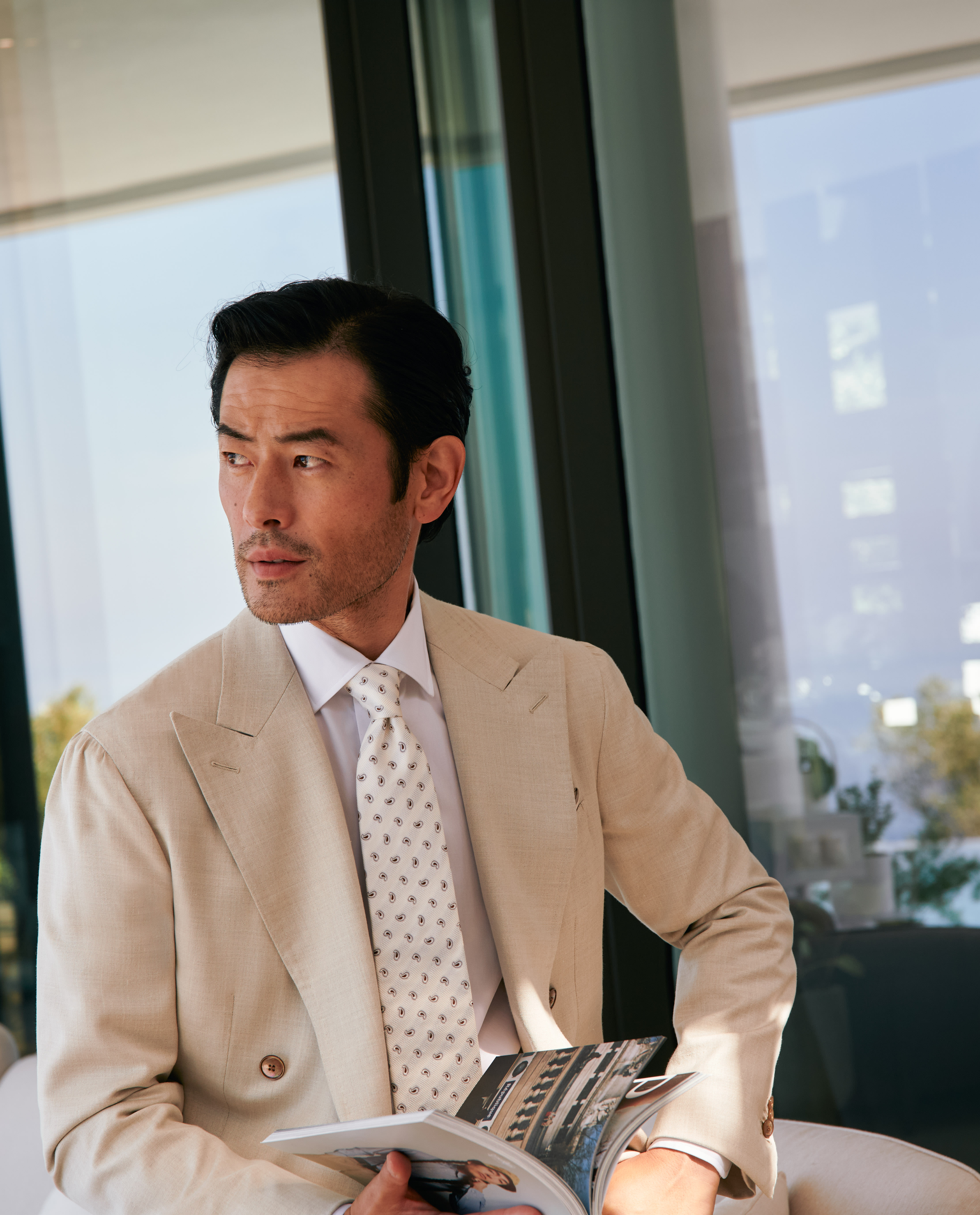 Wedding on the horizon? This sand stretch wool-silk-linen suit is fit for the groom himself yet versatile enough to be worn as separates long after the big day. Elevated with chic mother-of-pearl buttons and styled here for your next summer formal event with a white dobby shirt, silk jacquard tie, and brown suede loafers.