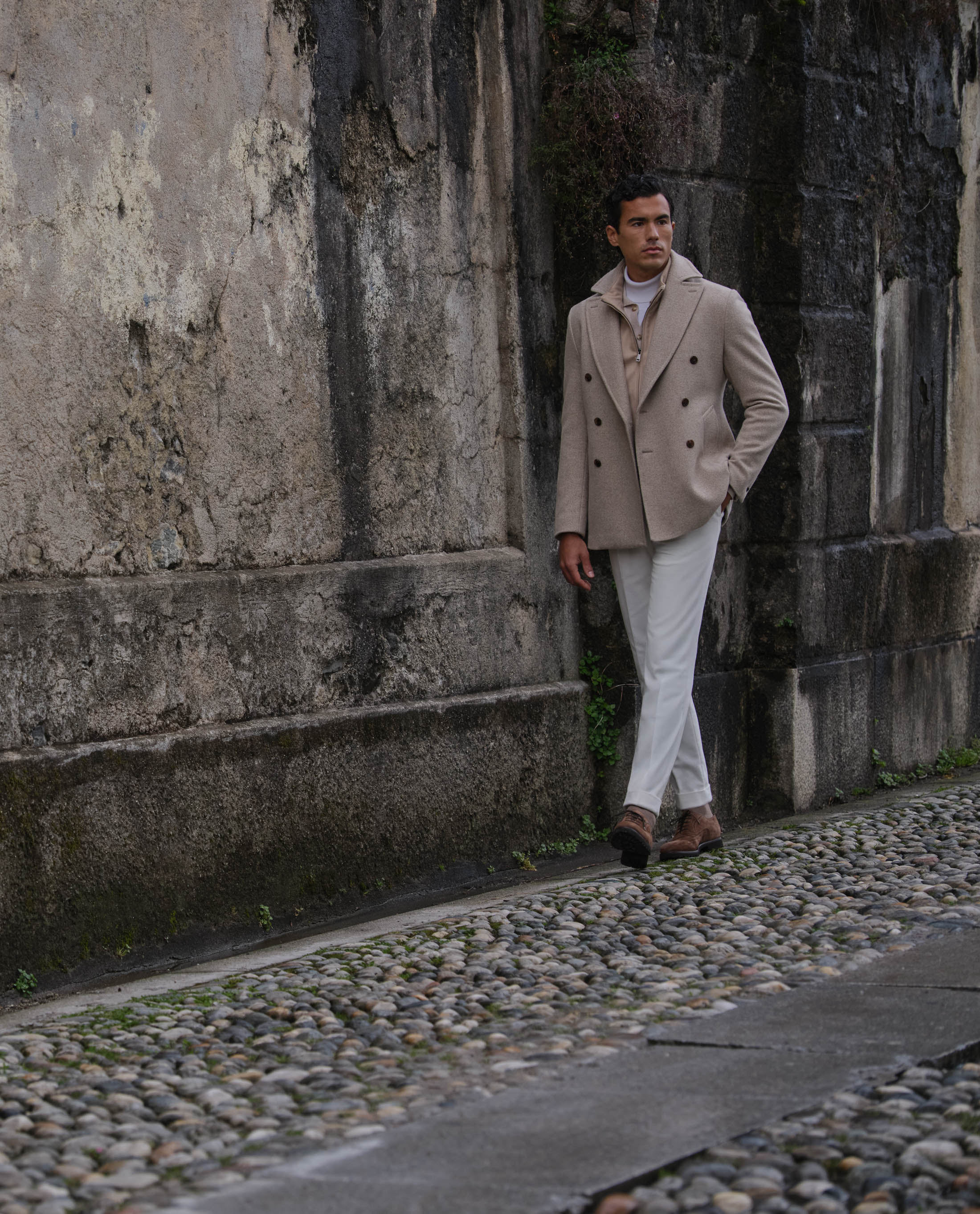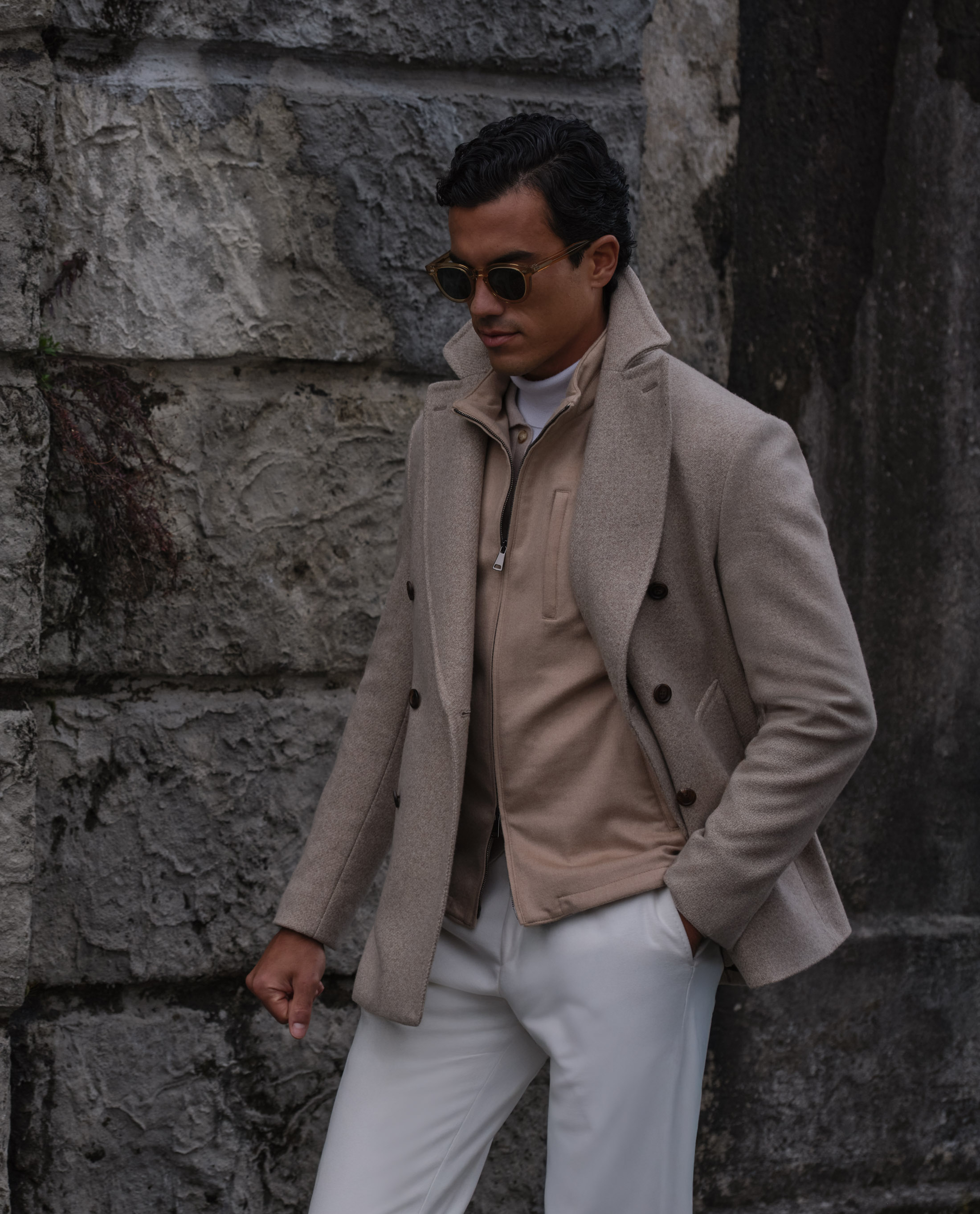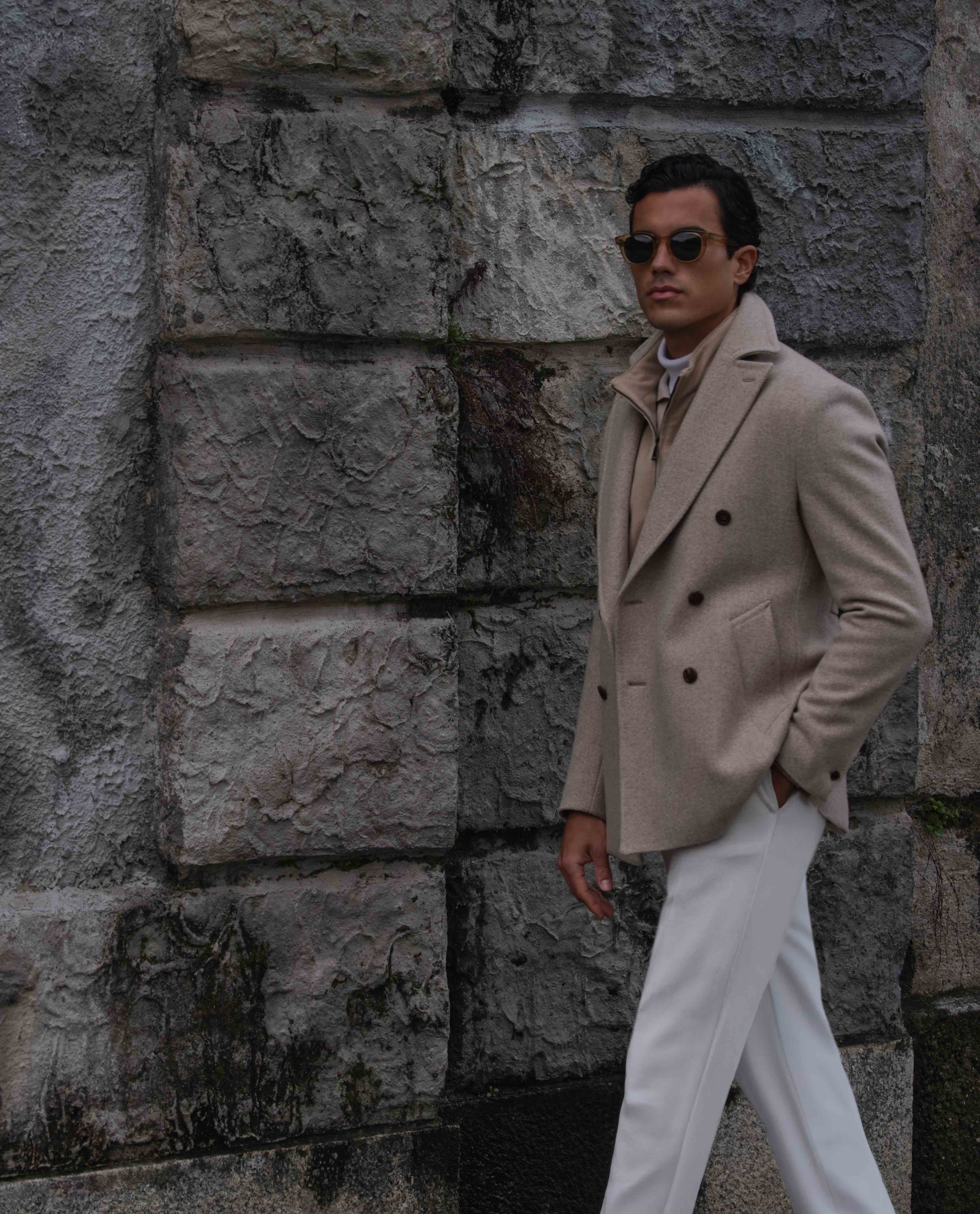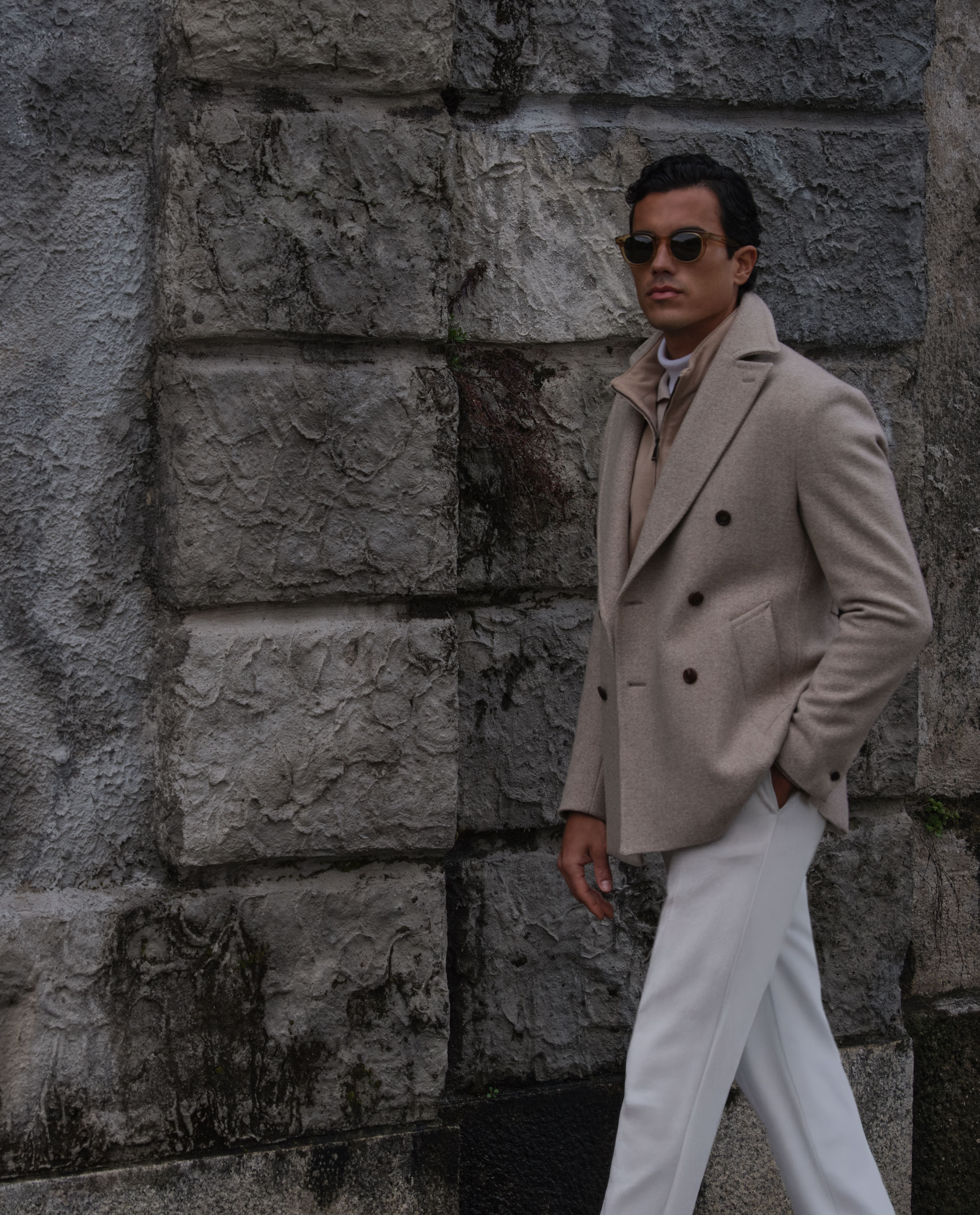 A minimalist, yet refined, approach to winter dressing. Soft shades of sand, off-white, and beige flow seamlessly together, creating a wardrobe that’s both versatile and elegant. A warm wool-cashmere pea coat serves as the perfect anchor, while layers like a cashmere cardigan, a brushed camel vest, and cotton moleskin trousers keep you comfortably stylish.