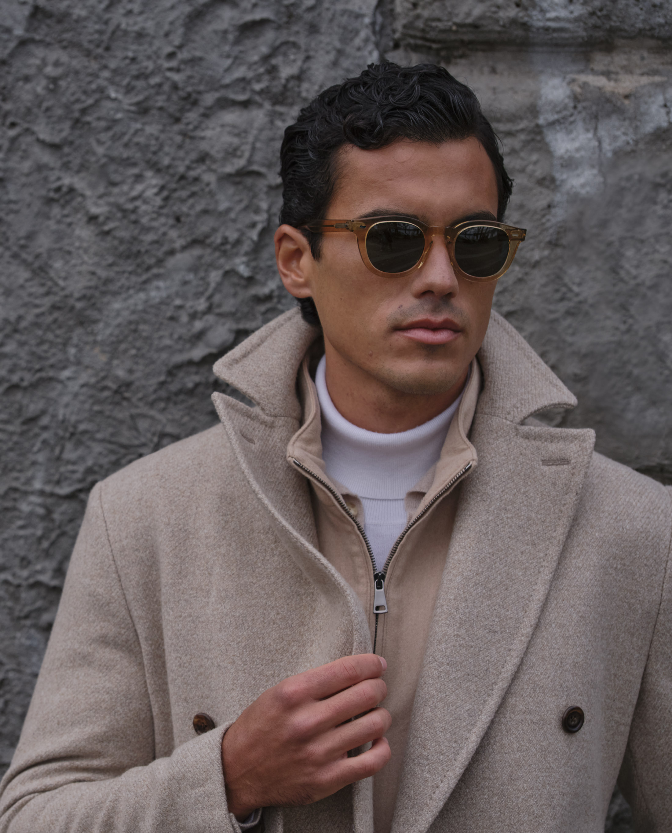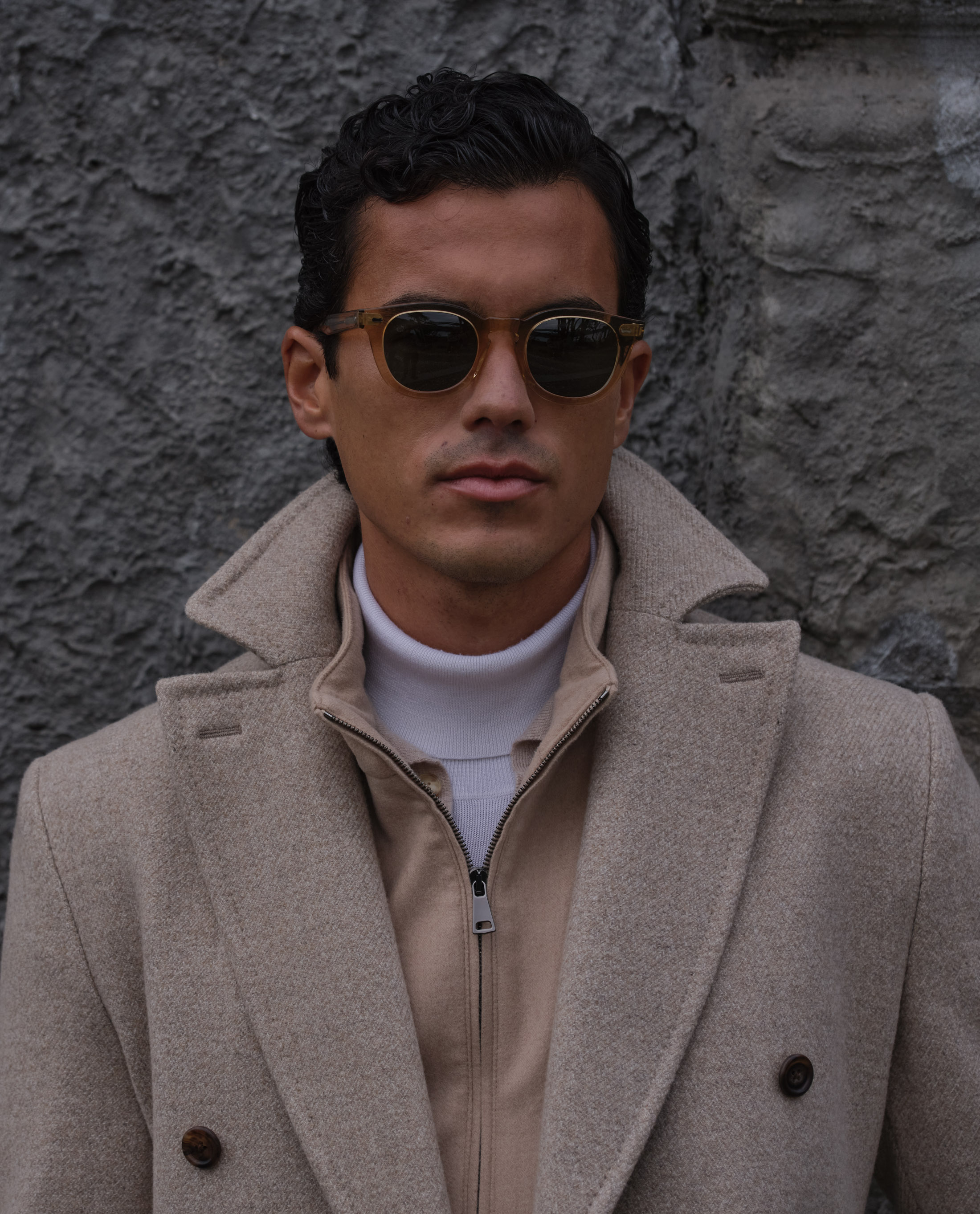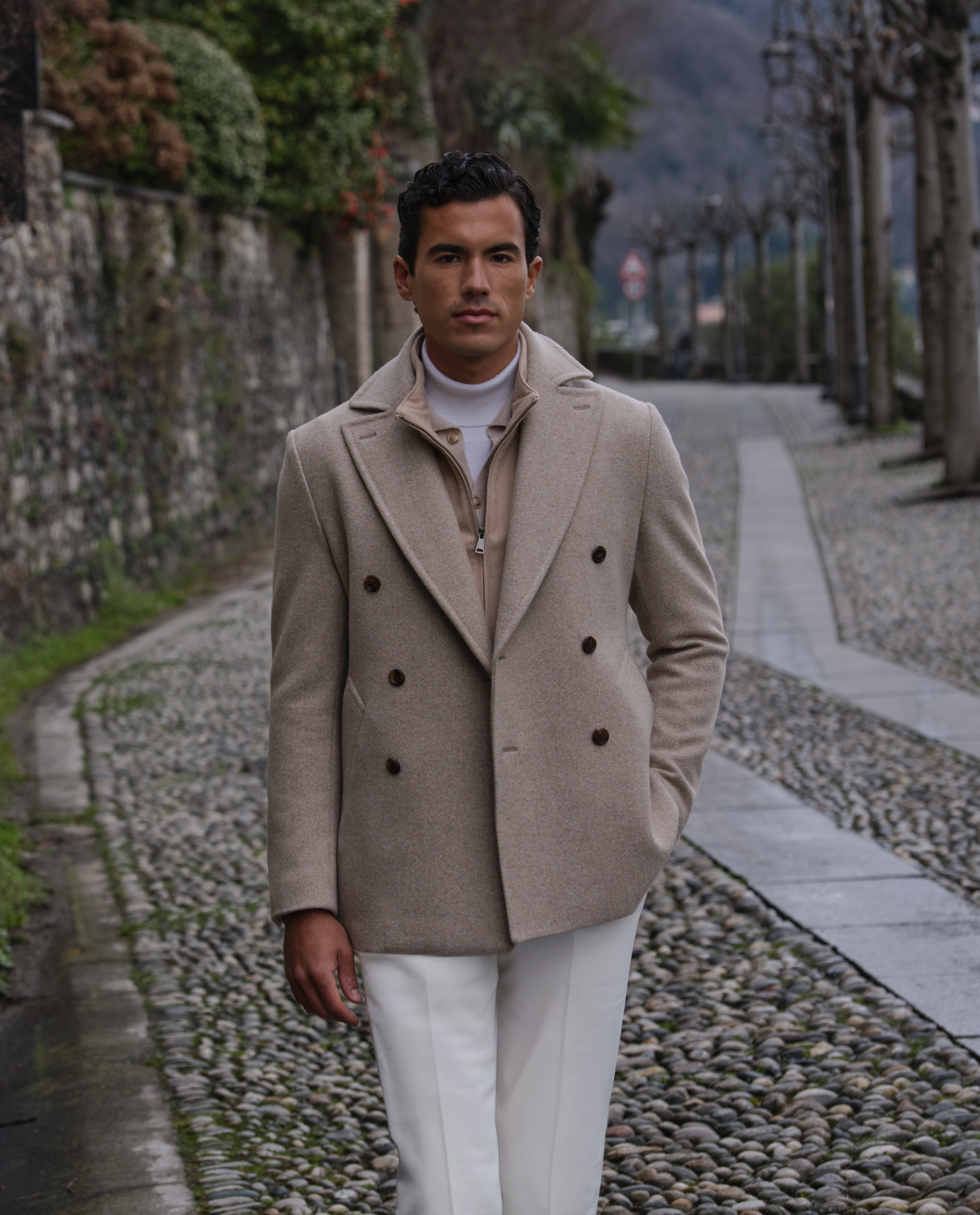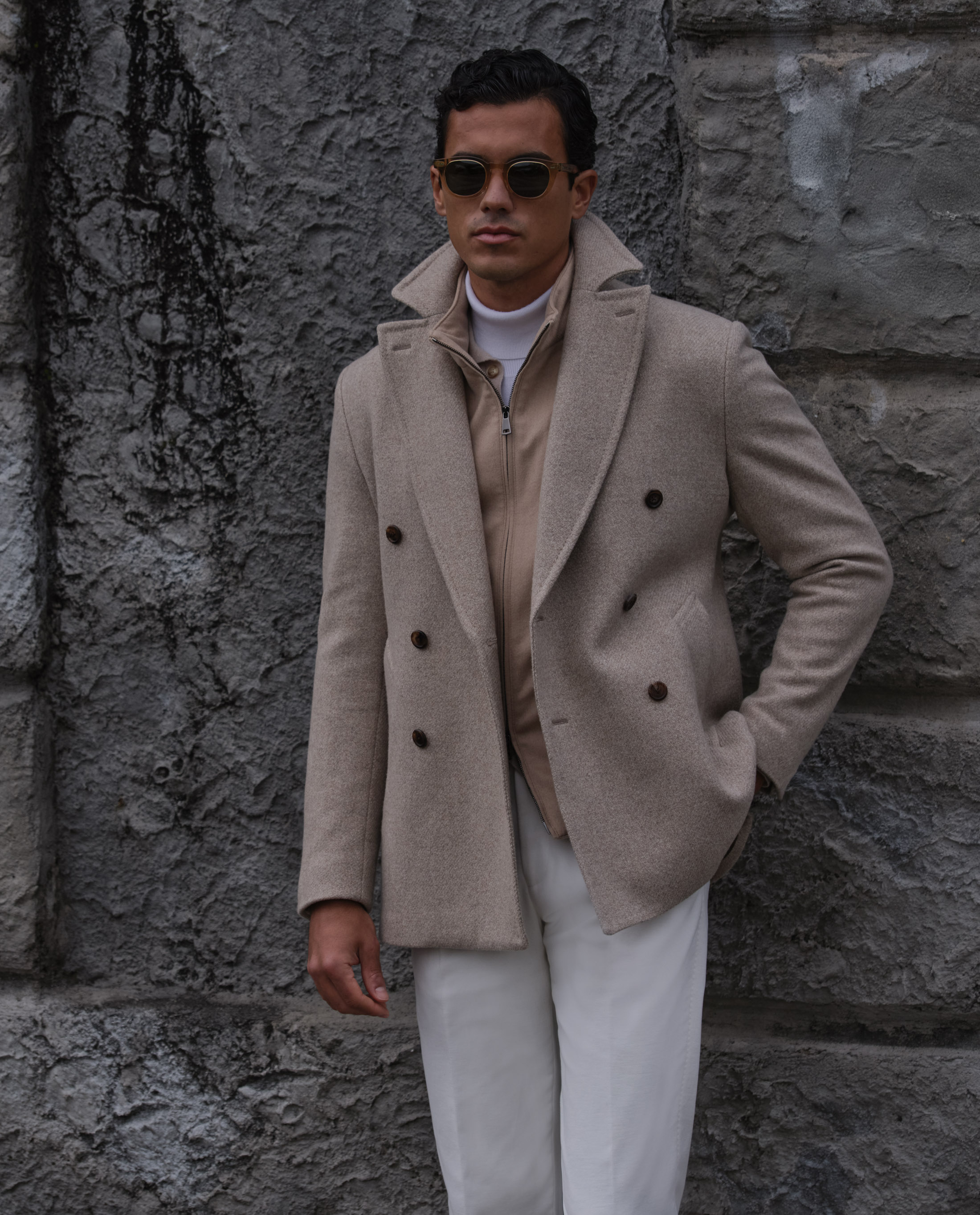A minimalist, yet refined, approach to winter dressing. Soft shades of sand, off-white, and beige flow seamlessly together, creating a wardrobe that’s both versatile and elegant. A warm wool-cashmere pea coat serves as the perfect anchor, while layers like a cashmere cardigan, a brushed camel vest, and cotton moleskin trousers keep you comfortably stylish.