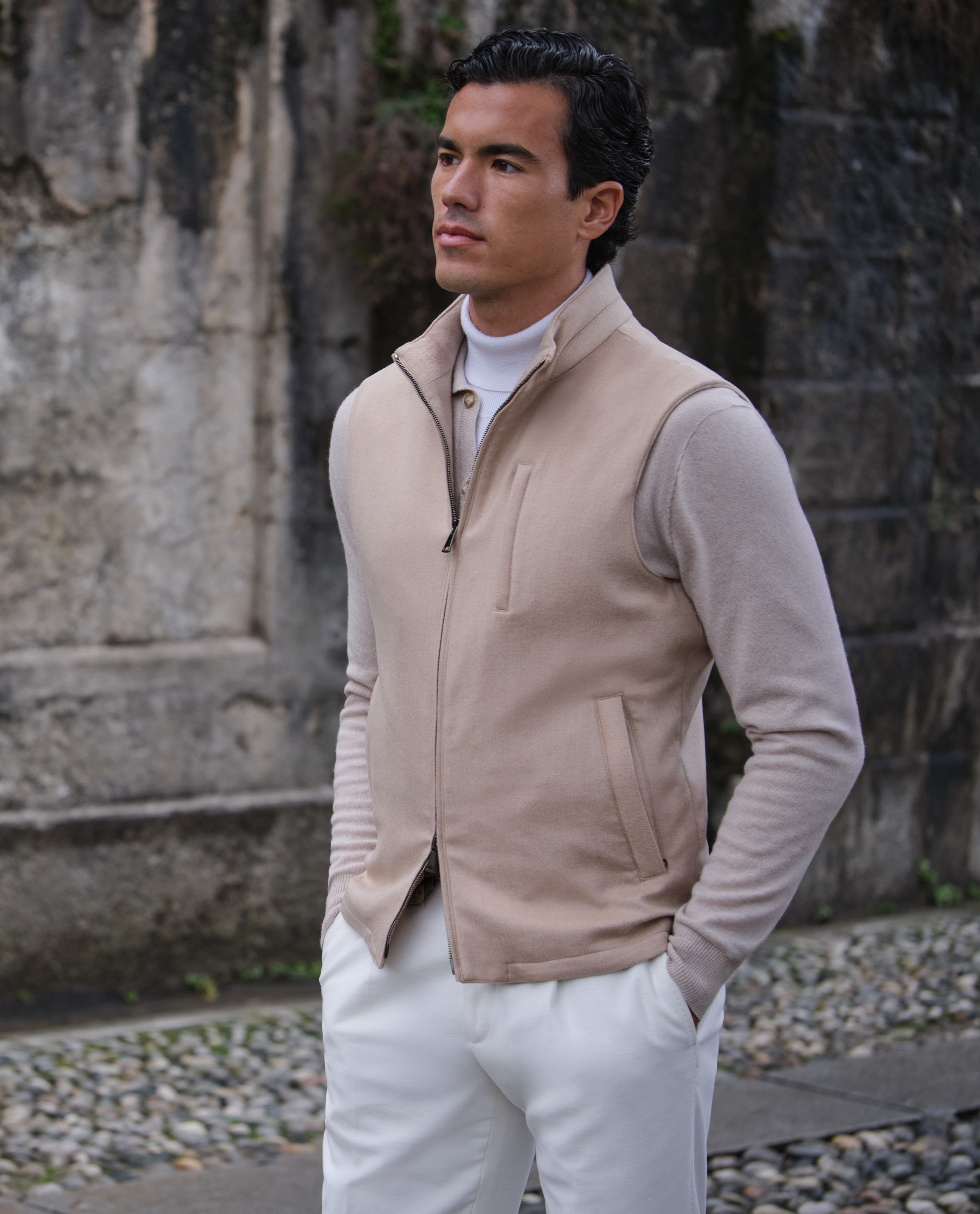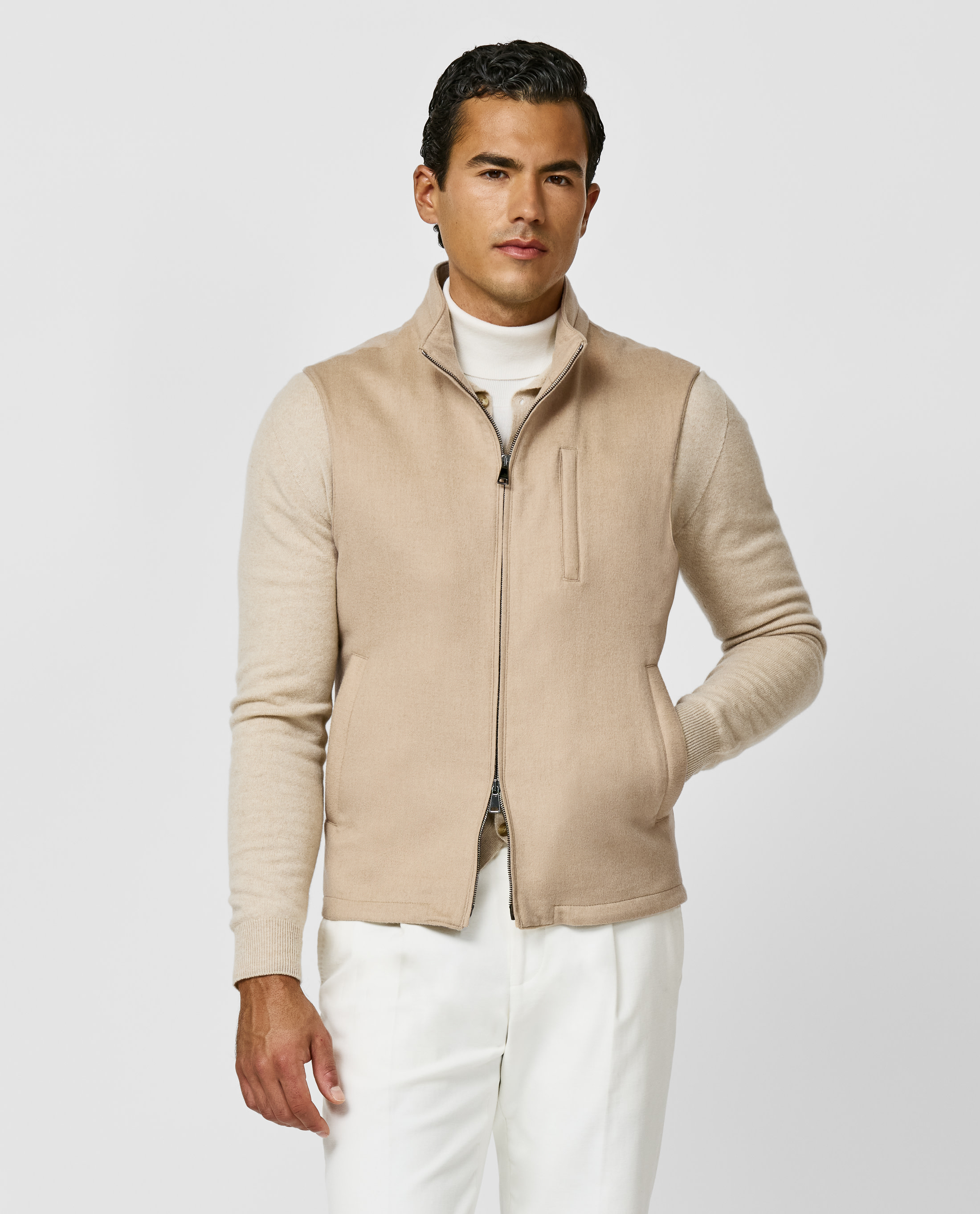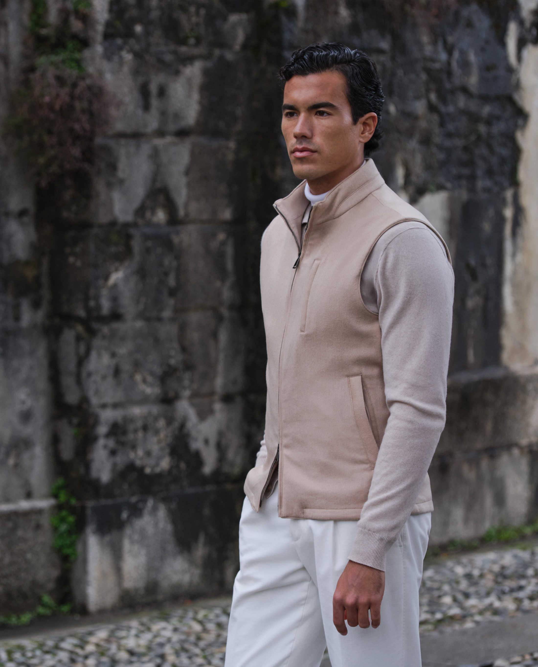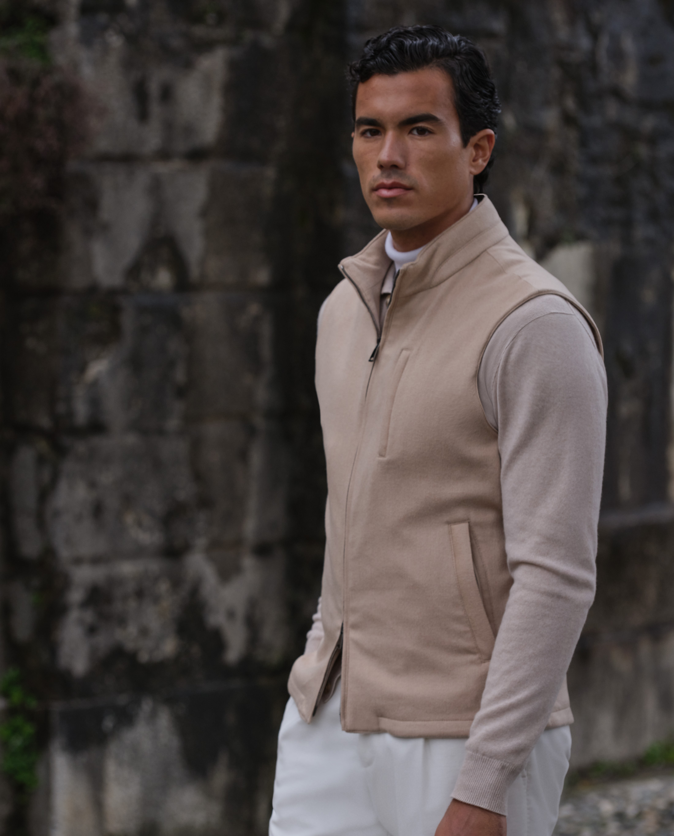 This warm sand vest is crafted from the luxurious Bactrian camel fleece fabric made in Italy by Loro Piana. Sourced from the rare, noble fibers of baby camels in Mongolia, this ancestral quality is known for its exceptional softness, insulation, and natural color. Style it with a turtle neck, cardigan, and boots to complete the look. Make this vest your own with our many customization options to choose from. Rare Precious fibers Warm Soft