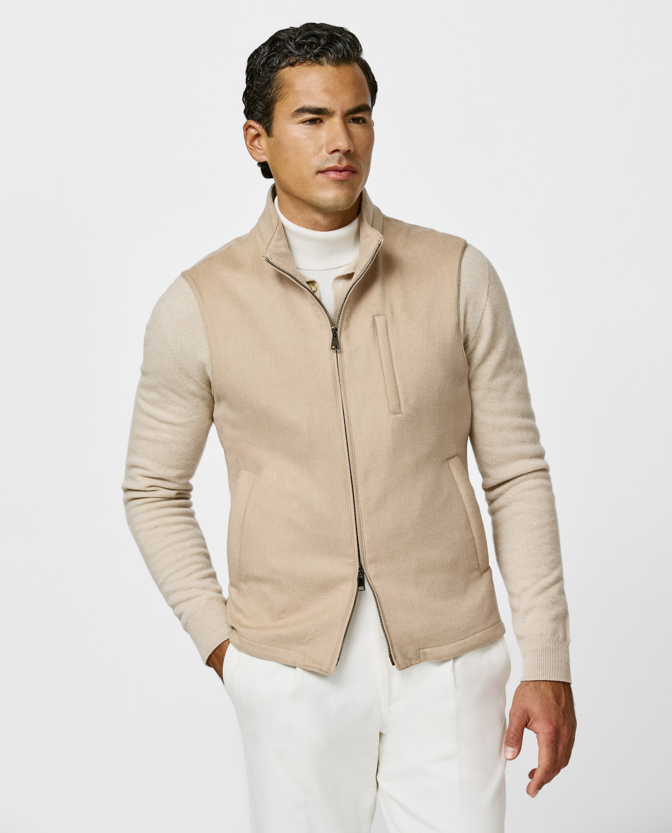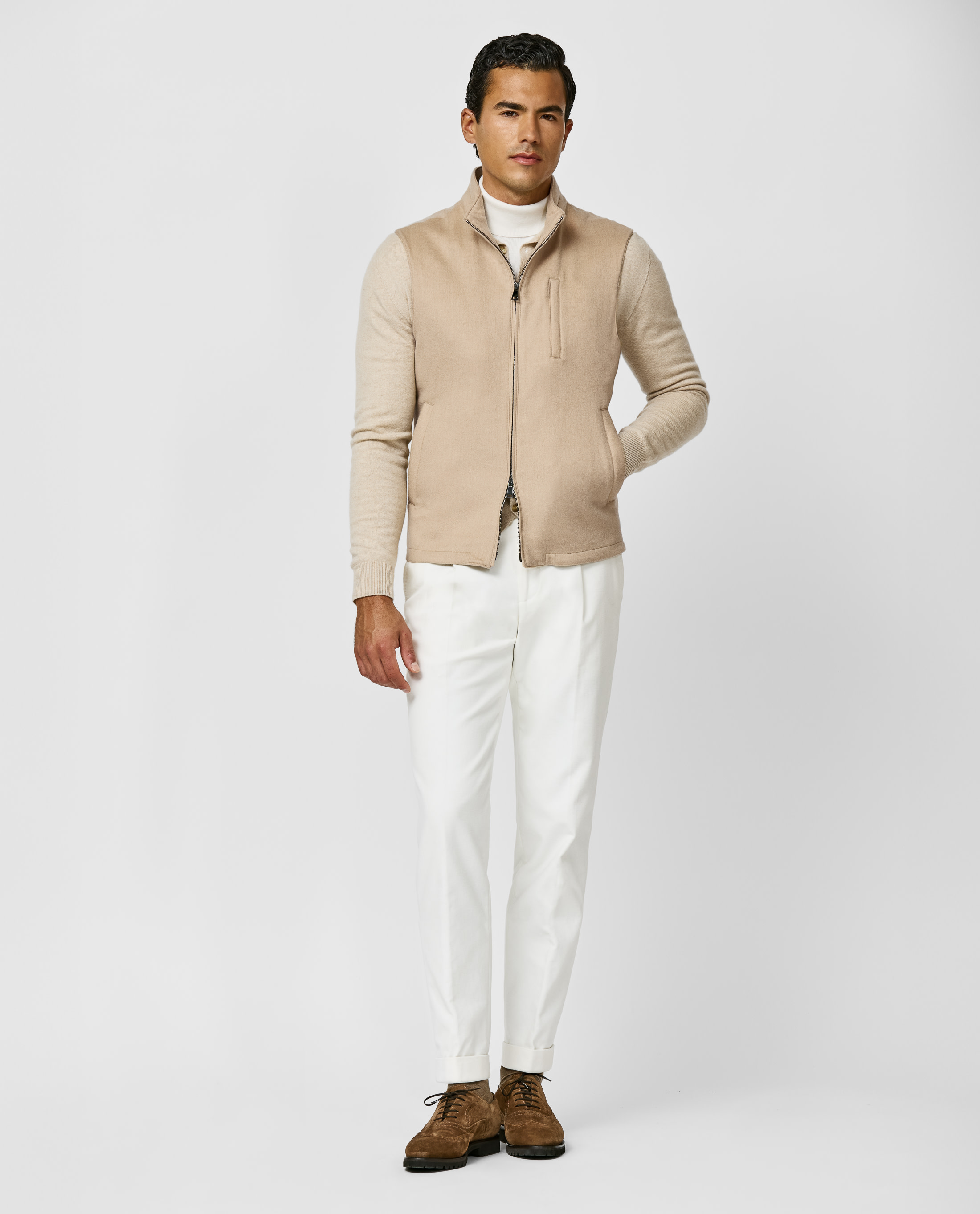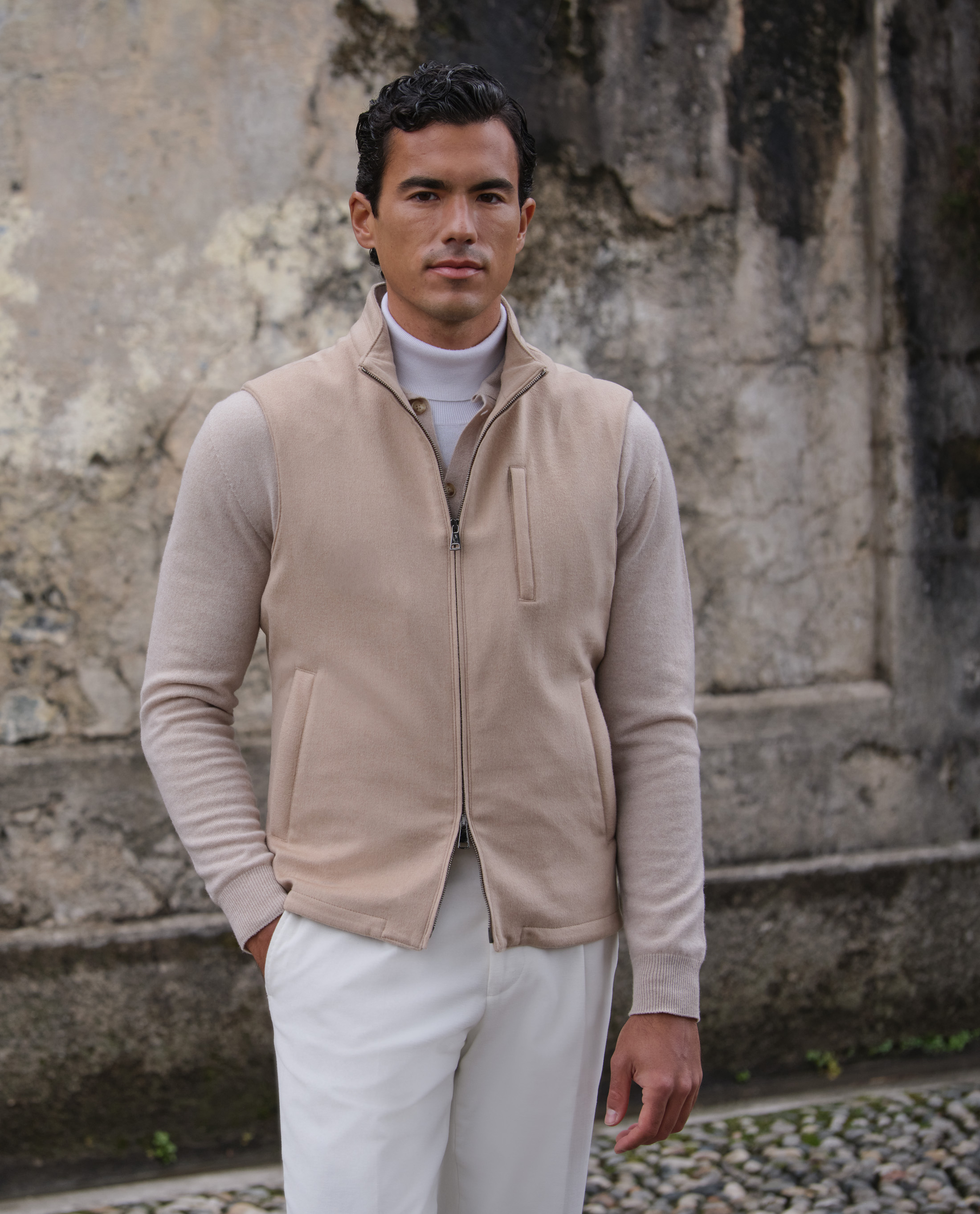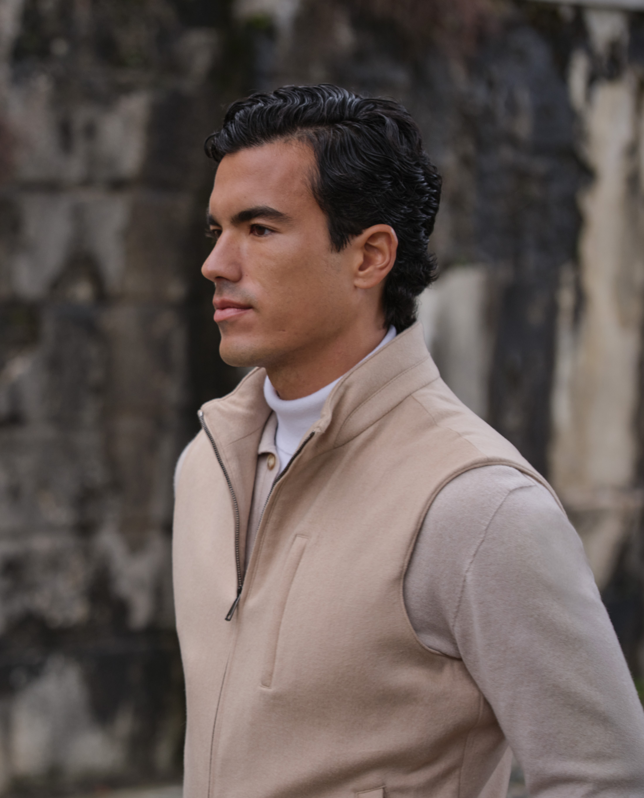 This warm sand vest is crafted from the luxurious Bactrian camel fleece fabric made in Italy by Loro Piana. Sourced from the rare, noble fibers of baby camels in Mongolia, this ancestral quality is known for its exceptional softness, insulation, and natural color. Style it with a turtle neck, cardigan, and boots to complete the look. Make this vest your own with our many customization options to choose from. Rare Precious fibers Warm Soft