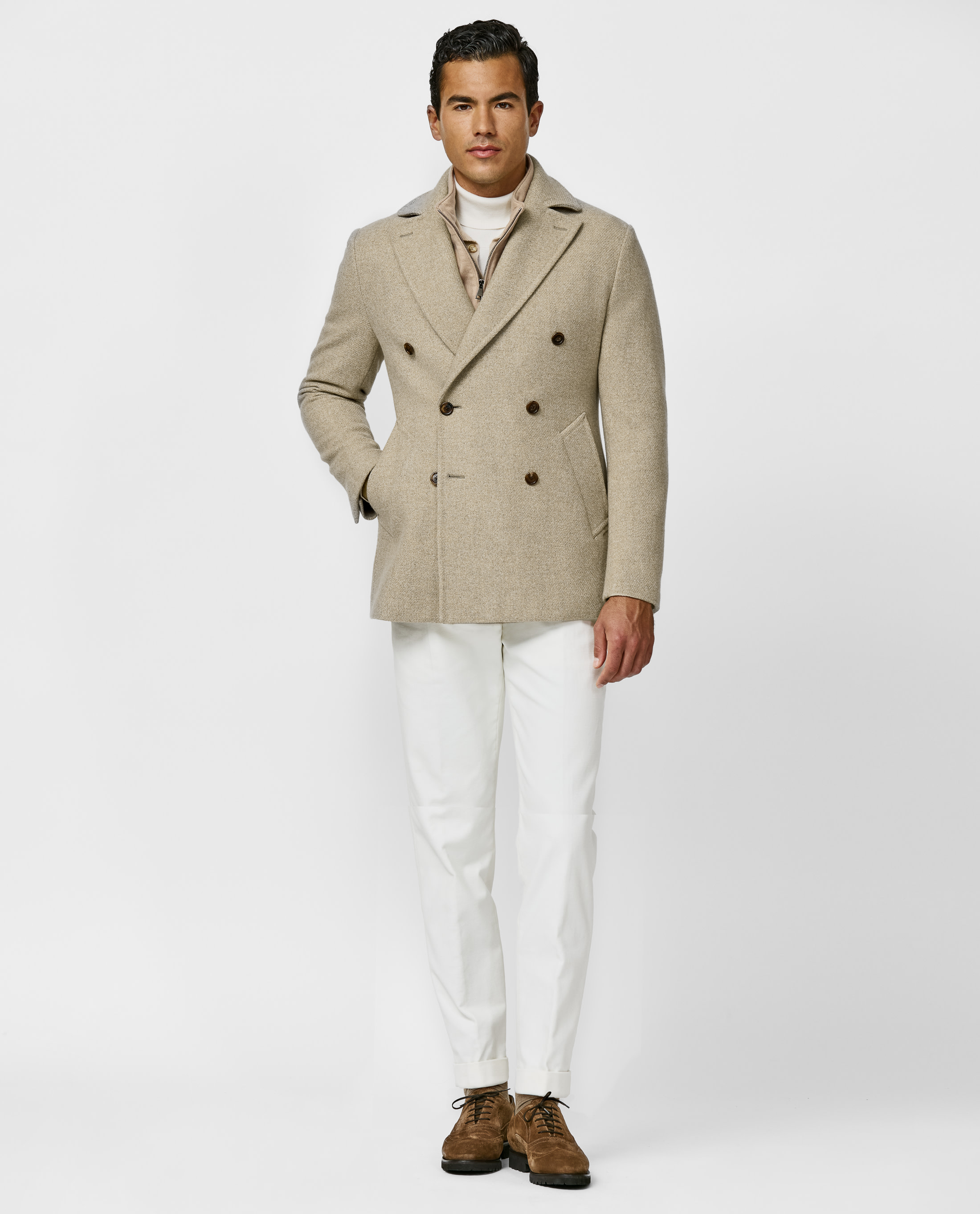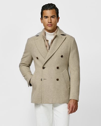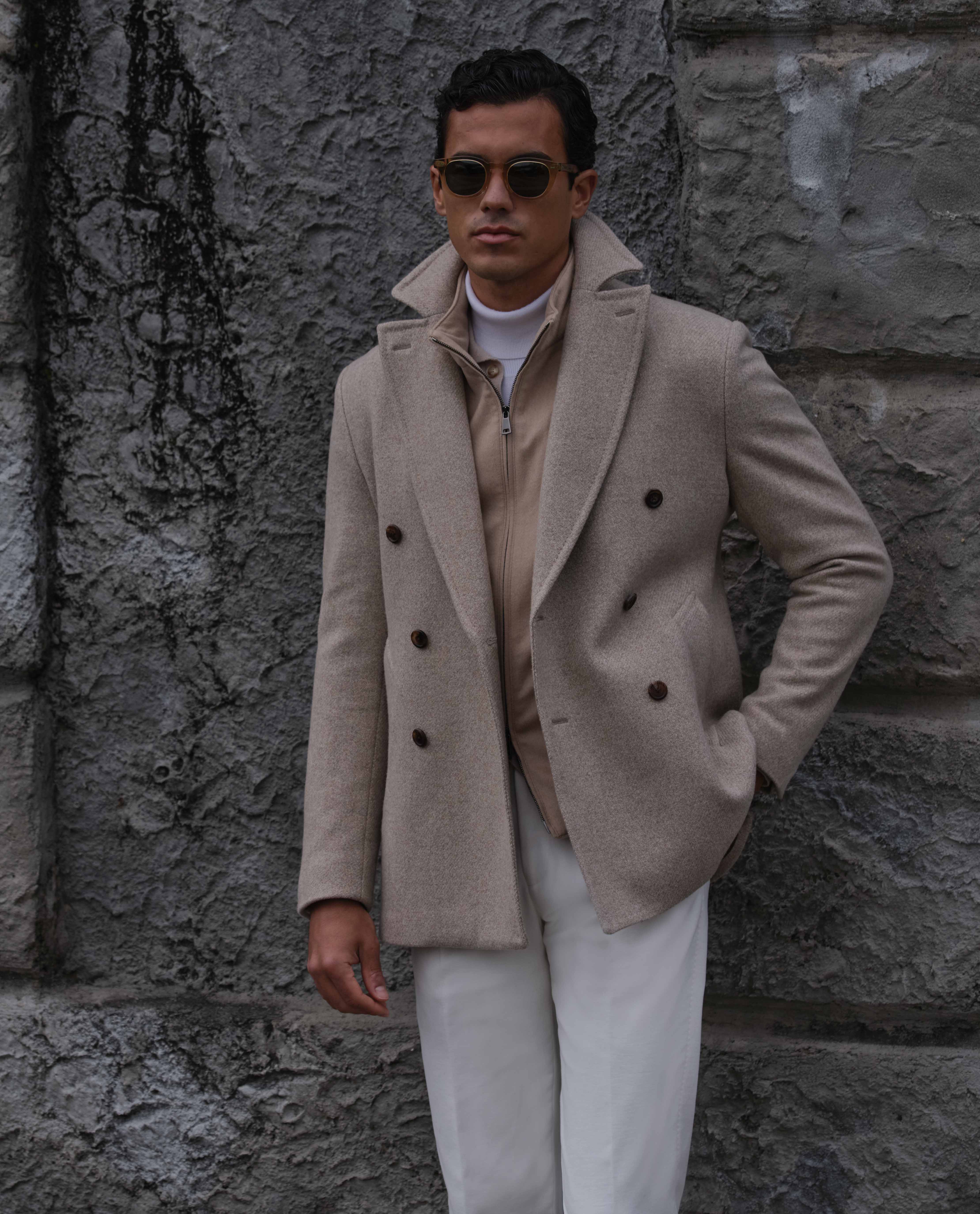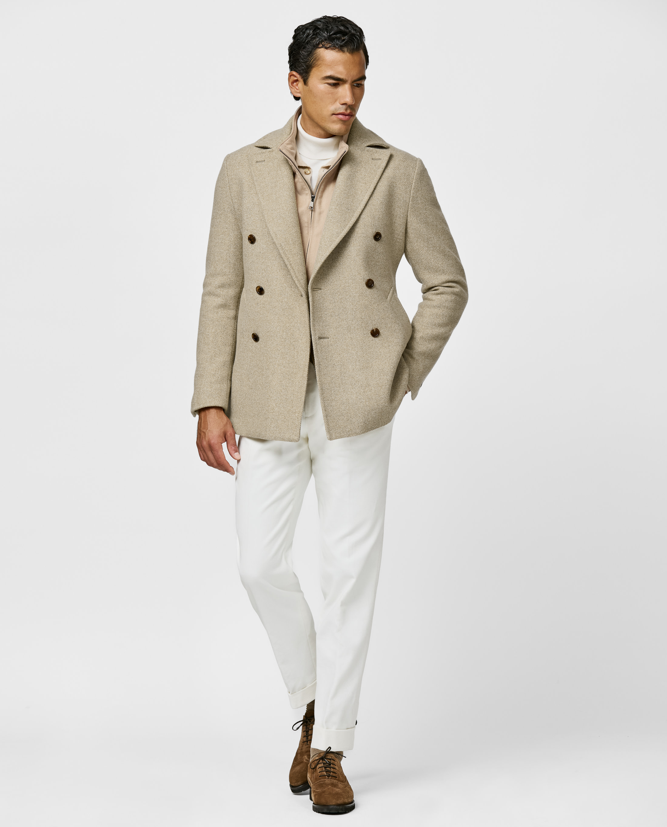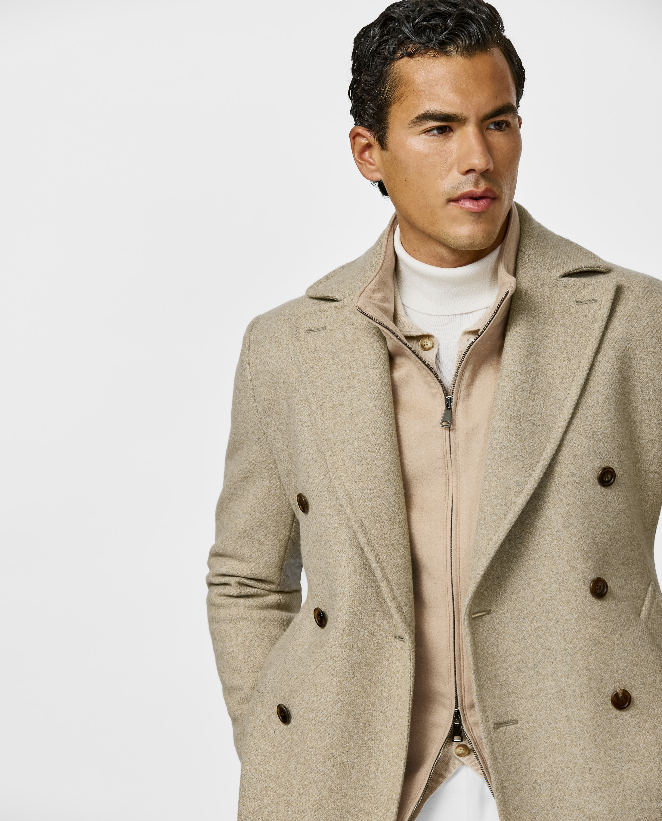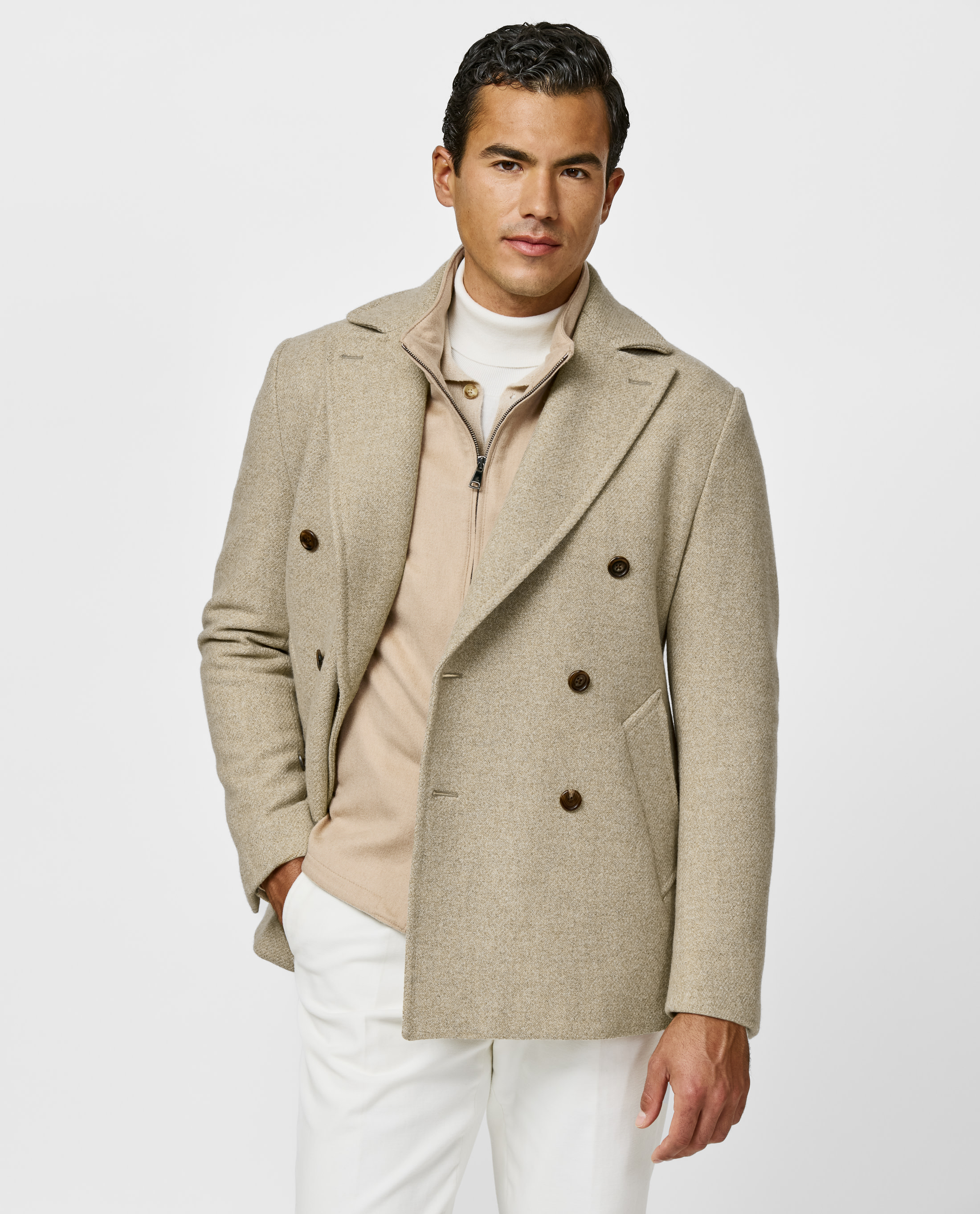 Cocoon yourself from the cold with this navy-inspired pea coat in sand. Made from a warm wool-cashmere blend with mélange yarns. The heavy twill is extra soft with extraordinary drape. Designed here with a double-breasted closure, peak lapels, and slanted welt pockets in a shorter length for easy movement. Make this coat your own with our many customization options to choose from.