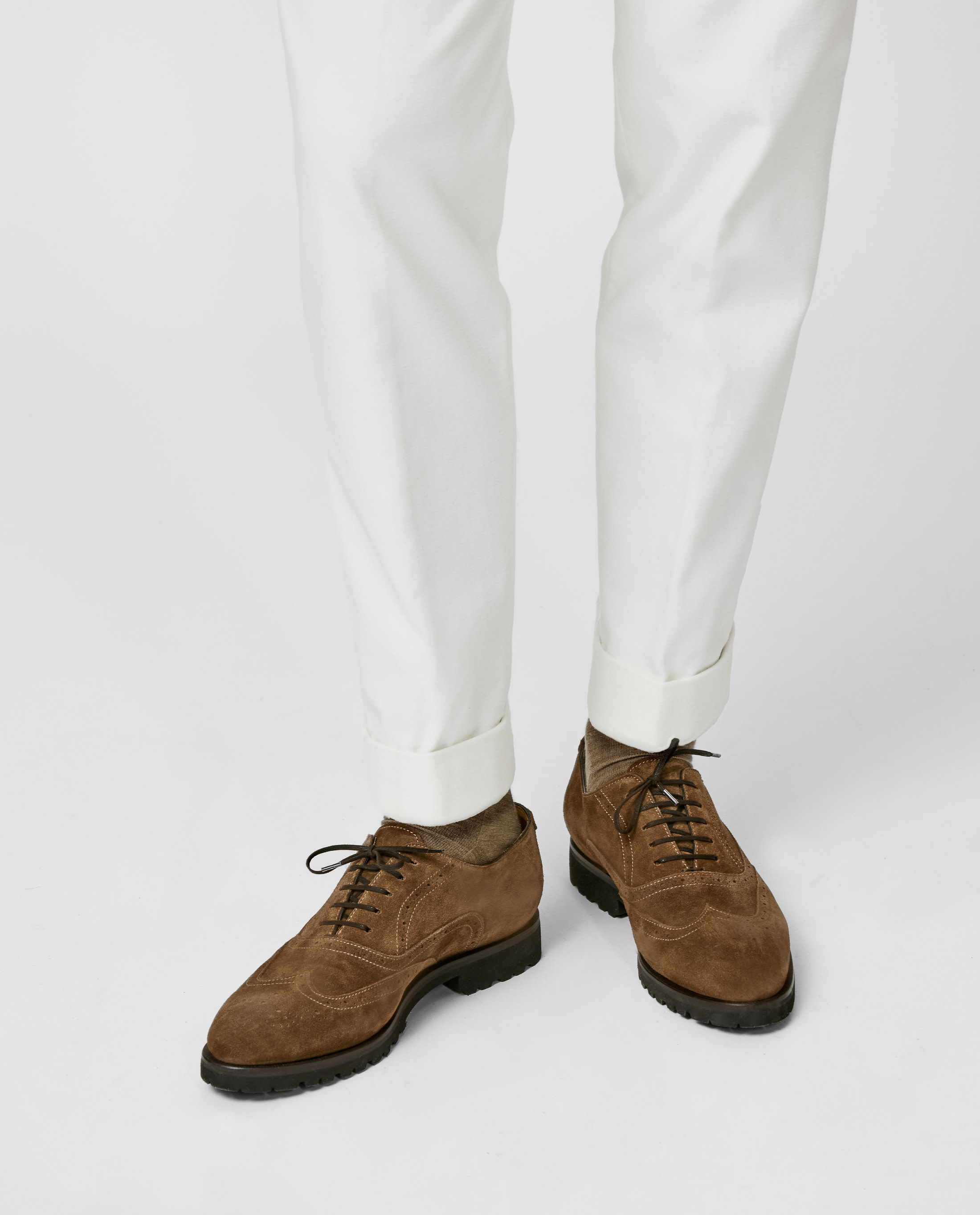 Balance formality with comfort with these lightweight Oxford shoes in chocolate brown. Handmade from flexible chrome-tanned calfskin, the light suede features a short nap for a touch of softness. Make these shoes your own with our many customization options to choose from. Handmade Light suede Calfskin leather Chrome tanned