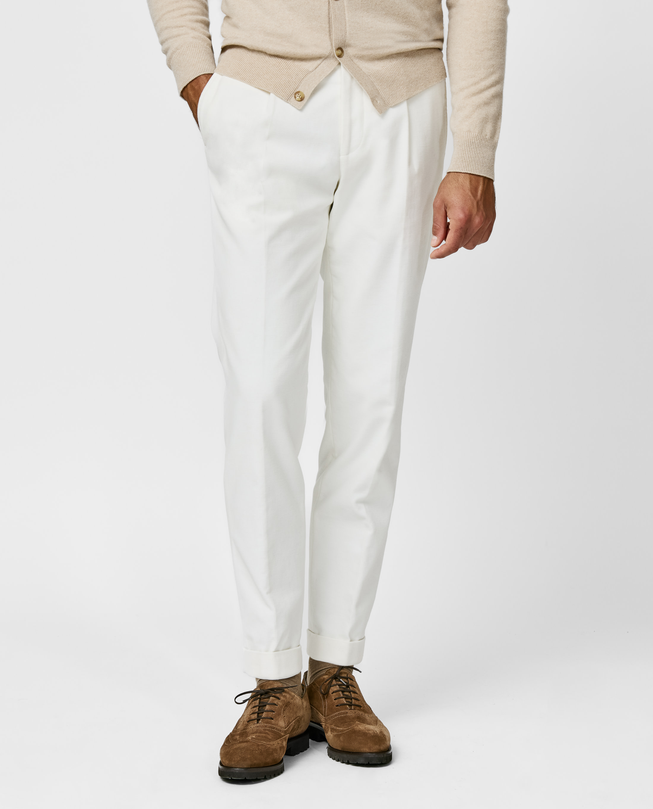 These off-white trousers are modern meets durable. Made from stretch moleskin cotton by Olimpias for a soft-yet-robust feel with a comfortable fit. Designed here with an extended waistband, single pleats, and a turn up. Make these trousers your own with our many customization options to choose from. Cotton blend Stretch Moleskin
