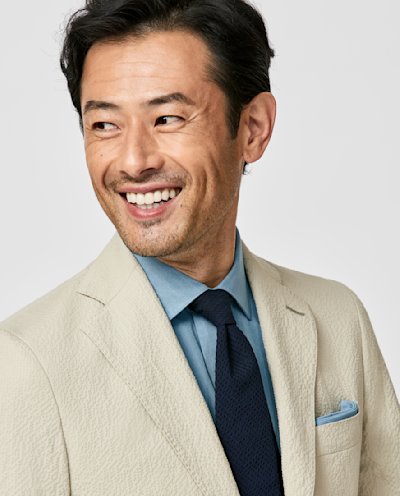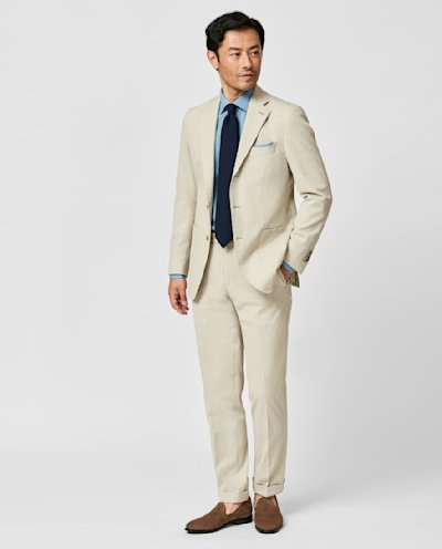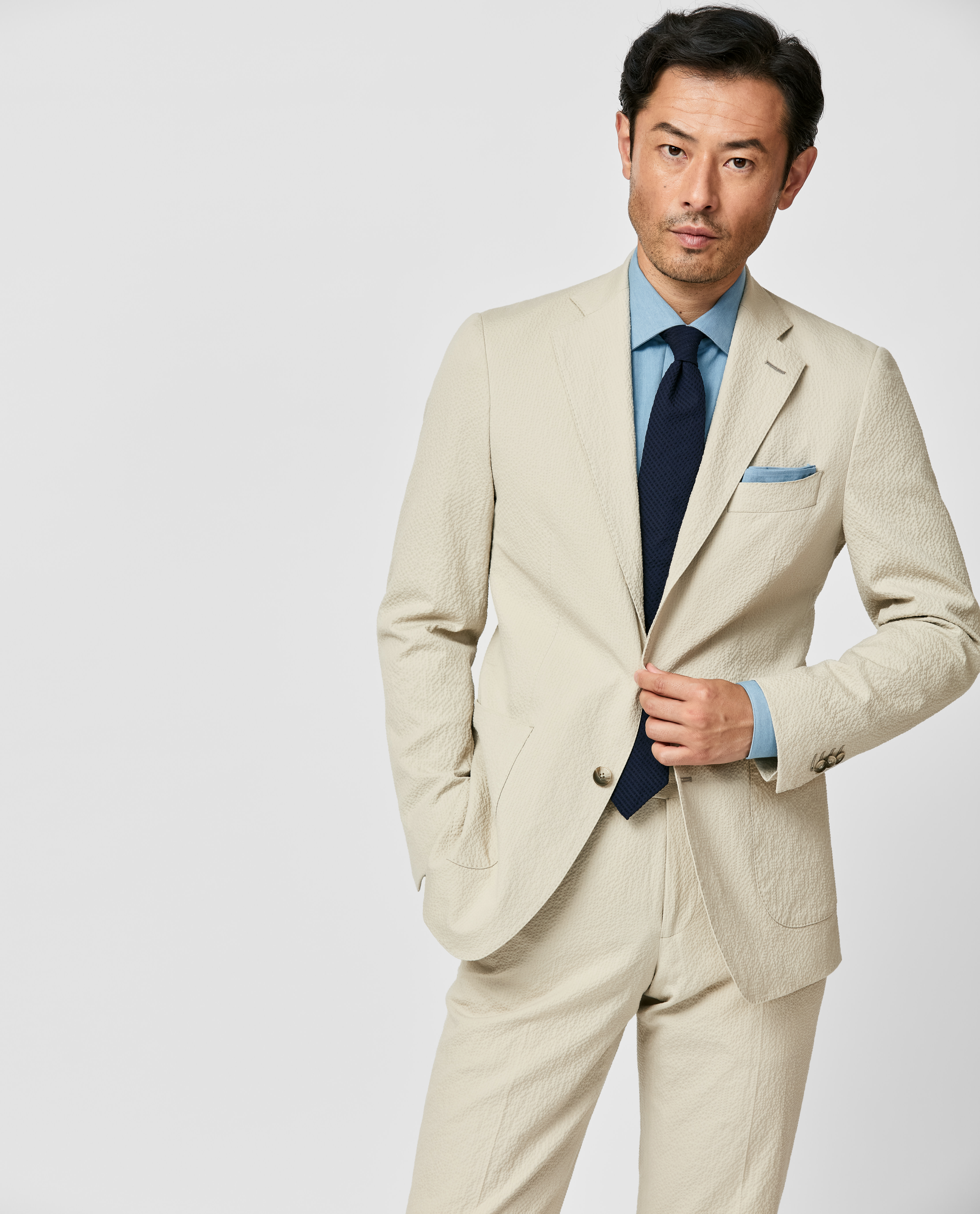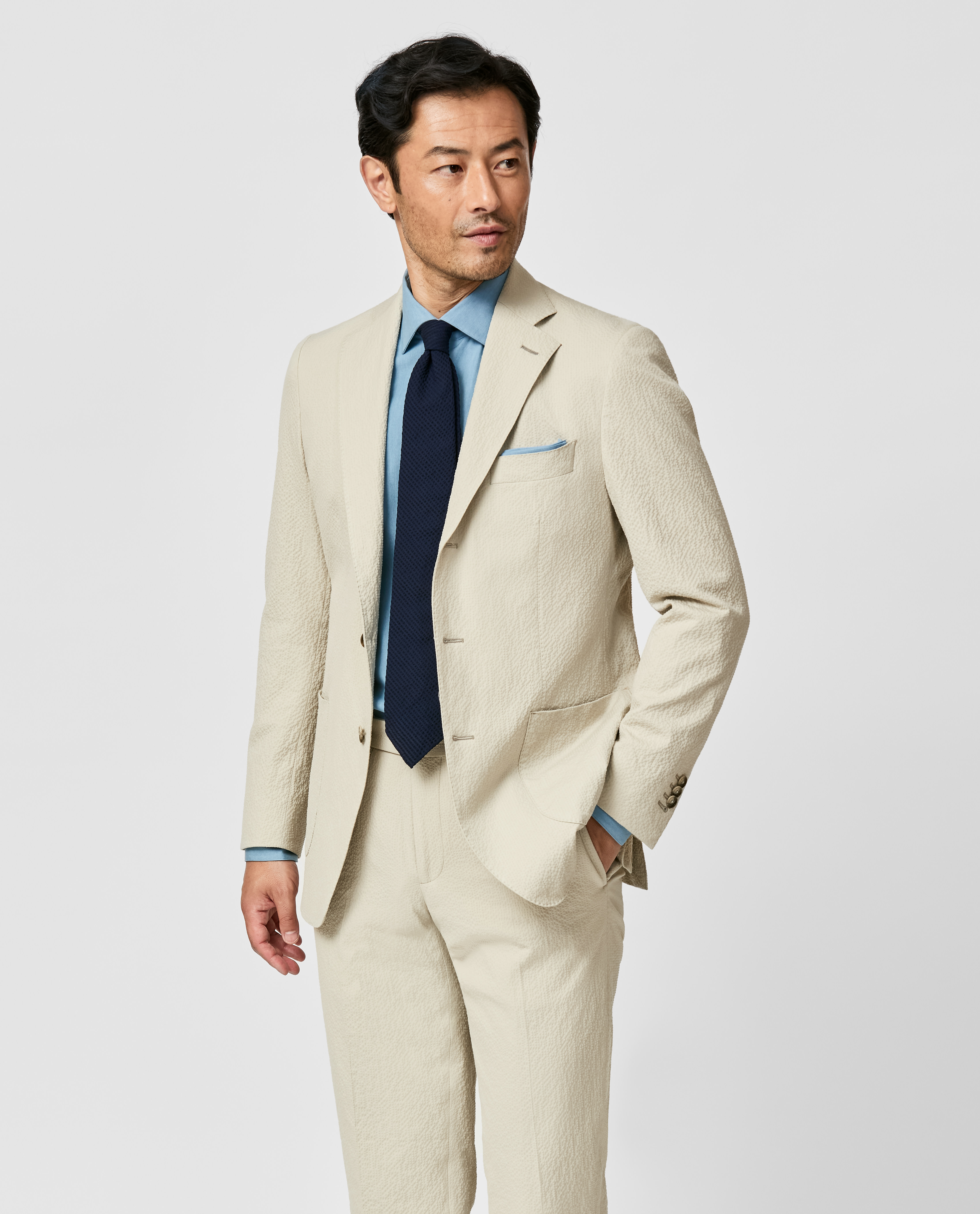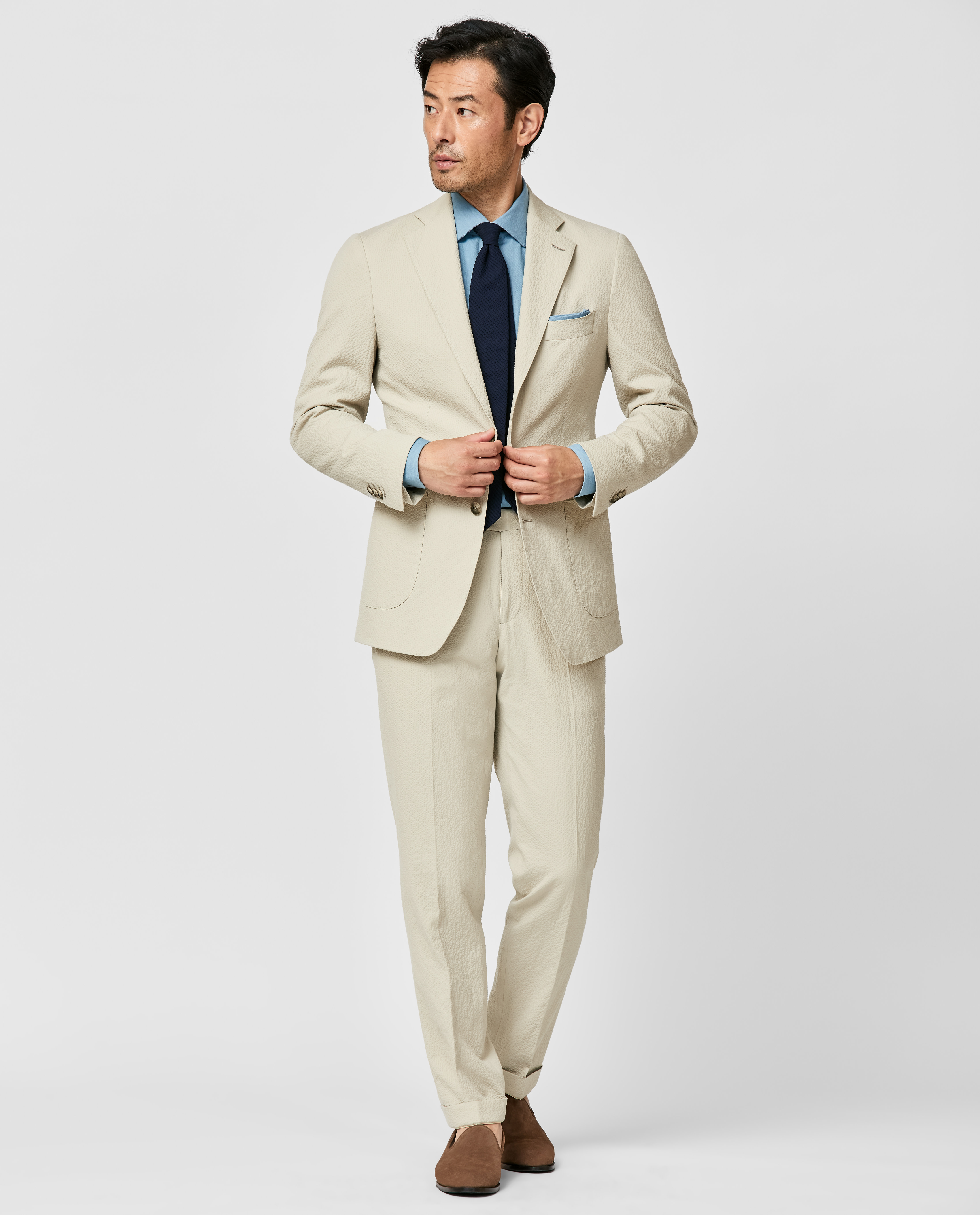 Crafted from cooling stretch cotton seersucker, prized for its distinctively puckered texture that enhances airflow, this sand-colored suit features a classic 2-button closure, patch side pockets, and flat-front trousers with turn ups. Pair it with your favorite denim shirt, tie, and summer loafers to create an effortless, smart-casual seasonal look. Prefer a different style? Every piece is made exclusively for you, with your choice of design options. Stretch cotton Seersucker Breathable Cooling