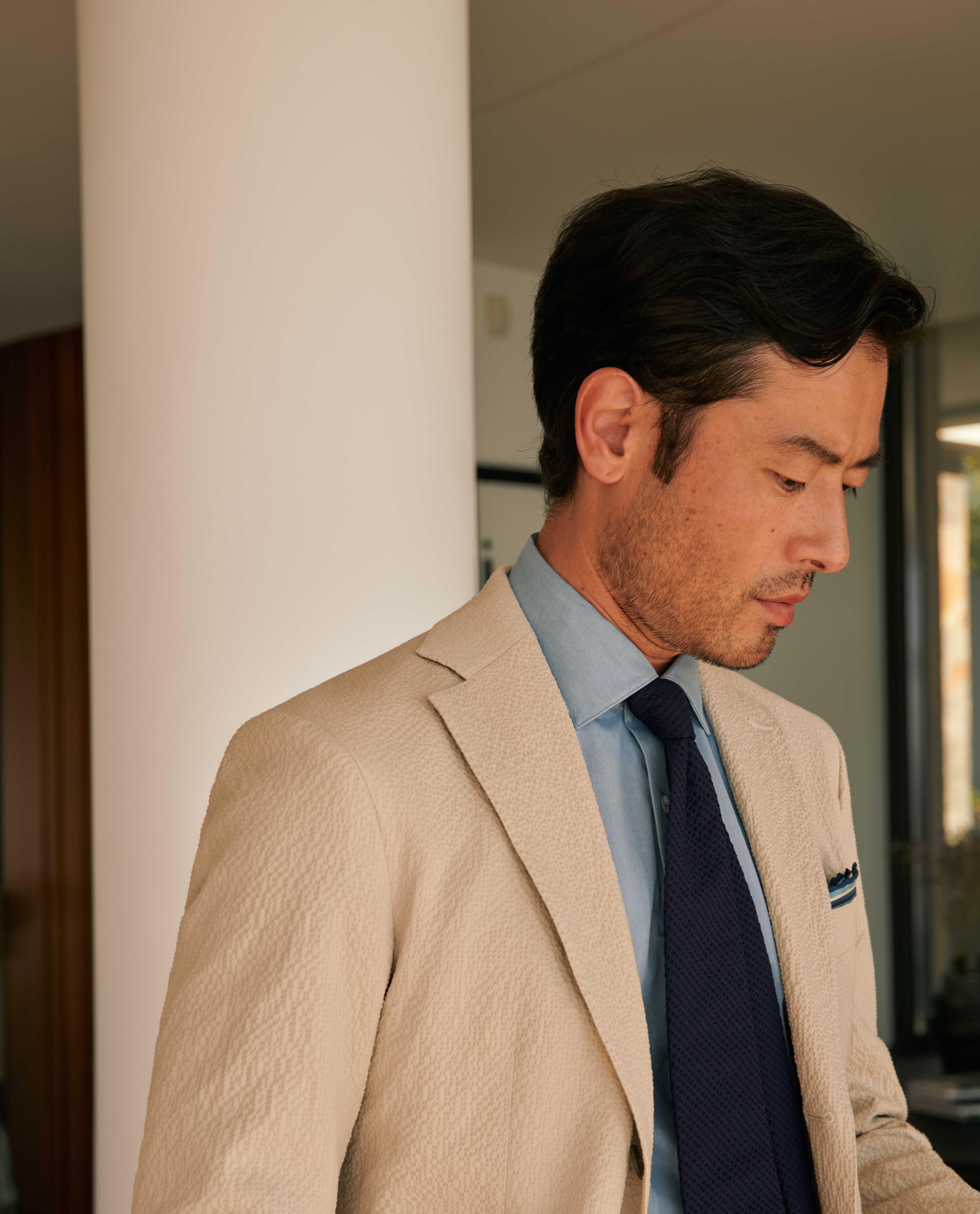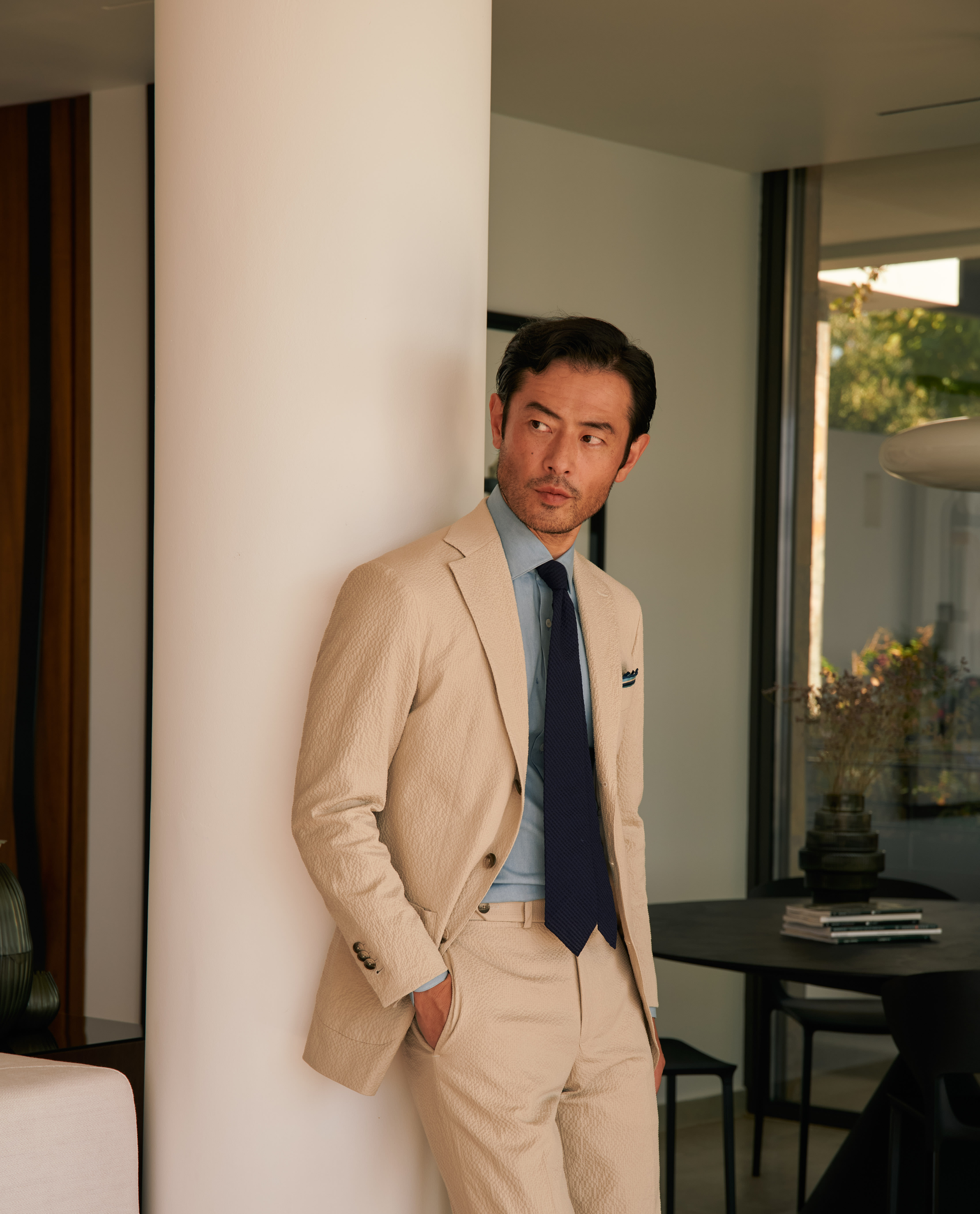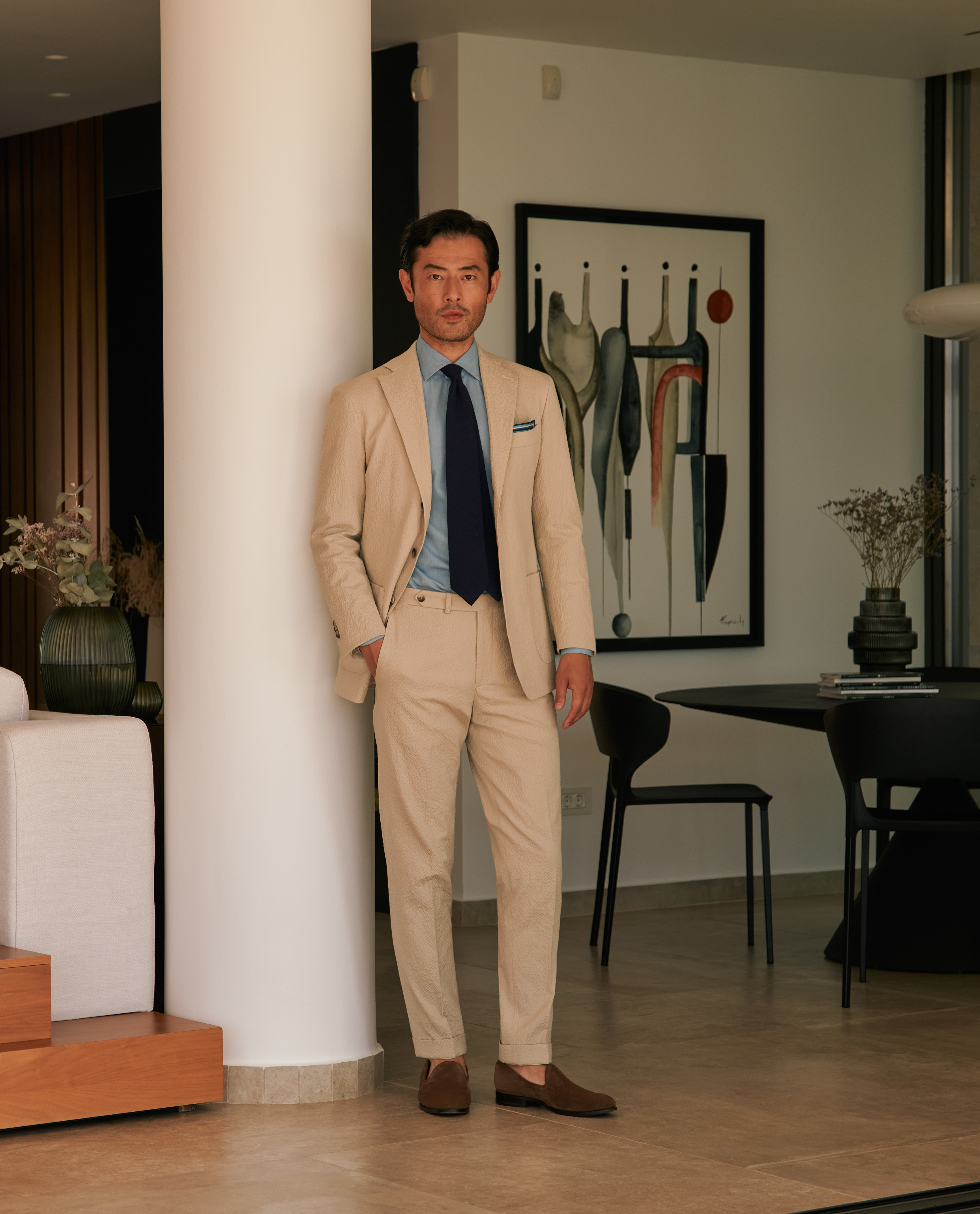 Polished yet breezy, just like summer should be, this sand seersucker suit moves effortlessly from formal events to casual Fridays. Styled here with a washed denim shirt, navy seersucker tie, and chocolate suede loafers. Swap the button-up for a t-shirt to create a more casual aesthetic.